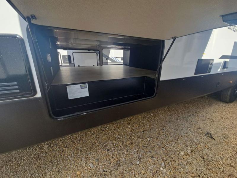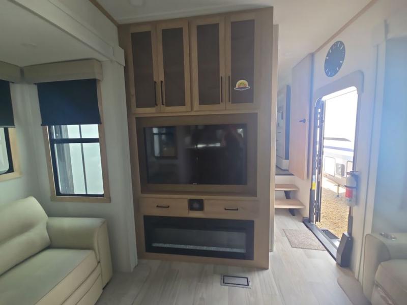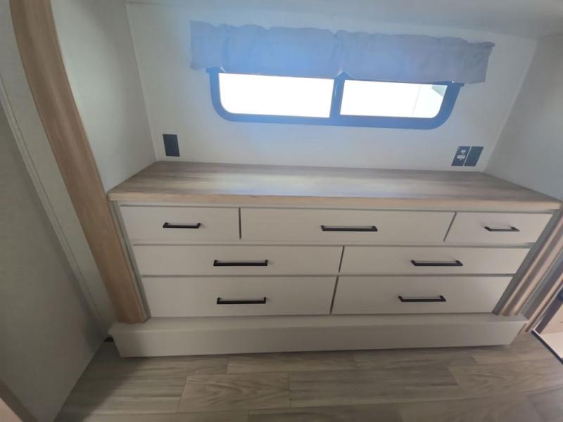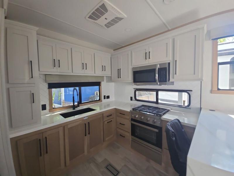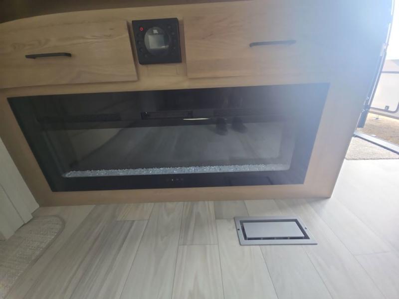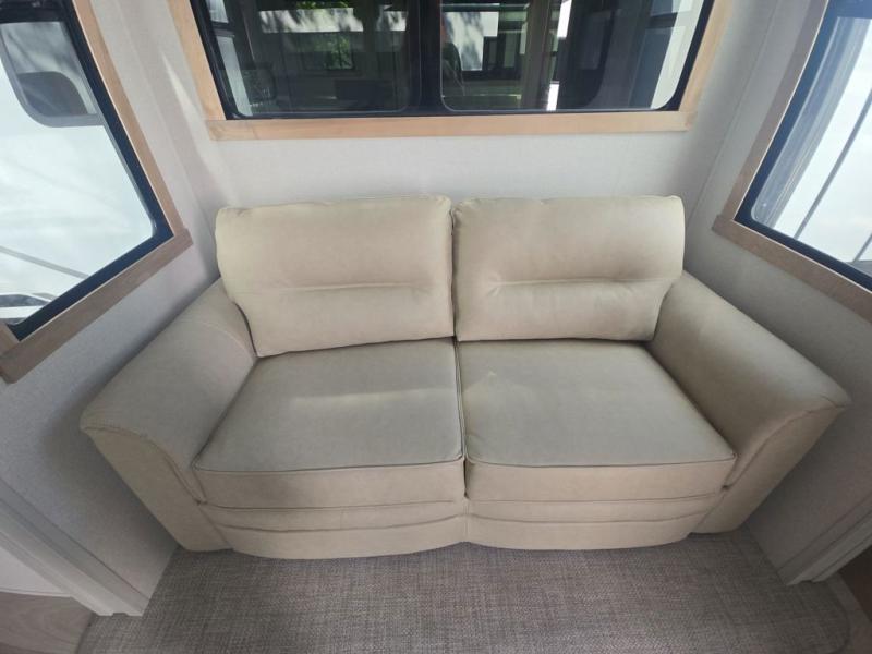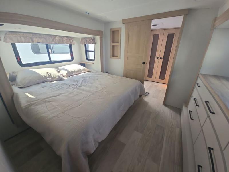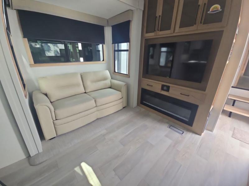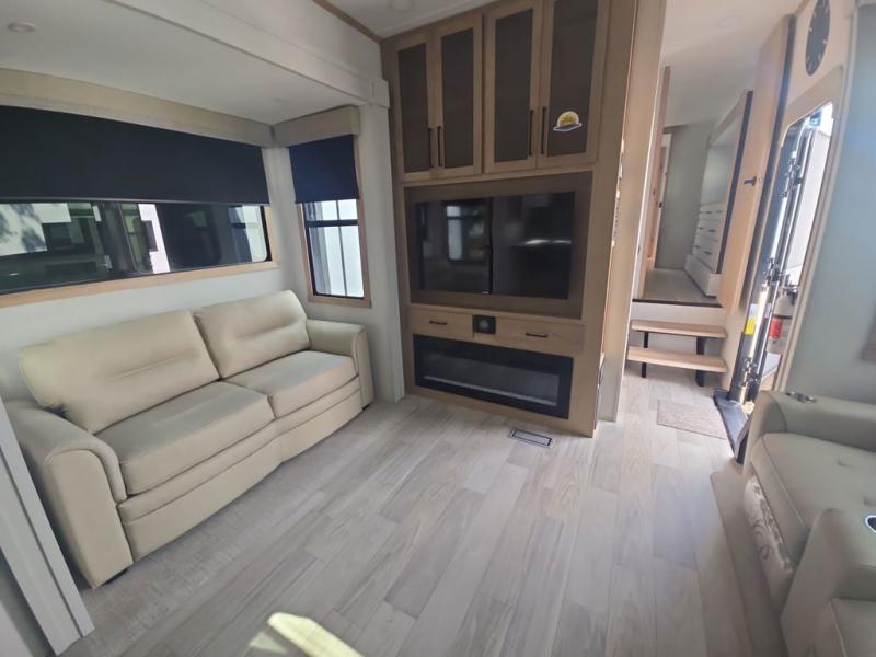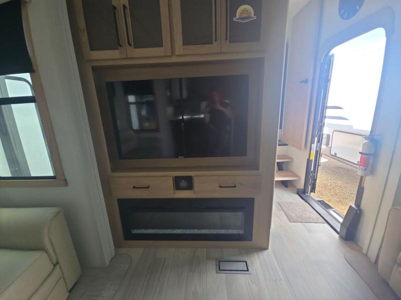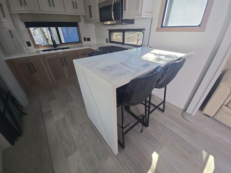 If you're looking to go full-time RVing, this fifth wheel is packed with convenient features! The master bedroom includes a king bed slide out with USB ports on either side of the bed so you both can charge your phones, and there is a dresser for your folded clothes. You will love the front bathroom with dual bath sinks, a shower with a seat, plus a walk-in closet with shelves, rods to hand clothes, and baskets for laundry! There is a unique middle utility room with washer and dryer, Washer and dryer counter and a rod to hang clothes that will make a perfect laundry room, or you can utilize this space for storage! Head to the main living area to relax on the theater seating or hide-a-bed sofa, and if you have guests stay over, they can sleep here. There is also an entertainment center with a 50" flat screen TV, but you might just leave that off if you're working at the desk with a chair that is provided. We've saved the best part for last; the kitchen! Here, you'll find ample counter space to prep home-cooked meals, a three burner high output range with a 22" oven, plus a large counter with barstools where you can enjoy breakfast at each morning. Choosing this fifth wheel is a no-brainer!