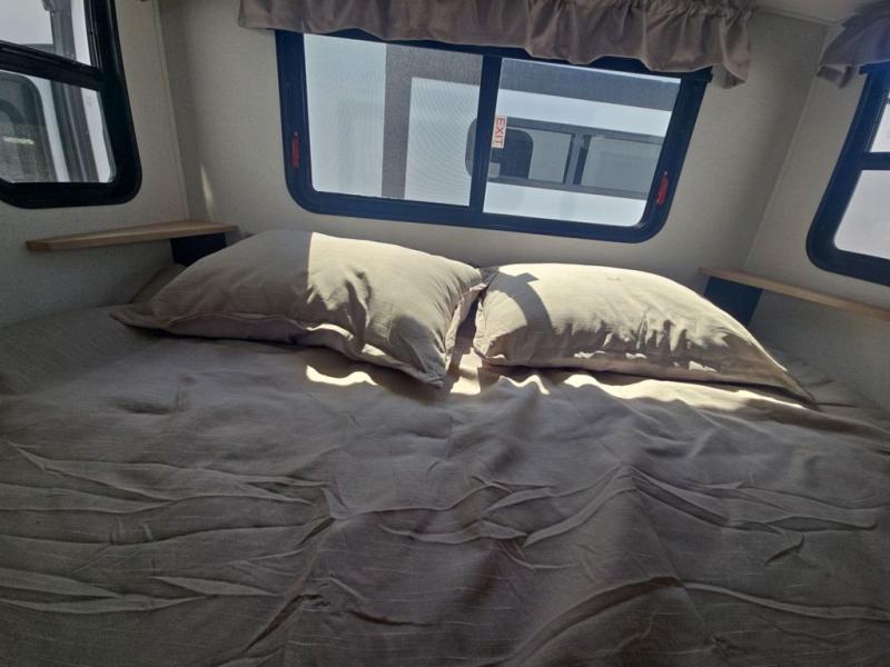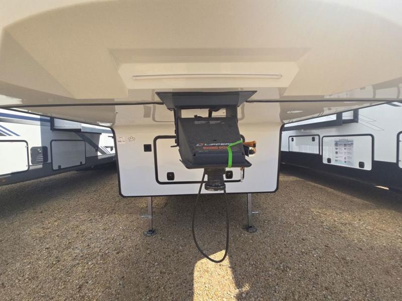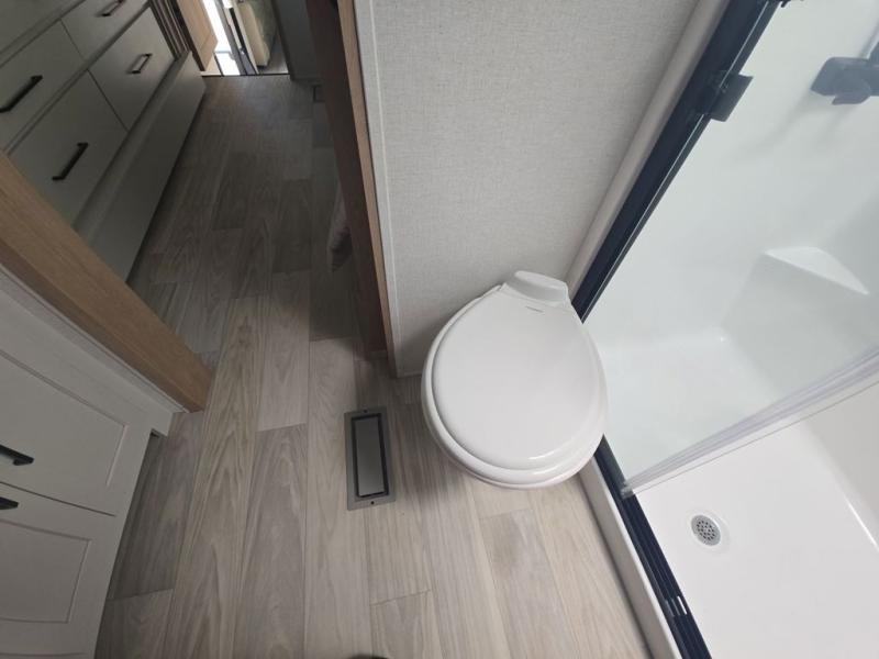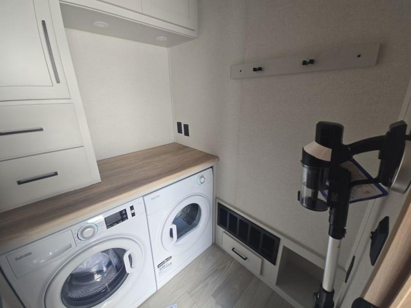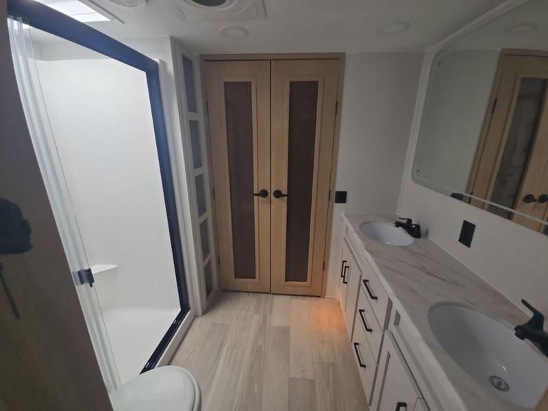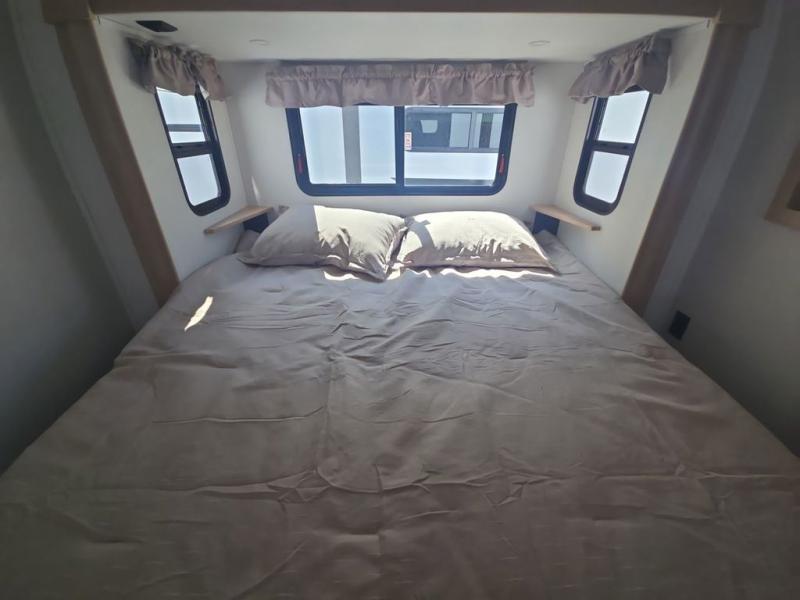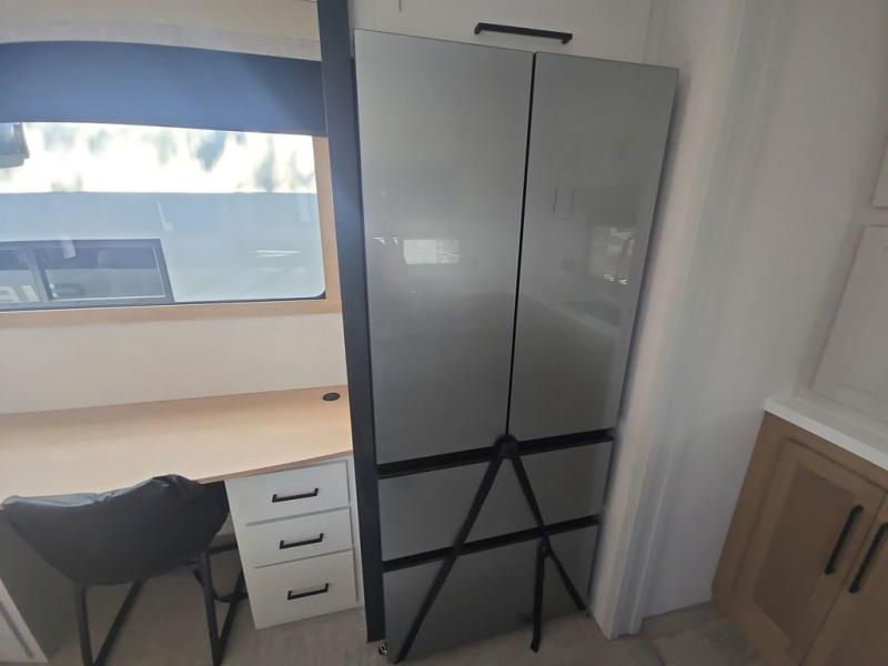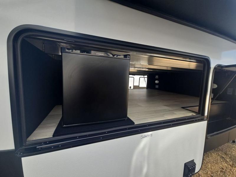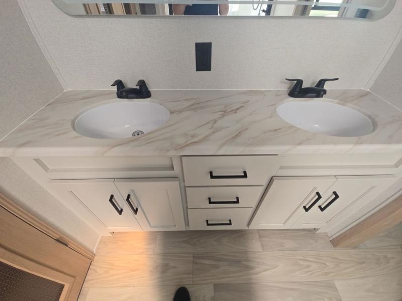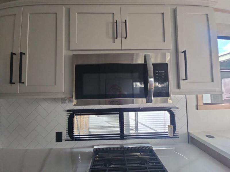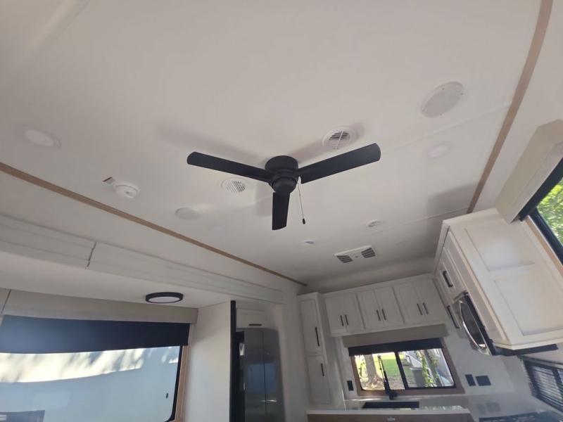 If you're looking to go full-time RVing, this fifth wheel is packed with convenient features! The master bedroom includes a king bed slide out with USB ports on either side of the bed so you both can charge your phones, and there is a dresser for your folded clothes. You will love the front bathroom with dual bath sinks, a shower with a seat, plus a walk-in closet with shelves, rods to hand clothes, and baskets for laundry! There is a unique middle utility room with washer and dryer, Washer and dryer counter and a rod to hang clothes that will make a perfect laundry room, or you can utilize this space for storage! Head to the main living area to relax on the theater seating or hide-a-bed sofa, and if you have guests stay over, they can sleep here. There is also an entertainment center with a 50" flat screen TV, but you might just leave that off if you're working at the desk with a chair that is provided. We've saved the best part for last; the kitchen! Here, you'll find ample counter space to prep home-cooked meals, a three burner high output range with a 22" oven, plus a large counter with barstools where you can enjoy breakfast at each morning. Choosing this fifth wheel is a no-brainer!