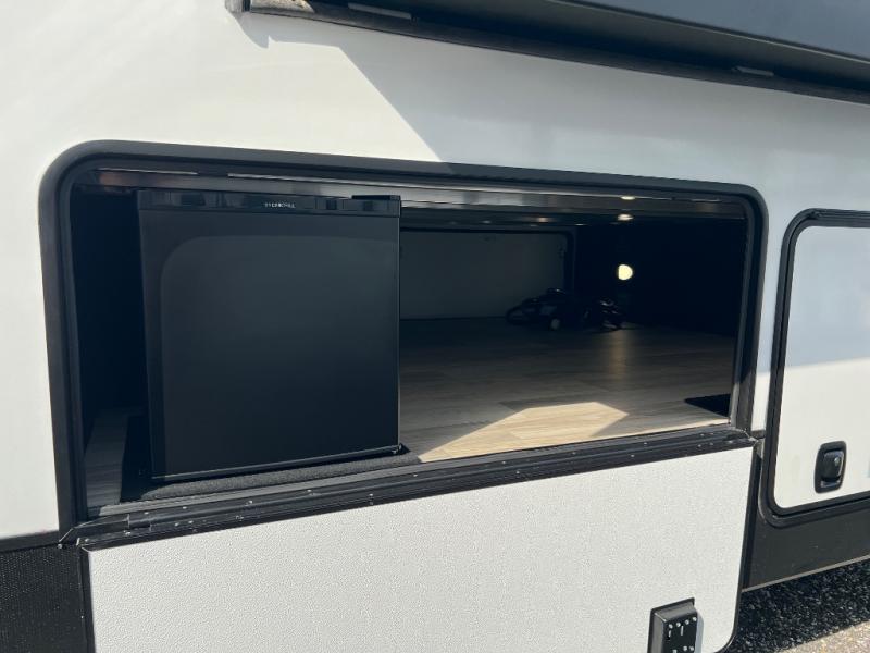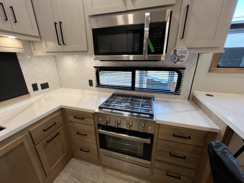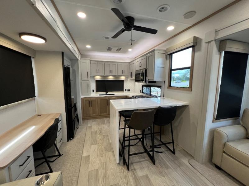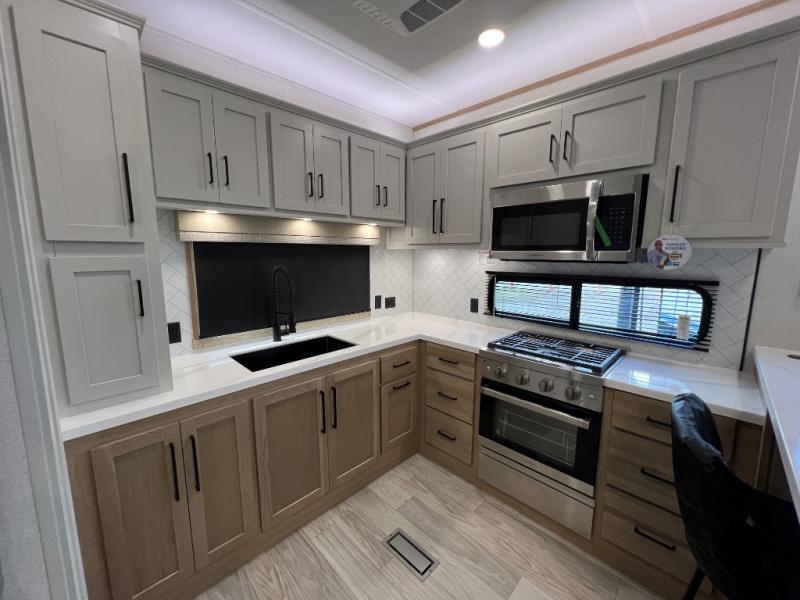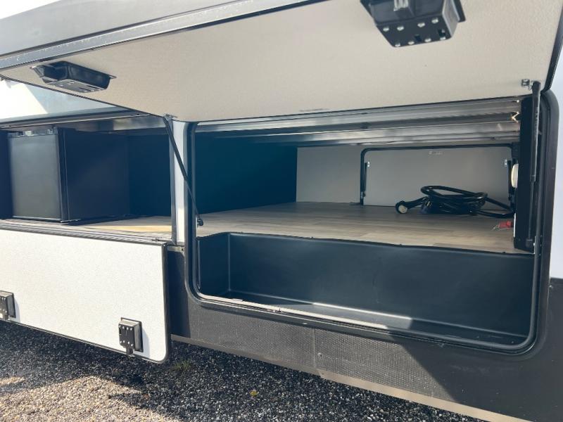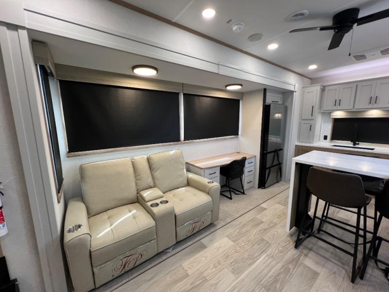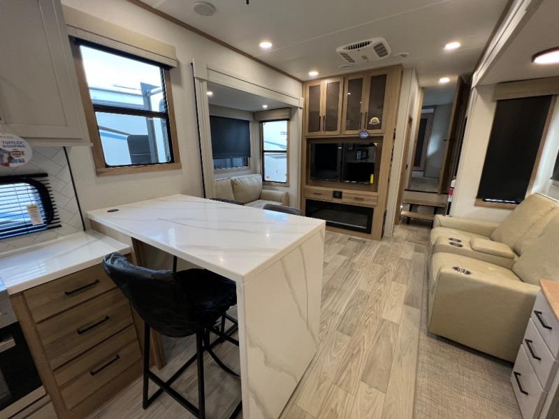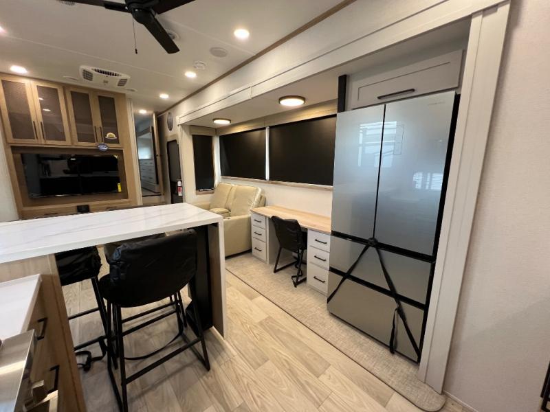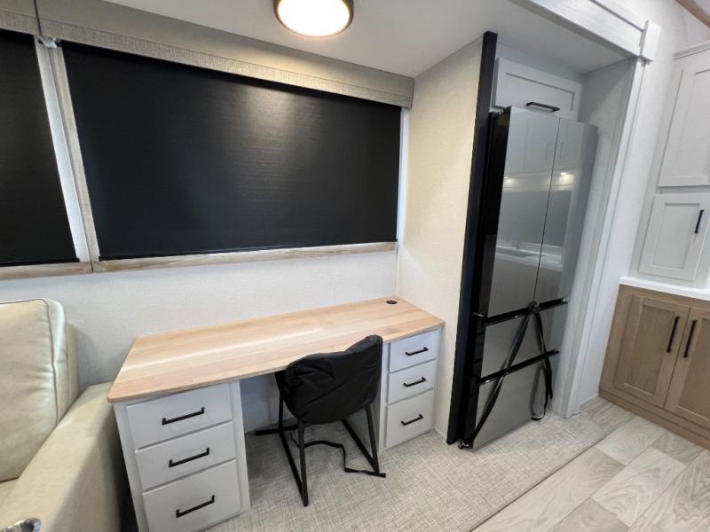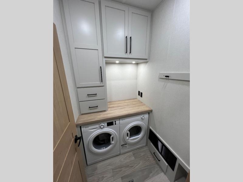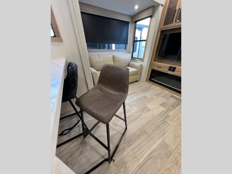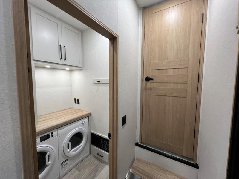 If you're looking to go full-time RVing, this fifth wheel is packed with convenient features! The master bedroom includes a king bed slide out with USB ports on either side of the bed so you both can charge your phones, and there is a dresser for your folded clothes. You will love the front bathroom with dual bath sinks, a shower with a seat, plus a walk-in closet with shelves, rods to hand clothes, and baskets for laundry! There is a unique middle utility room with washer and dryer, Washer and dryer counter and a rod to hang clothes that will make a perfect laundry room, or you can utilize this space for storage! Head to the main living area to relax on the theater seating or hide-a-bed sofa, and if you have guests stay over, they can sleep here. There is also an entertainment center with a 50" flat screen TV, but you might just leave that off if you're working at the desk with a chair that is provided. We've saved the best part for last; the kitchen! Here, you'll find ample counter space to prep home-cooked meals, a three burner high output range with a 22" oven, plus a large counter with barstools where you can enjoy breakfast at each morning. Choosing this fifth wheel is a no-brainer!
