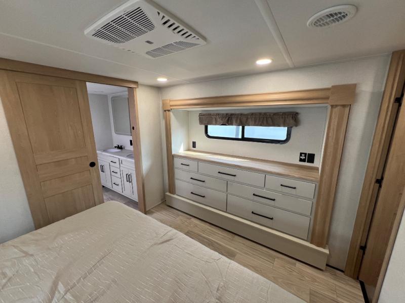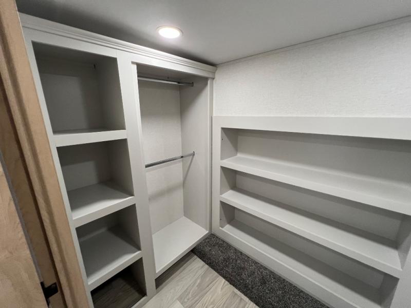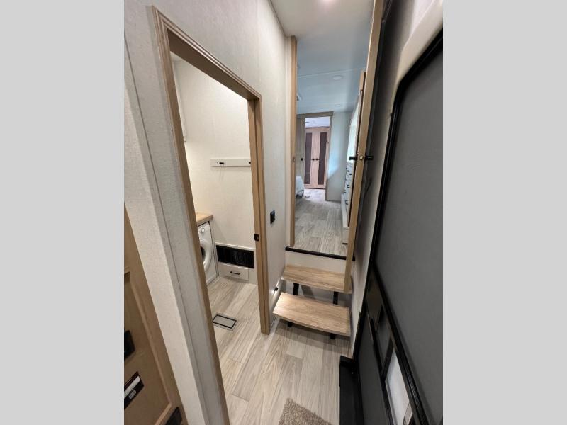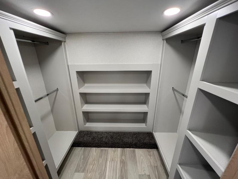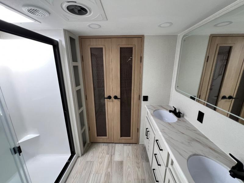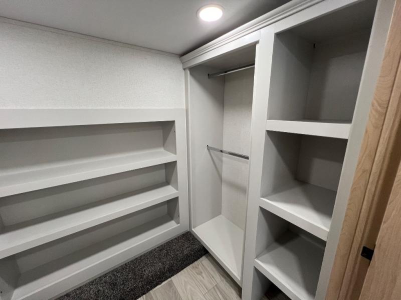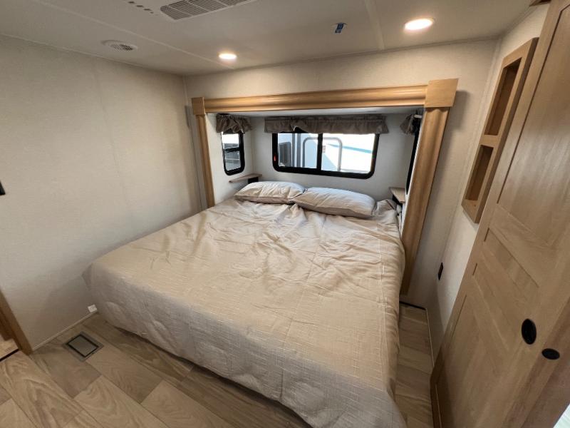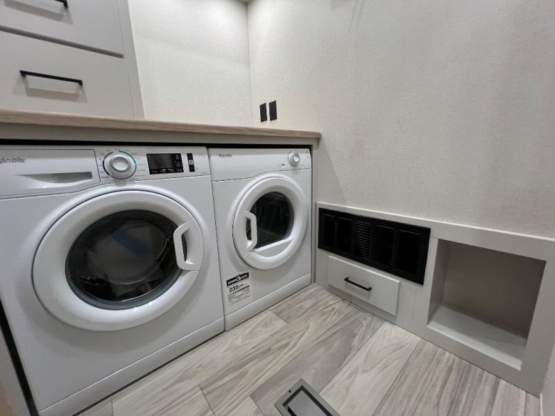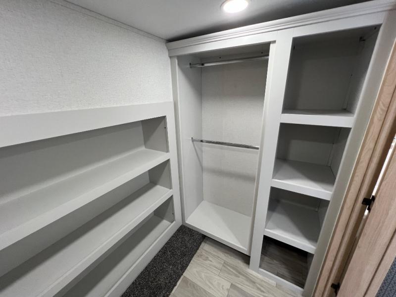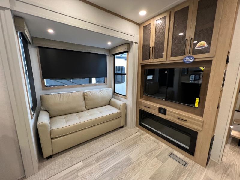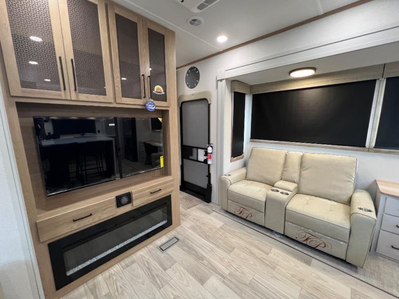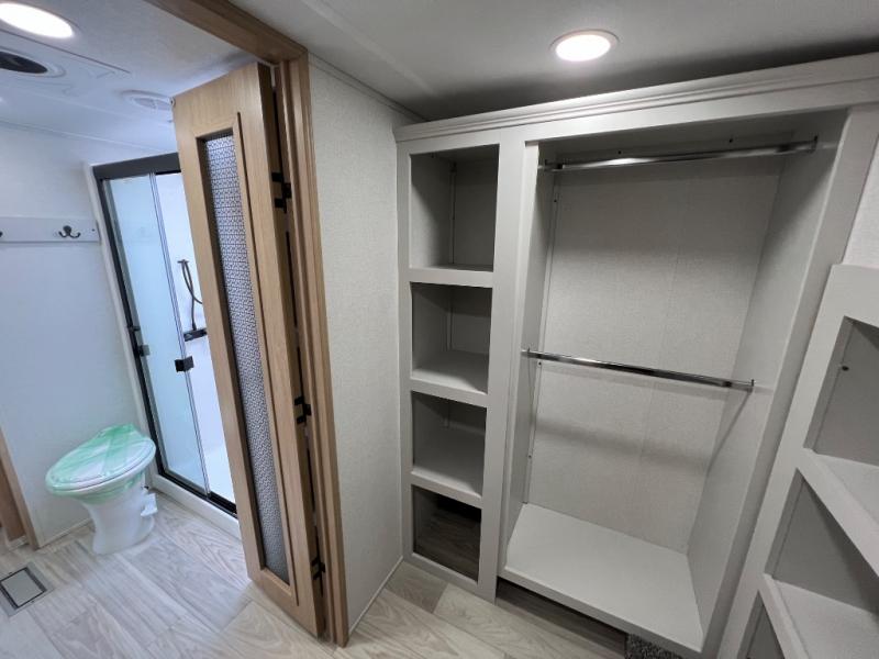 If you're looking to go full-time RVing, this fifth wheel is packed with convenient features! The master bedroom includes a king bed slide out with USB ports on either side of the bed so you both can charge your phones, and there is a dresser for your folded clothes. You will love the front bathroom with dual bath sinks, a shower with a seat, plus a walk-in closet with shelves, rods to hand clothes, and baskets for laundry! There is a unique middle utility room with washer and dryer, Washer and dryer counter and a rod to hang clothes that will make a perfect laundry room, or you can utilize this space for storage! Head to the main living area to relax on the theater seating or hide-a-bed sofa, and if you have guests stay over, they can sleep here. There is also an entertainment center with a 50" flat screen TV, but you might just leave that off if you're working at the desk with a chair that is provided. We've saved the best part for last; the kitchen! Here, you'll find ample counter space to prep home-cooked meals, a three burner high output range with a 22" oven, plus a large counter with barstools where you can enjoy breakfast at each morning. Choosing this fifth wheel is a no-brainer!