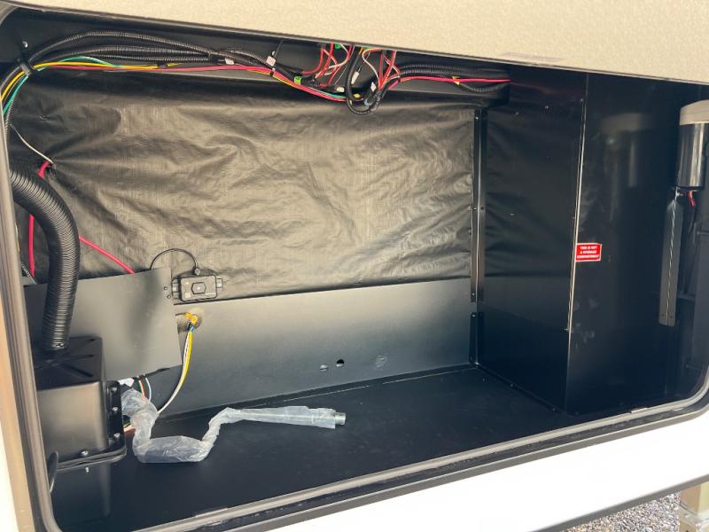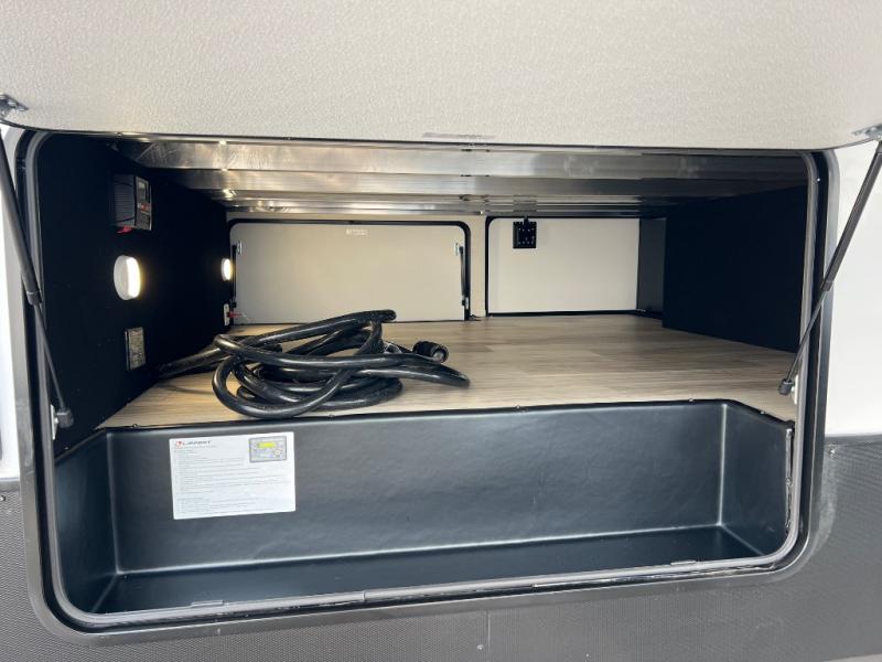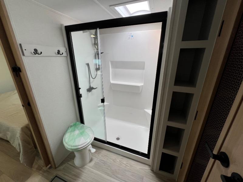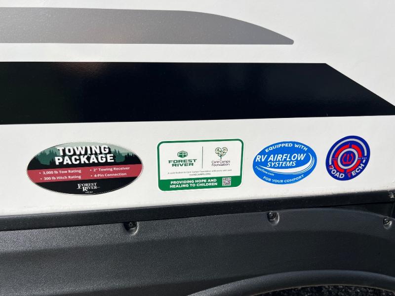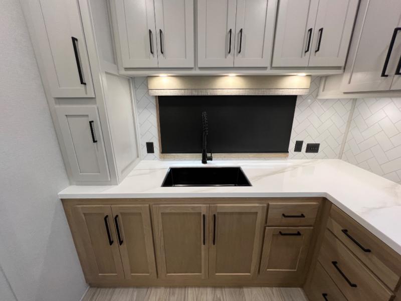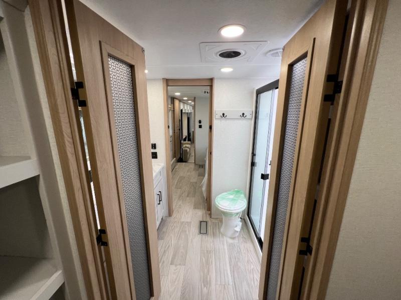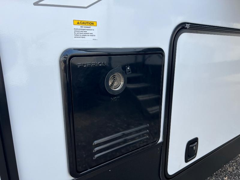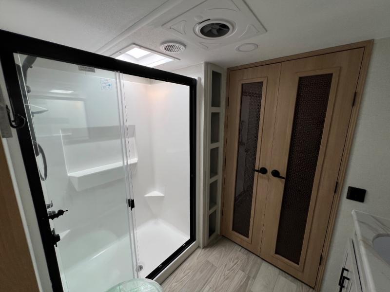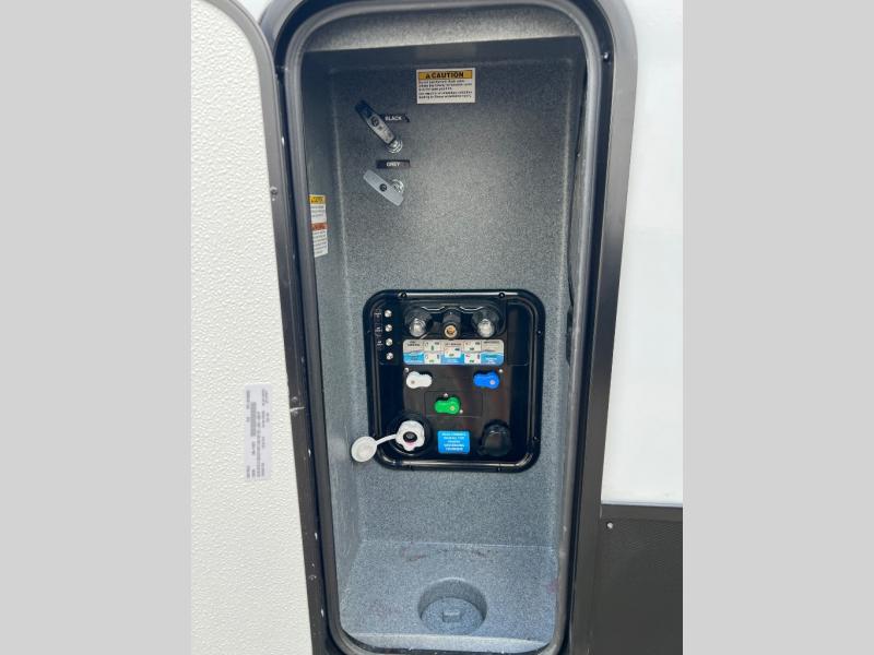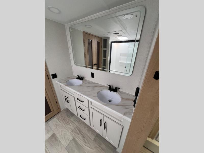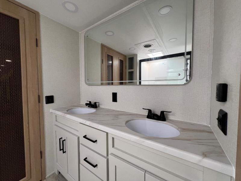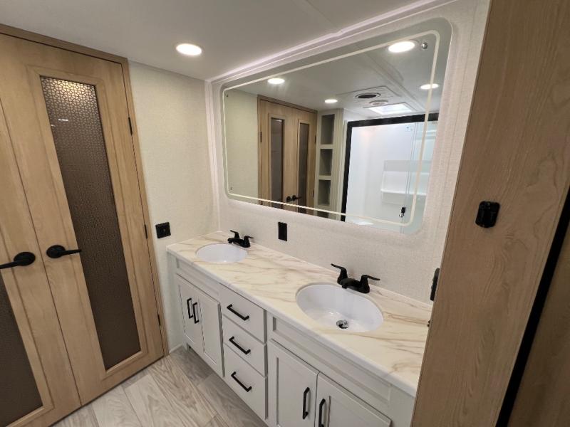 If you're looking to go full-time RVing, this fifth wheel is packed with convenient features! The master bedroom includes a king bed slide out with USB ports on either side of the bed so you both can charge your phones, and there is a dresser for your folded clothes. You will love the front bathroom with dual bath sinks, a shower with a seat, plus a walk-in closet with shelves, rods to hand clothes, and baskets for laundry! There is a unique middle utility room with washer and dryer, Washer and dryer counter and a rod to hang clothes that will make a perfect laundry room, or you can utilize this space for storage! Head to the main living area to relax on the theater seating or hide-a-bed sofa, and if you have guests stay over, they can sleep here. There is also an entertainment center with a 50" flat screen TV, but you might just leave that off if you're working at the desk with a chair that is provided. We've saved the best part for last; the kitchen! Here, you'll find ample counter space to prep home-cooked meals, a three burner high output range with a 22" oven, plus a large counter with barstools where you can enjoy breakfast at each morning. Choosing this fifth wheel is a no-brainer!
