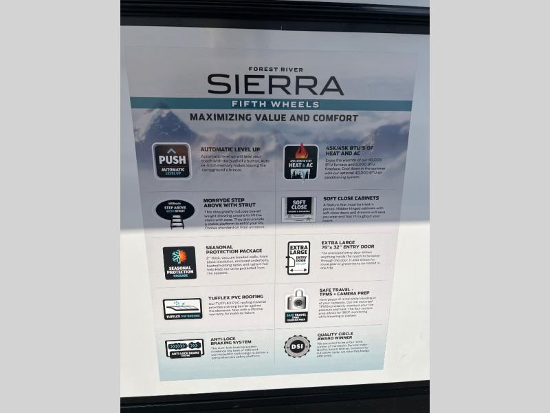 Each one of these Forest River Sierra fifth wheels are equipped with everything you need to make the most of each adventure! The underbelly armor will protect your unit's vitals from road debris and the painted two tone aerodynamic fiberglass front cap has an improved turning radius to make them easier to navigate. With an electric leveling system, you can set your unit up quick and easy then get to having fun faster than ever. The welded aluminum framed, vacuum bonded laminated superstructure will hold up through every adventure and the cambered powder coated frame comes with rust prohibitor to last longer. Each model also includes the Summit Package that comes with a king Wi-Fi extender system and Olympus antenna, a full coach water filter system, Goodyear tires with 7,000 lb. axles, and the list goes on. The interior is just as impressive with rustic wood plank linoleum, recessed residential lighting, a memory foam mattress, and mocha accent crown molding over the kitchen cabinets!