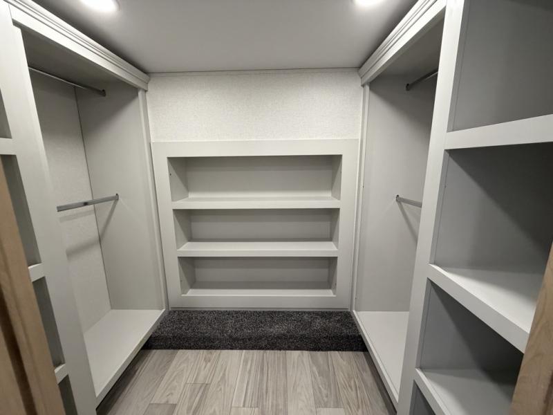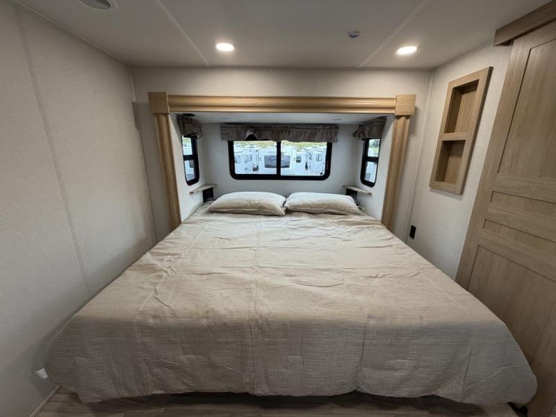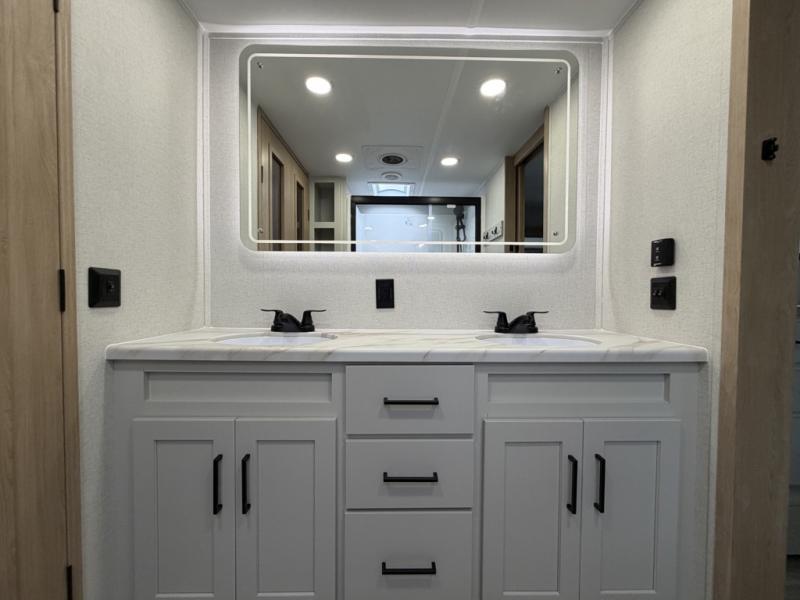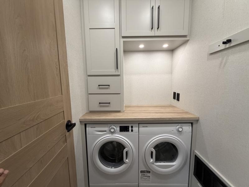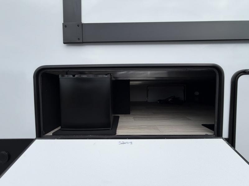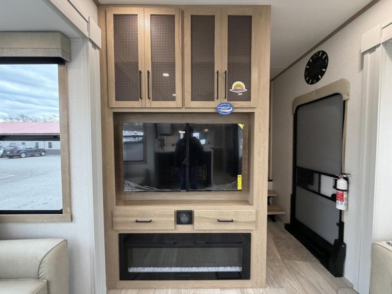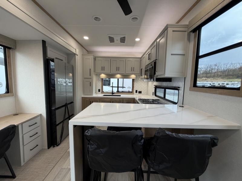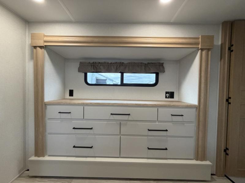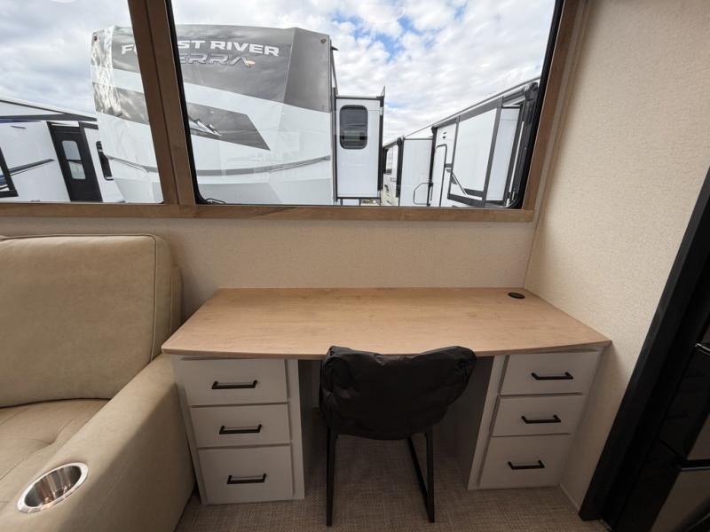 This fifth wheel is packed with convenient features to make your travels more comfortable and enjoyable! The master bedroom includes a king bed slide out with USB ports on either side of the bed so you both can charge your phones, and there is a dresser for your folded clothes. You will love the front bathroom with dual bath sinks, a fiberglass one-piece shower, plus a walk-in closet with shelves and rods to hang clothes! There is a unique middle utility room with washer and dryer prep if you want to add these, a Washer and dryer counter and a rod to hang clothes that will make a perfect laundry room, or you can utilize this space for storage! Head to the main living area to relax on the theater seating or hide-a-bed sofa, and if you have guests stay over, they can sleep here. There is also an entertainment center with a 50" flat screen TV, but you might just leave that off if you're working at the desk with a chair that is provided. We've saved the best part for last, the kitchen! Here, you'll find ample counter space to prep home-cooked meals, a three-burner range with a 24" oven, plus a large counter with barstools where you can enjoy breakfast at each morning. Choosing this fifth wheel is a no-brainer!