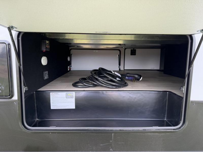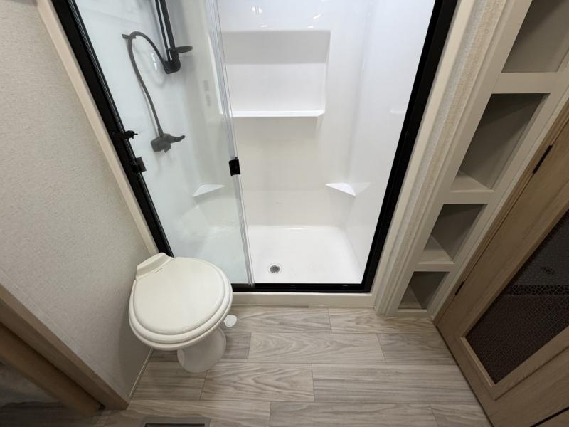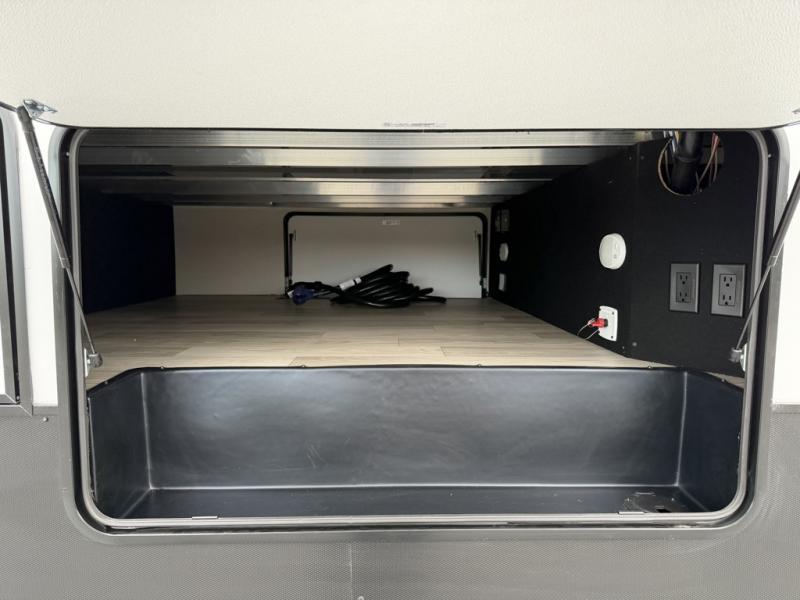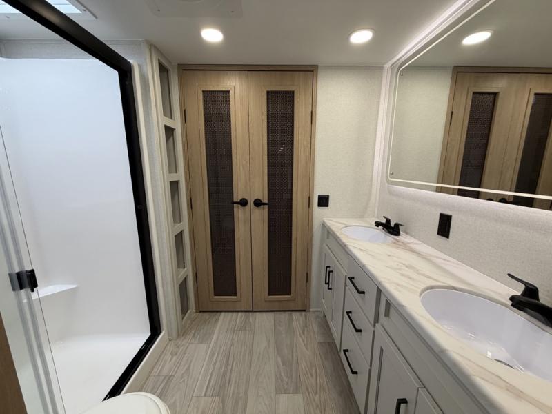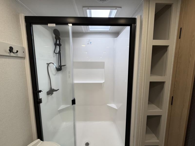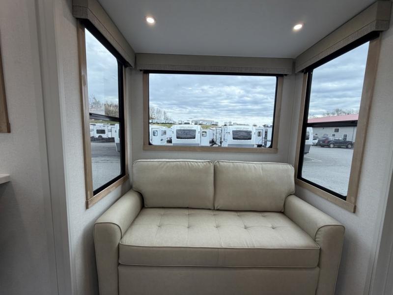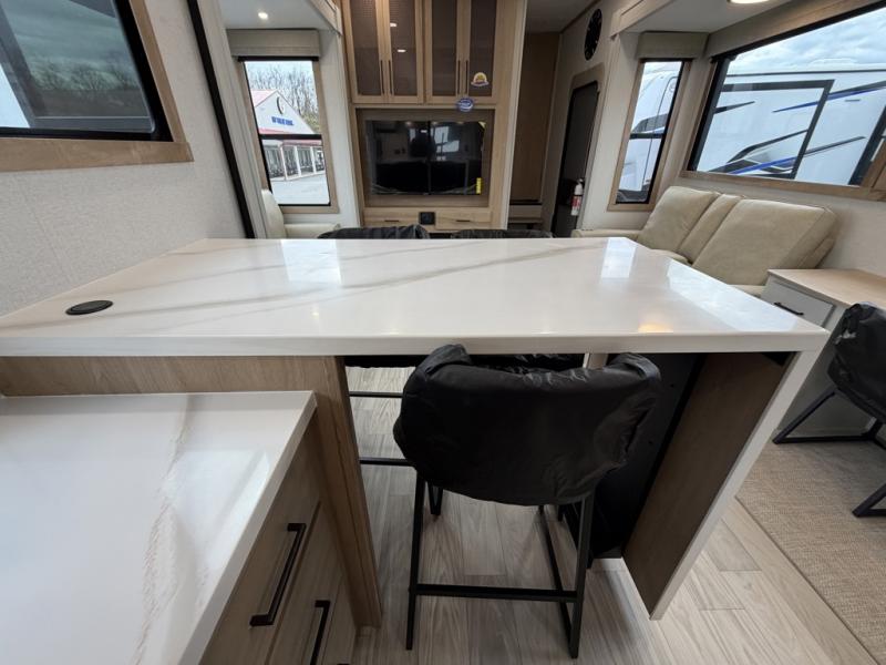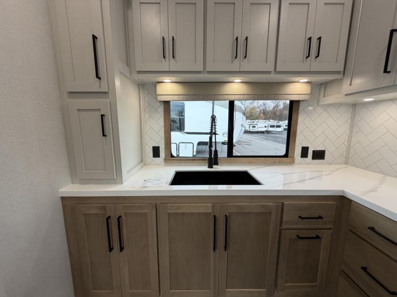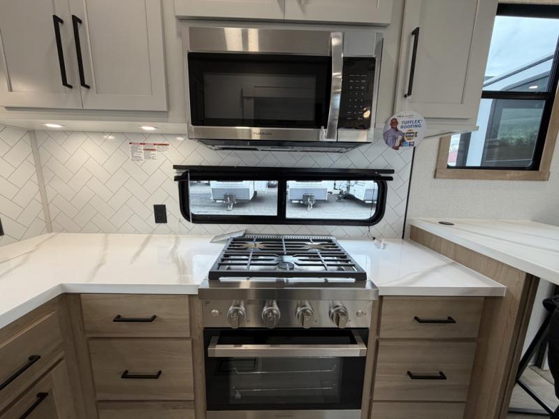 This fifth wheel is packed with convenient features to make your travels more comfortable and enjoyable! The master bedroom includes a king bed slide out with USB ports on either side of the bed so you both can charge your phones, and there is a dresser for your folded clothes. You will love the front bathroom with dual bath sinks, a fiberglass one-piece shower, plus a walk-in closet with shelves and rods to hang clothes! There is a unique middle utility room with washer and dryer prep if you want to add these, a Washer and dryer counter and a rod to hang clothes that will make a perfect laundry room, or you can utilize this space for storage! Head to the main living area to relax on the theater seating or hide-a-bed sofa, and if you have guests stay over, they can sleep here. There is also an entertainment center with a 50" flat screen TV, but you might just leave that off if you're working at the desk with a chair that is provided. We've saved the best part for last, the kitchen! Here, you'll find ample counter space to prep home-cooked meals, a three-burner range with a 24" oven, plus a large counter with barstools where you can enjoy breakfast at each morning. Choosing this fifth wheel is a no-brainer!