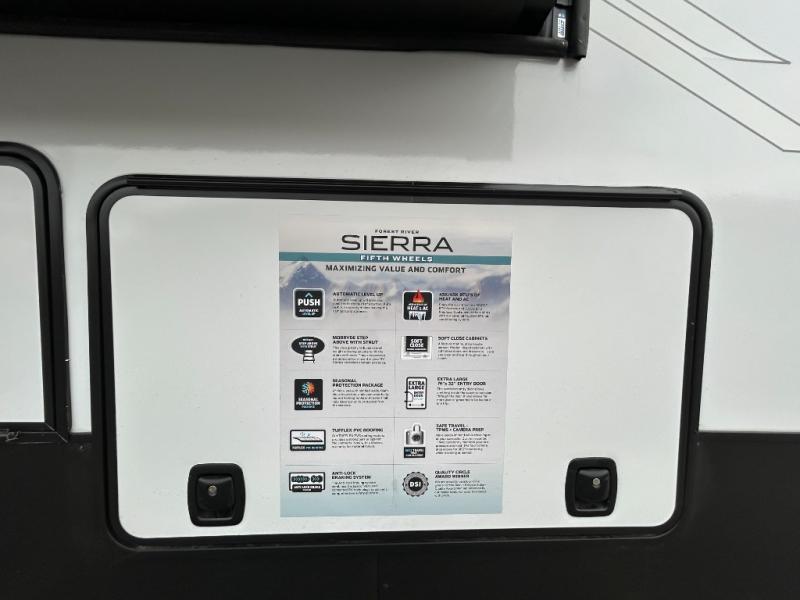 Each one of these Forest River Sierra fifth wheels are equipped with everything you need to make the most of each adventure! The underbelly armor will protect your unit's vitals from road debris and the painted two tone aerodynamic fiberglass front cap has an improved turning radius to make them easier to navigate. With an electric leveling system, you can set your unit up quick and easy then get to having fun faster than ever. The cambered powder coated frame with rust prohibitor construction allows for more duration of the fifth wheel. Each model also comes with a TV antenna with booster, 60,000BTU on demand tankless water heater, Goodyear Radial tires with 7,000 lb. axles, and the list goes on. The interior is just as impressive with Beachside Sundance Congoleum linoleum, recessed residential lighting, a memory foam mattress, and hidden hinged, soft close drawers and cabinets!