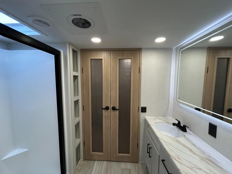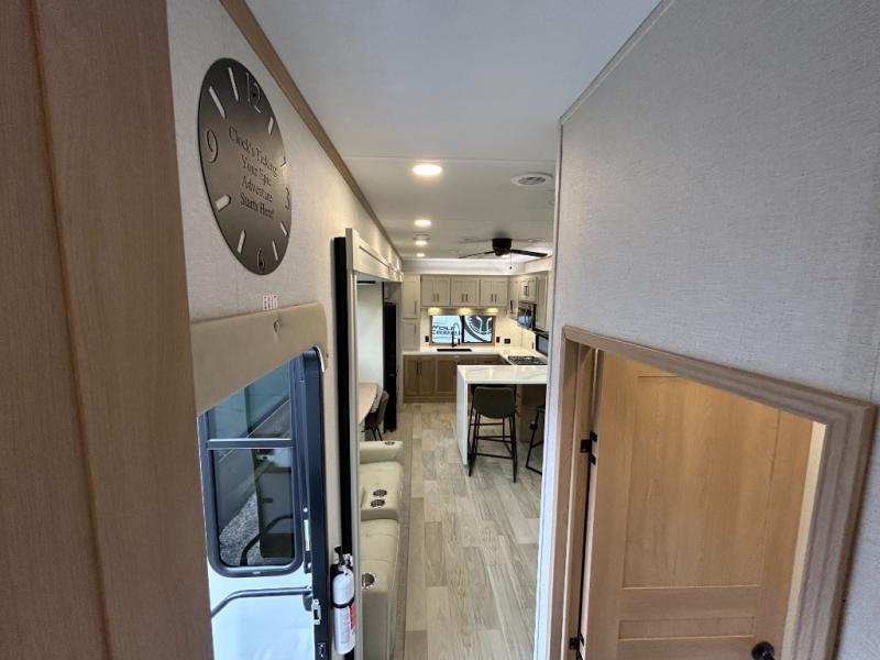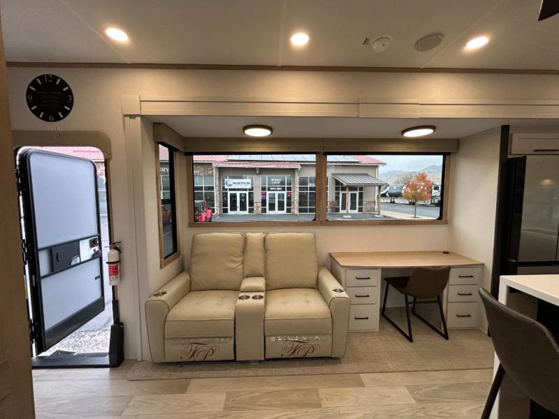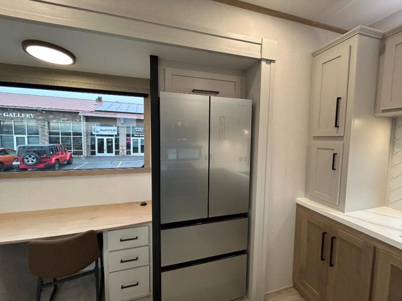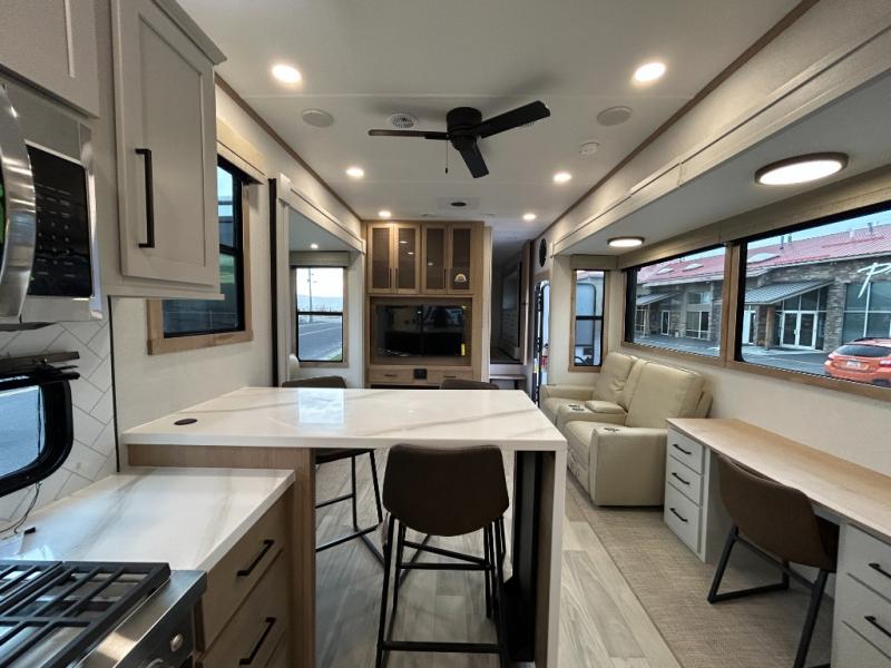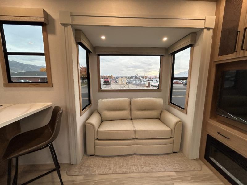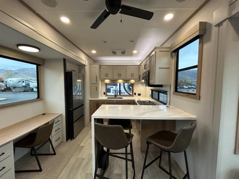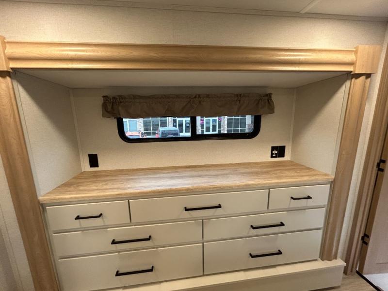 This fifth wheel is packed with convenient features to make your travels more comfortable and enjoyable! The master bedroom includes a king bed slide out with USB ports on either side of the bed so you both can charge your phones, and there is a dresser for your folded clothes. You will love the front bathroom with dual bath sinks, a fiberglass one-piece shower, plus a walk-in closet with shelves and rods to hang clothes! There is a unique middle utility room with washer and dryer prep if you want to add these, a Washer and dryer counter and a rod to hang clothes that will make a perfect laundry room, or you can utilize this space for storage! Head to the main living area to relax on the theater seating or hide-a-bed sofa, and if you have guests stay over, they can sleep here. There is also an entertainment center with a 50" flat screen TV, but you might just leave that off if you're working at the desk with a chair that is provided. We've saved the best part for last, the kitchen! Here, you'll find ample counter space to prep home-cooked meals, a three-burner range with a 24" oven, plus a large counter with barstools where you can enjoy breakfast at each morning. Choosing this fifth wheel is a no-brainer!