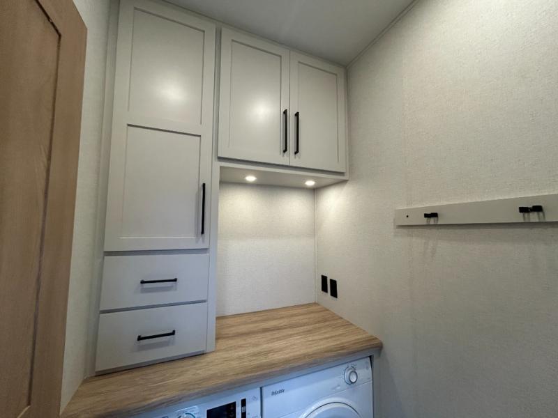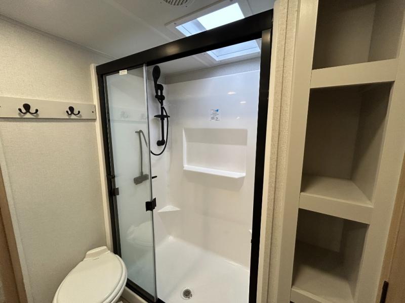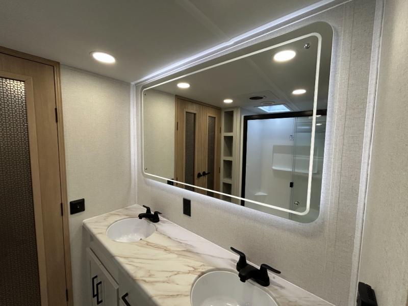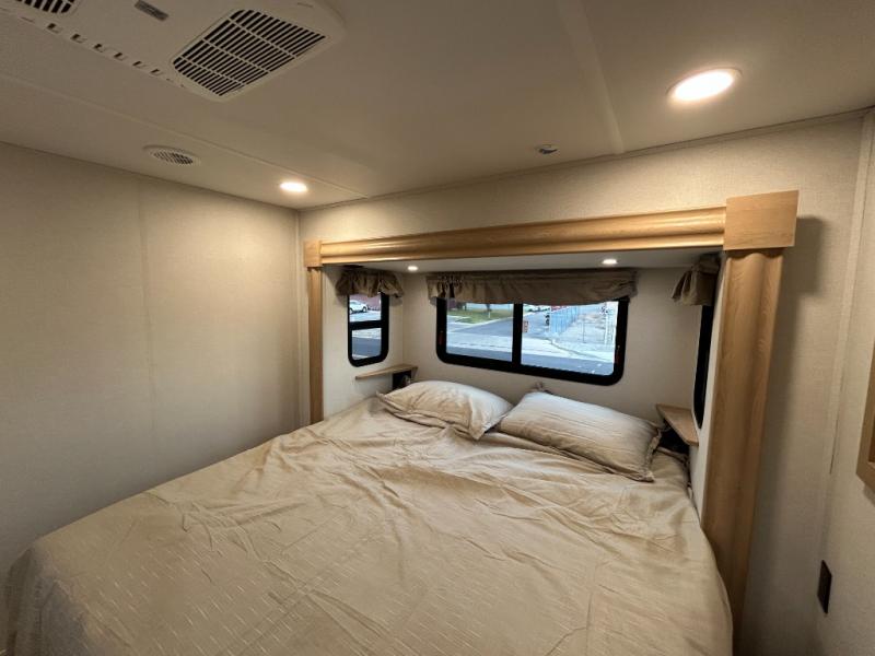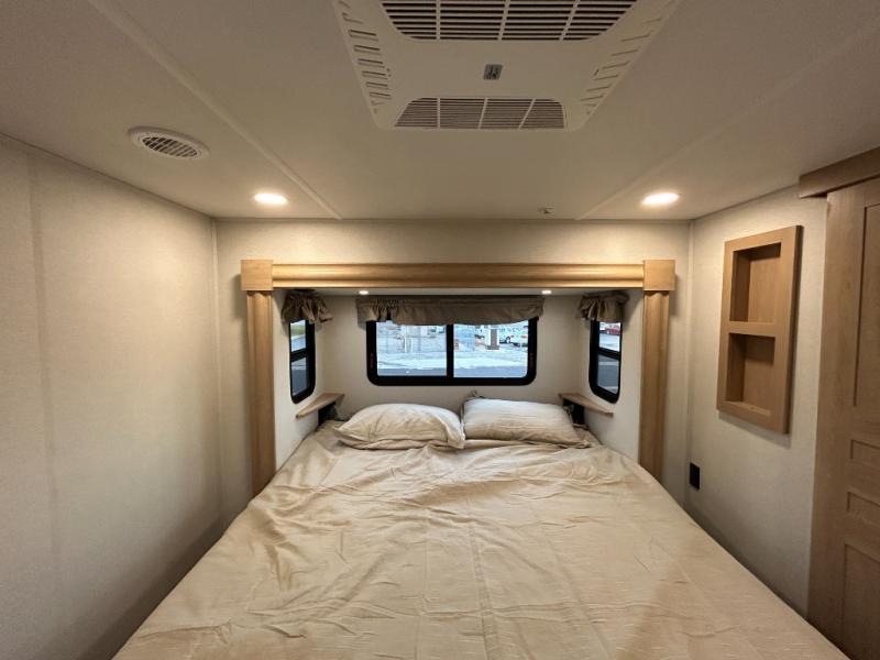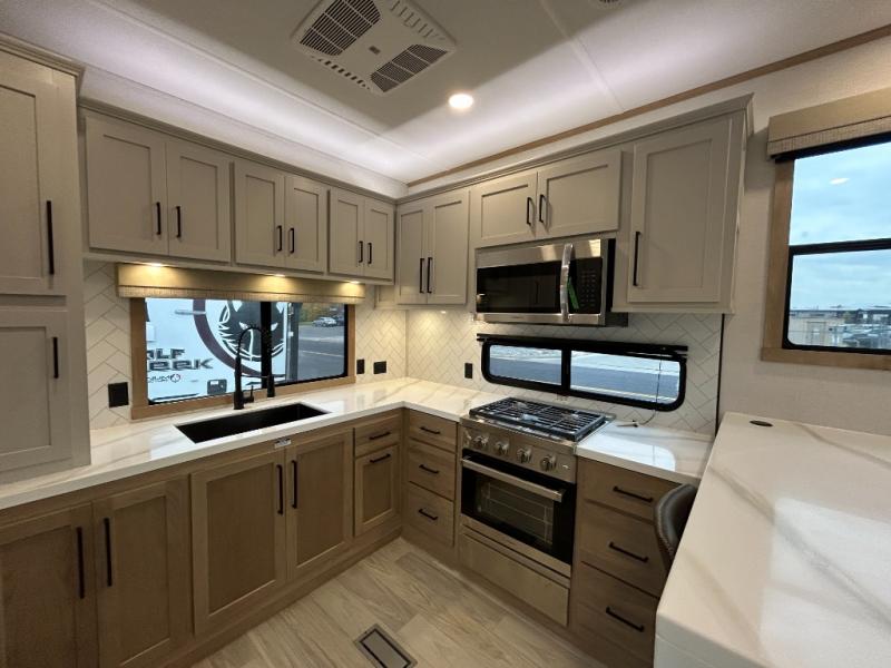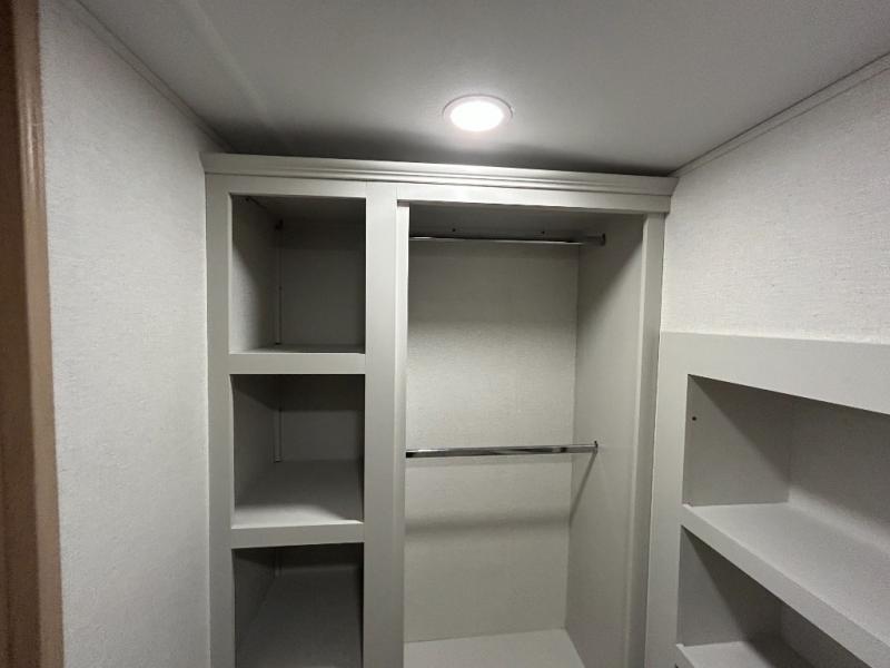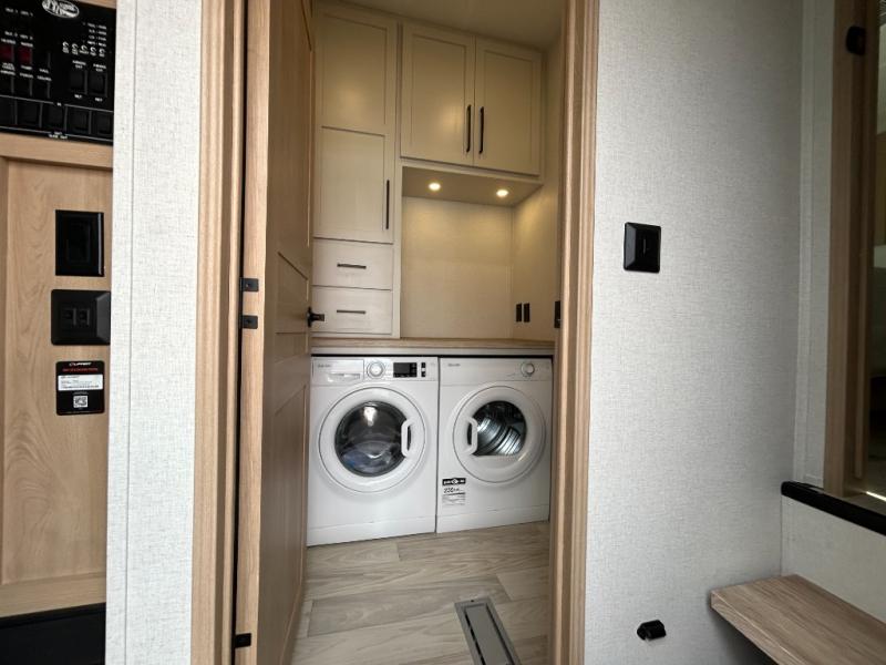 This fifth wheel is packed with convenient features to make your travels more comfortable and enjoyable! The master bedroom includes a king bed slide out with USB ports on either side of the bed so you both can charge your phones, and there is a dresser for your folded clothes. You will love the front bathroom with dual bath sinks, a fiberglass one-piece shower, plus a walk-in closet with shelves and rods to hang clothes! There is a unique middle utility room with washer and dryer prep if you want to add these, a Washer and dryer counter and a rod to hang clothes that will make a perfect laundry room, or you can utilize this space for storage! Head to the main living area to relax on the theater seating or hide-a-bed sofa, and if you have guests stay over, they can sleep here. There is also an entertainment center with a 50" flat screen TV, but you might just leave that off if you're working at the desk with a chair that is provided. We've saved the best part for last, the kitchen! Here, you'll find ample counter space to prep home-cooked meals, a three-burner range with a 24" oven, plus a large counter with barstools where you can enjoy breakfast at each morning. Choosing this fifth wheel is a no-brainer!