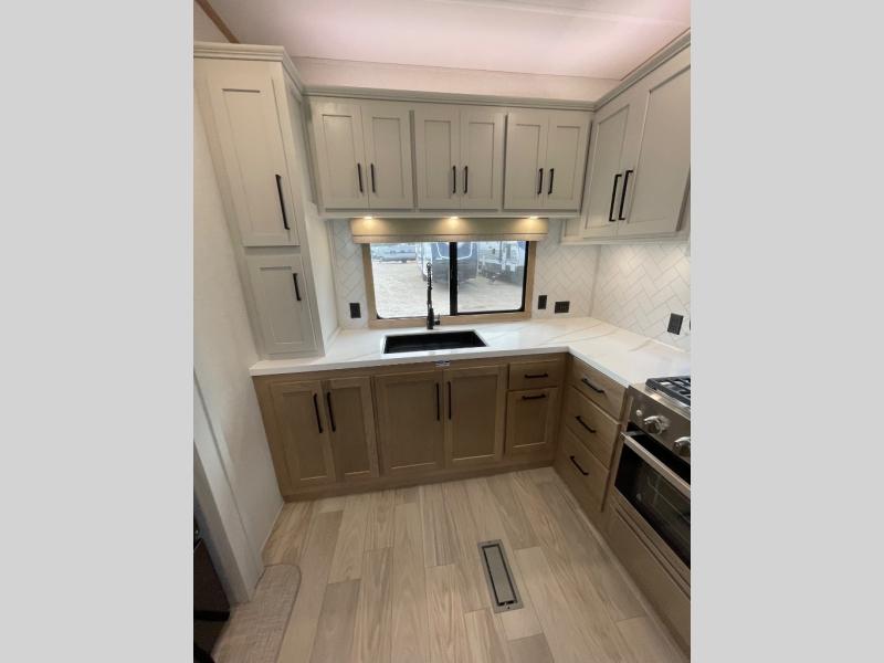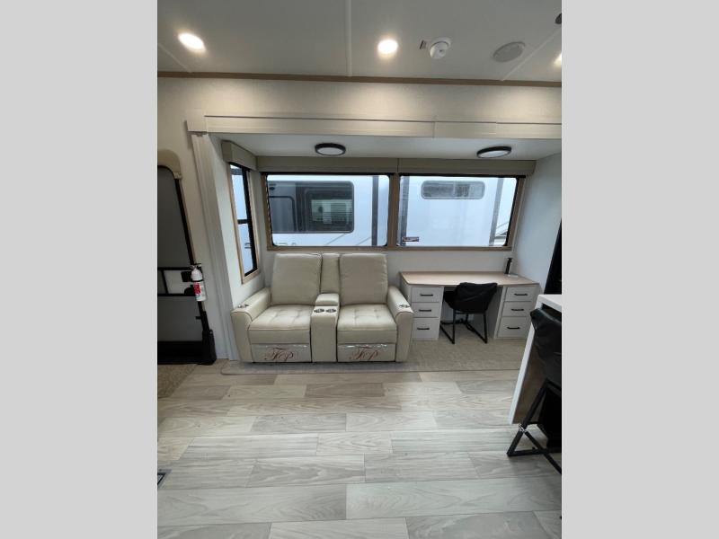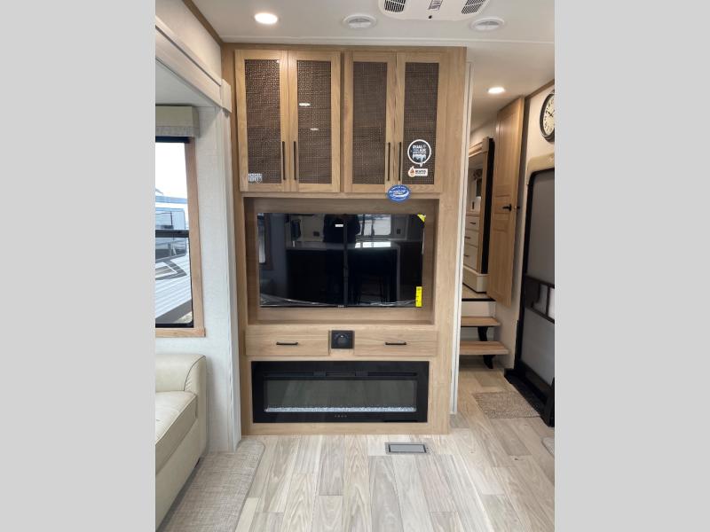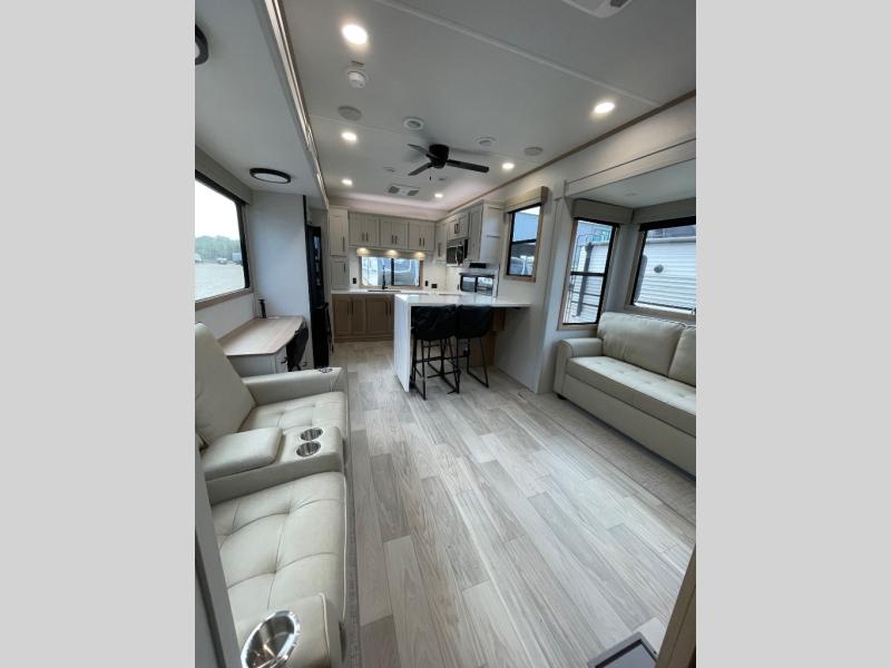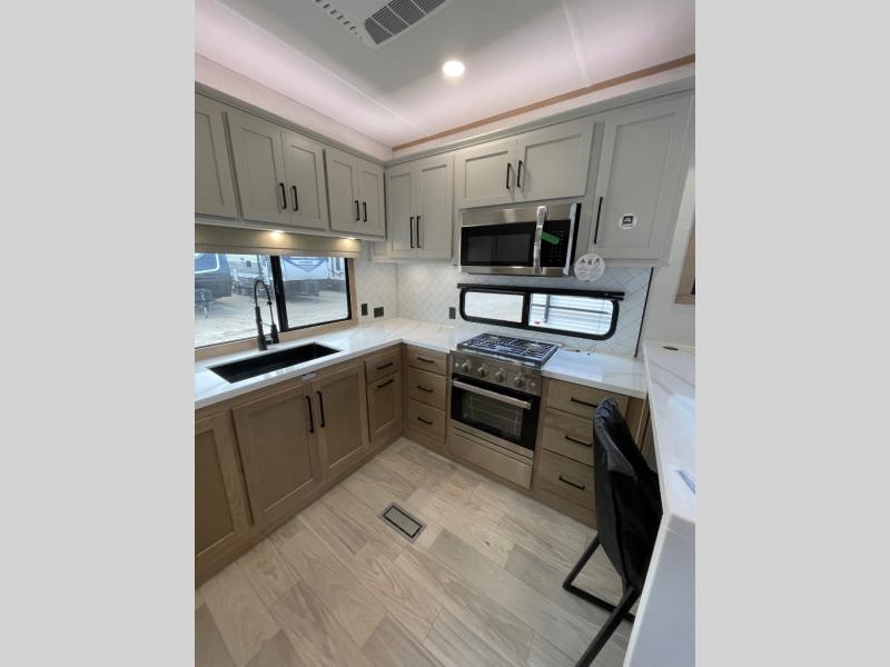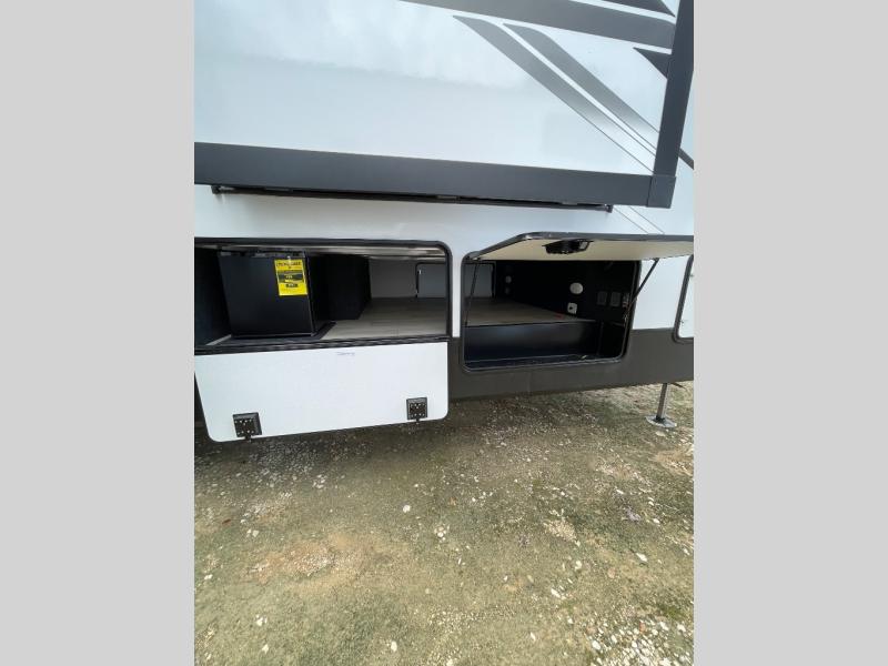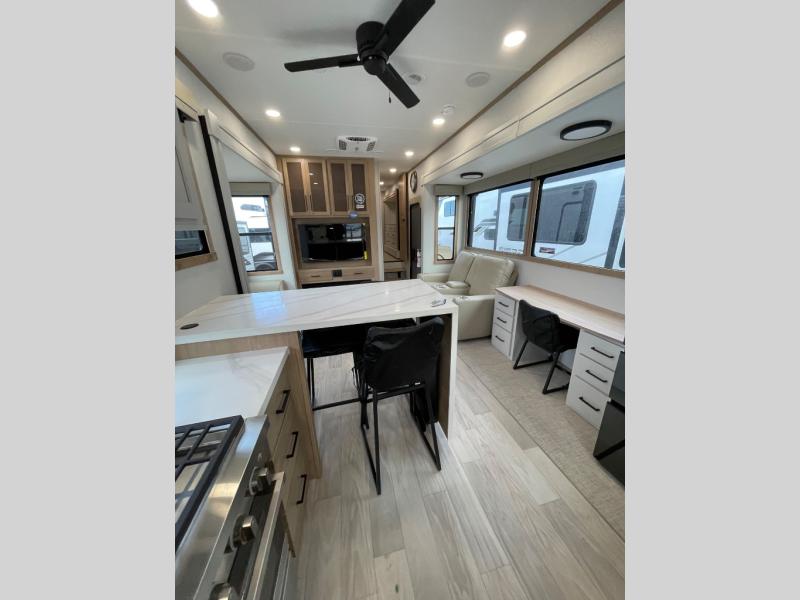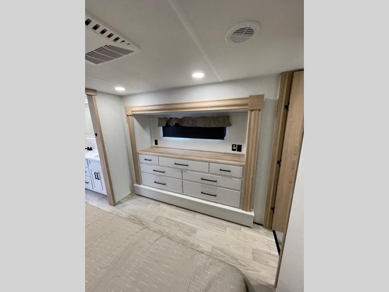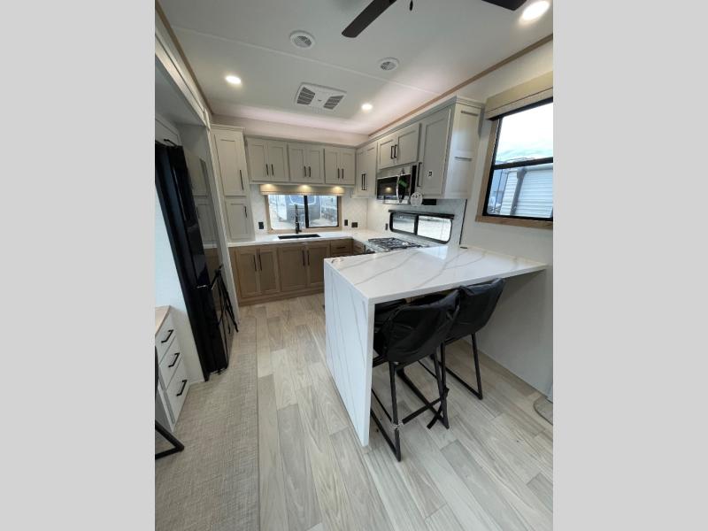 This fifth wheel is packed with convenient features to make your travels more comfortable and enjoyable! The master bedroom includes a king bed slide out with USB ports on either side of the bed so you both can charge your phones, and there is a dresser for your folded clothes. You will love the front bathroom with dual bath sinks, a fiberglass one-piece shower, plus a walk-in closet with shelves and rods to hang clothes! There is a unique middle utility room with washer and dryer prep if you want to add these, a Washer and dryer counter and a rod to hang clothes that will make a perfect laundry room, or you can utilize this space for storage! Head to the main living area to relax on the theater seating or hide-a-bed sofa, and if you have guests stay over, they can sleep here. There is also an entertainment center with a 50" flat screen TV, but you might just leave that off if you're working at the desk with a chair that is provided. We've saved the best part for last, the kitchen! Here, you'll find ample counter space to prep home-cooked meals, a three-burner range with a 24" oven, plus a large counter with barstools where you can enjoy breakfast at each morning. Choosing this fifth wheel is a no-brainer!
