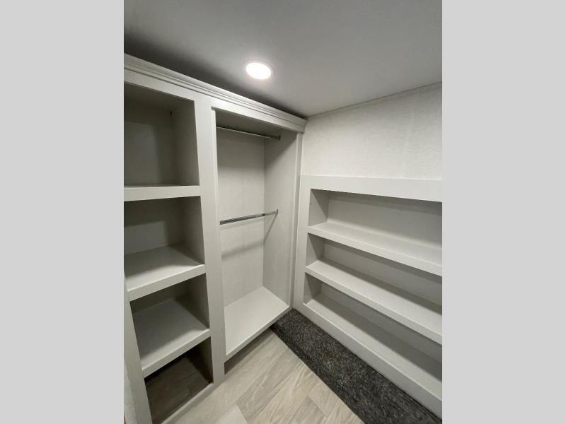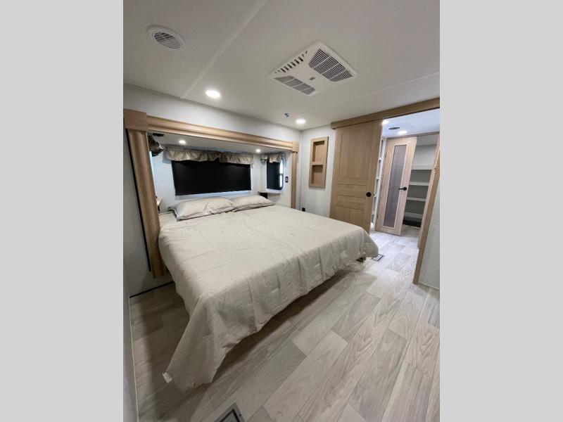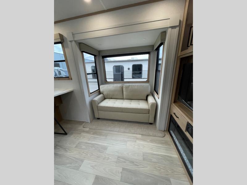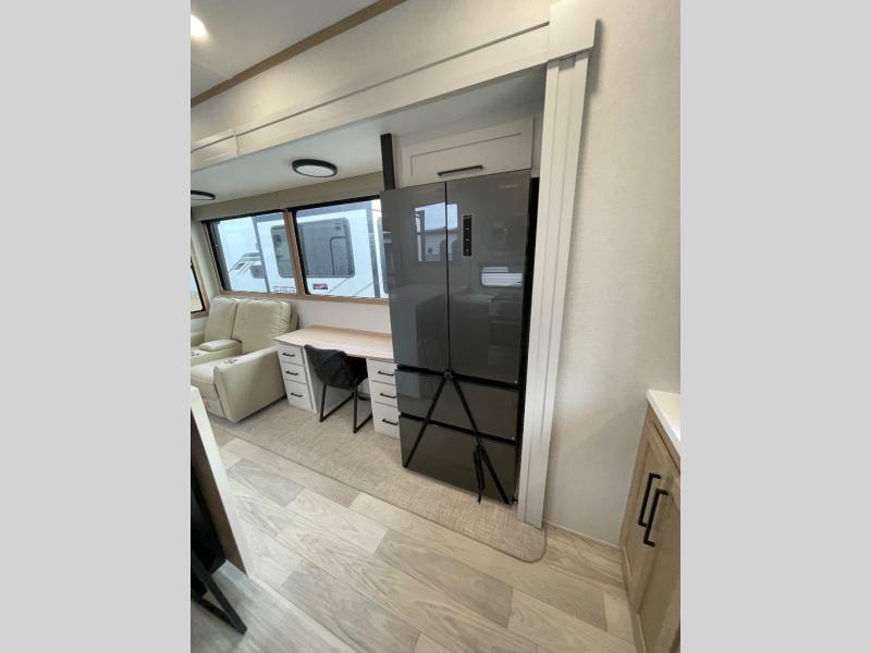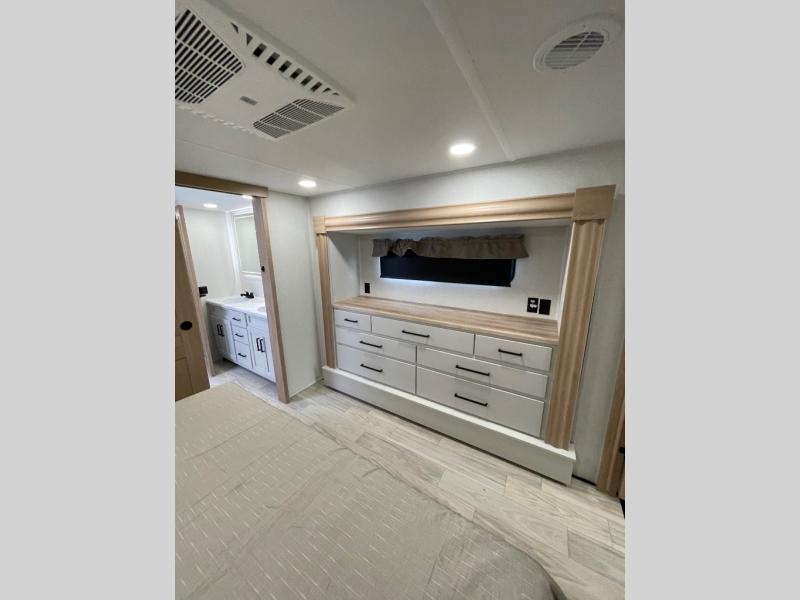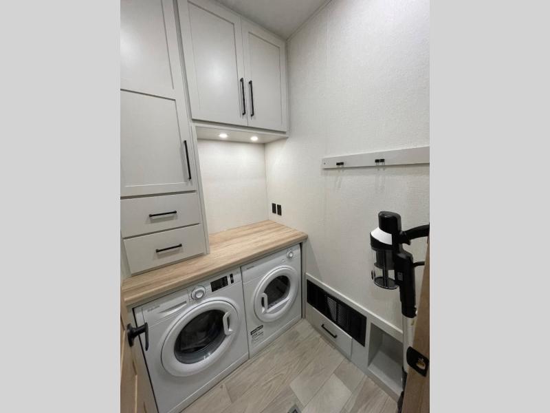 This fifth wheel is packed with convenient features to make your travels more comfortable and enjoyable! The master bedroom includes a king bed slide out with USB ports on either side of the bed so you both can charge your phones, and there is a dresser for your folded clothes. You will love the front bathroom with dual bath sinks, a fiberglass one-piece shower, plus a walk-in closet with shelves and rods to hang clothes! There is a unique middle utility room with washer and dryer prep if you want to add these, a Washer and dryer counter and a rod to hang clothes that will make a perfect laundry room, or you can utilize this space for storage! Head to the main living area to relax on the theater seating or hide-a-bed sofa, and if you have guests stay over, they can sleep here. There is also an entertainment center with a 50" flat screen TV, but you might just leave that off if you're working at the desk with a chair that is provided. We've saved the best part for last, the kitchen! Here, you'll find ample counter space to prep home-cooked meals, a three-burner range with a 24" oven, plus a large counter with barstools where you can enjoy breakfast at each morning. Choosing this fifth wheel is a no-brainer!