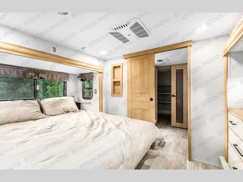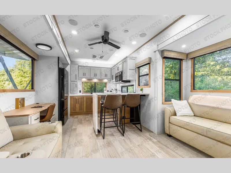 This fifth wheel is packed with convenient features to make your travels more comfortable and enjoyable! The master bedroom includes a king bed slide out with USB ports on either side of the bed so you both can charge your phones, and there is a dresser for your folded clothes. You will love the front bathroom with dual bath sinks, a fiberglass one-piece shower, plus a walk-in closet with shelves and rods to hang clothes! There is a unique middle utility room with washer and dryer prep if you want to add these, a Washer and dryer counter and a rod to hang clothes that will make a perfect laundry room, or you can utilize this space for storage! Head to the main living area to relax on the theater seating or hide-a-bed sofa, and if you have guests stay over, they can sleep here. There is also an entertainment center with a 50" flat screen TV, but you might just leave that off if you're working at the desk with a chair that is provided. We've saved the best part for last, the kitchen! Here, you'll find ample counter space to prep home-cooked meals, a three-burner range with a 24" oven, plus a large counter with barstools where you can enjoy breakfast at each morning. Choosing this fifth wheel is a no-brainer!