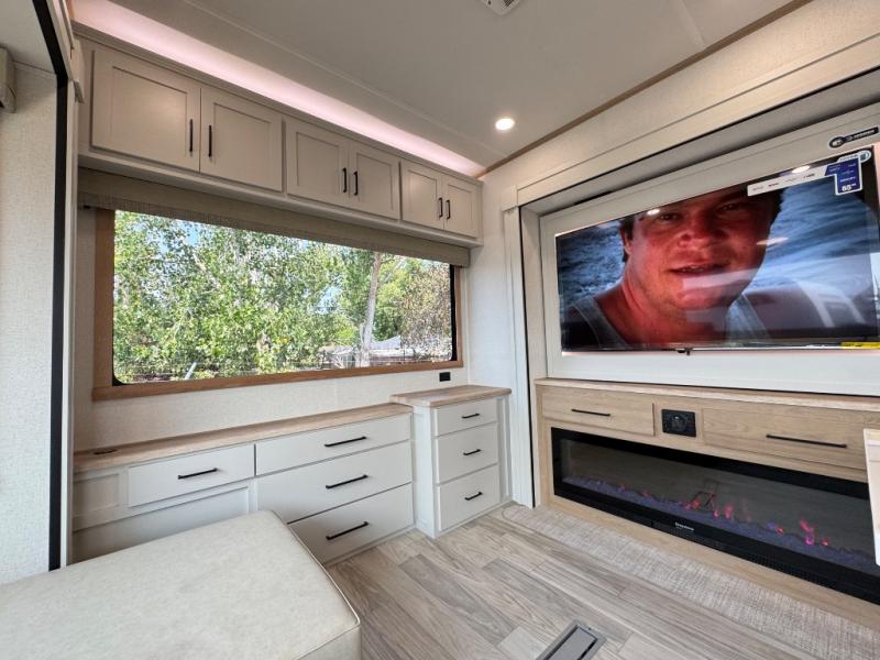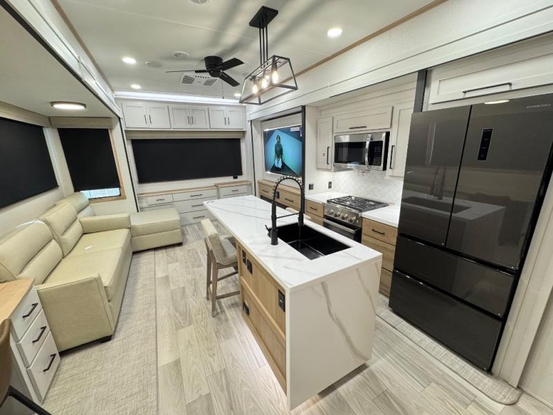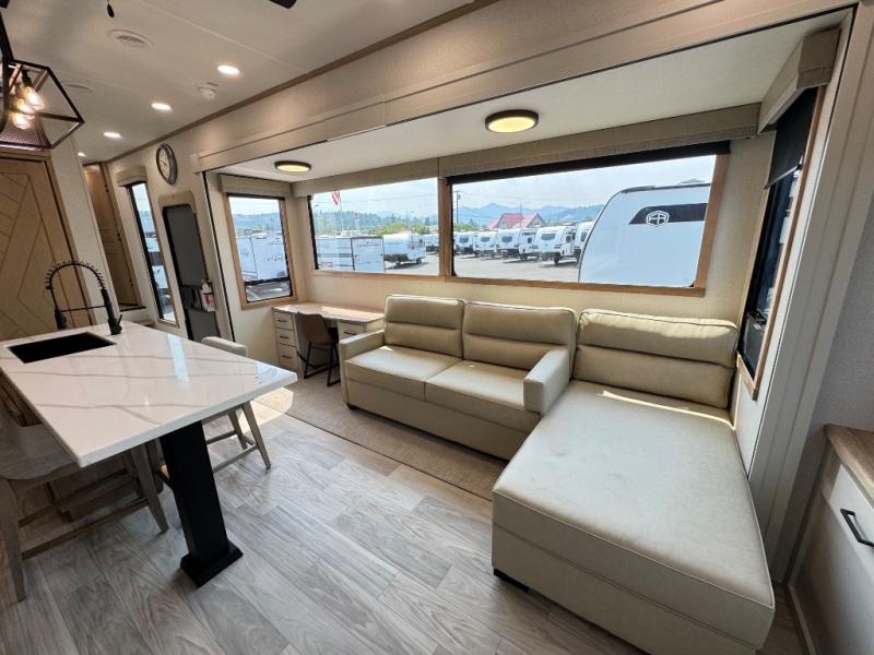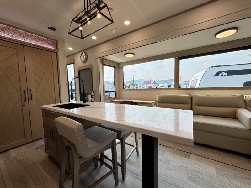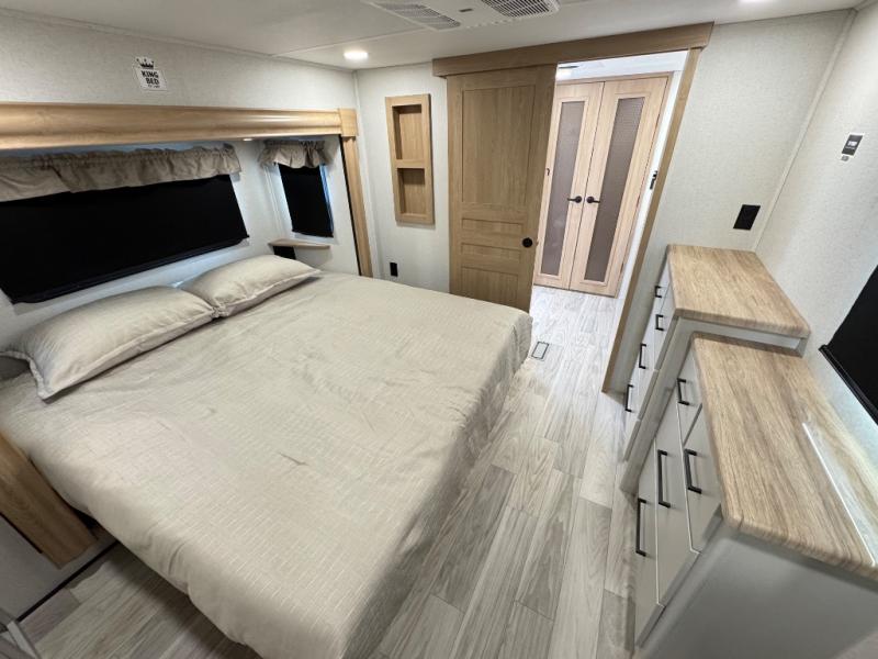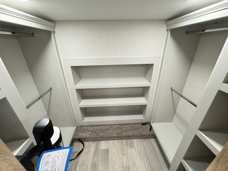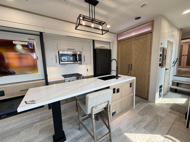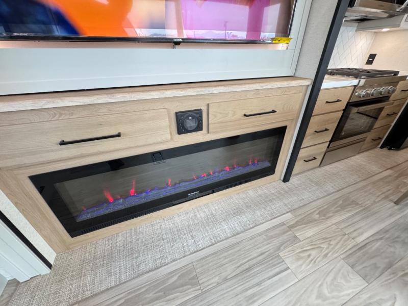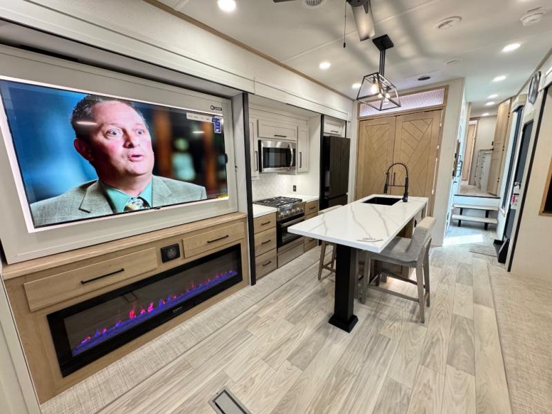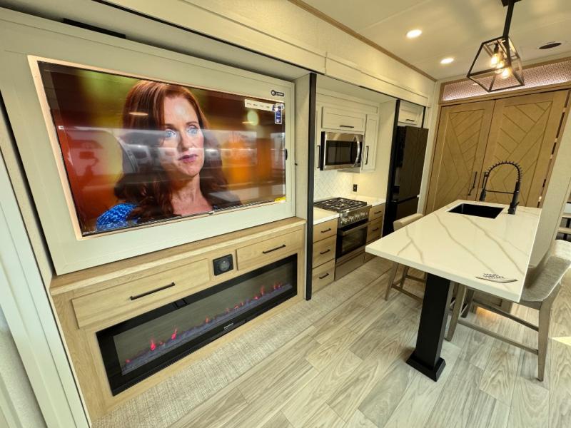 This fifth wheel is perfect for those seeking a comfortable, feature-rich home on wheels. Upon entering, you'll find a spacious rear living room, ideal for relaxation and entertainment. The room features a comfortable chase lounge, sofa, and an entertainment center with a cozy fireplace. For added convenience, there's a hidden pantry, desk with a chair, and a shelf and cabinet for storage. The kitchen is well-appointed with a stylish kitchen island featuring a beautiful waterfall edge. Overhead cabinets provide ample storage, while the microwave, 12V refrigerator, and four-burner cooktop make meal preparation a breeze. Plus, a butler pantry offers additional storage for kitchen essentials. A convenient half bath is located nearby, complete with a stackable washer and dryer prep if you want the option to add these appliances. The bedroom retreat features a comfortable king bed, a small dresser, and a tall dresser with a TV hookup. The adjacent walk-in bathroom closet boasts a one-piece fiberglass shower with a seat, dual sink, medicine cabinet, linen closet, and ample storage thanks to the various shelves, perfect for keeping your belongings organized. Exterior features include two awnings, one 12’ and the other 18’, providing ample shade and protection.