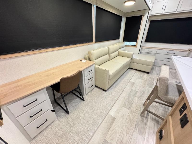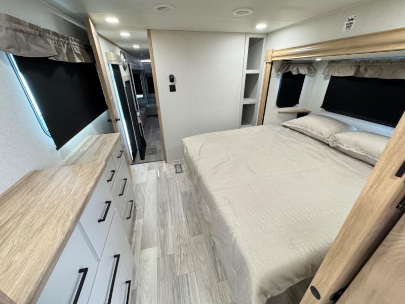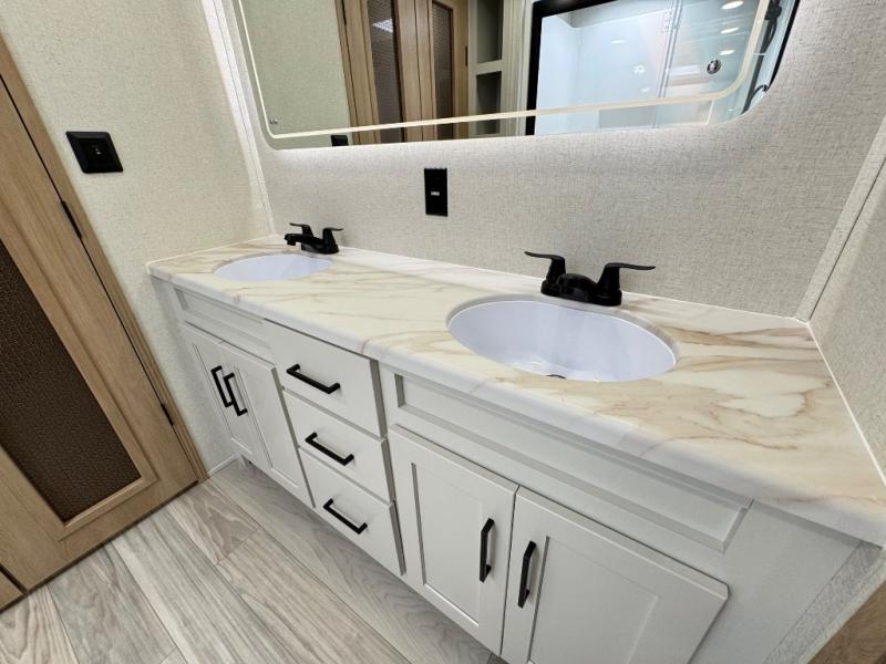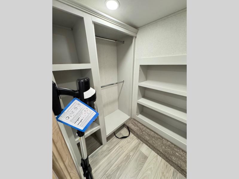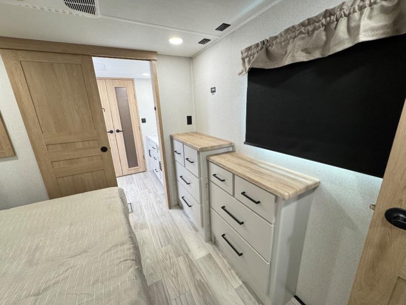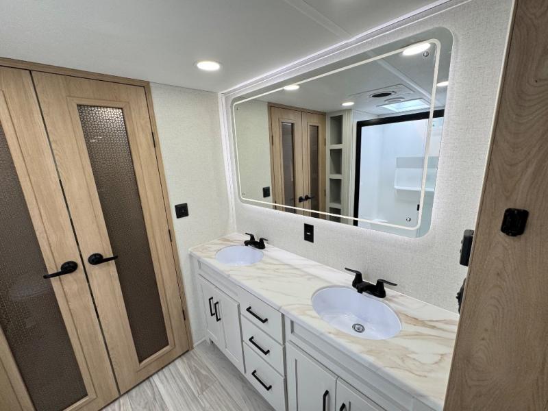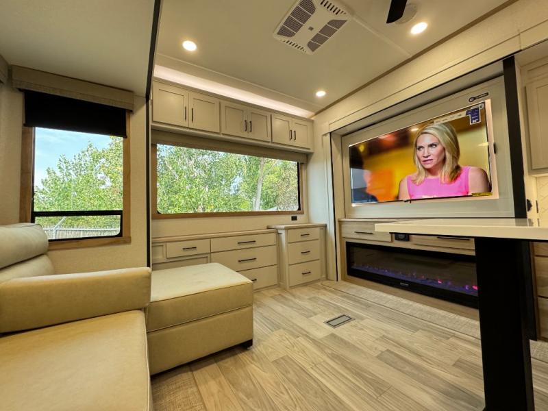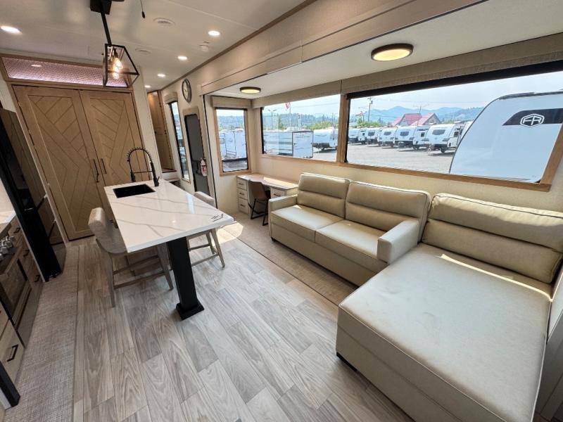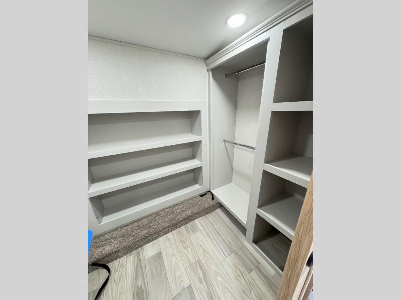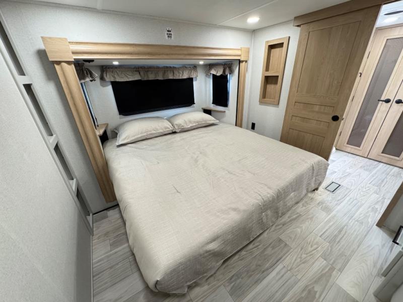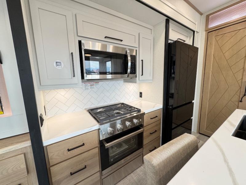 This fifth wheel is perfect for those seeking a comfortable, feature-rich home on wheels. Upon entering, you'll find a spacious rear living room, ideal for relaxation and entertainment. The room features a comfortable chase lounge, sofa, and an entertainment center with a cozy fireplace. For added convenience, there's a hidden pantry, desk with a chair, and a shelf and cabinet for storage. The kitchen is well-appointed with a stylish kitchen island featuring a beautiful waterfall edge. Overhead cabinets provide ample storage, while the microwave, 12V refrigerator, and four-burner cooktop make meal preparation a breeze. Plus, a butler pantry offers additional storage for kitchen essentials. A convenient half bath is located nearby, complete with a stackable washer and dryer prep if you want the option to add these appliances. The bedroom retreat features a comfortable king bed, a small dresser, and a tall dresser with a TV hookup. The adjacent walk-in bathroom closet boasts a one-piece fiberglass shower with a seat, dual sink, medicine cabinet, linen closet, and ample storage thanks to the various shelves, perfect for keeping your belongings organized. Exterior features include two awnings, one 12’ and the other 18’, providing ample shade and protection.