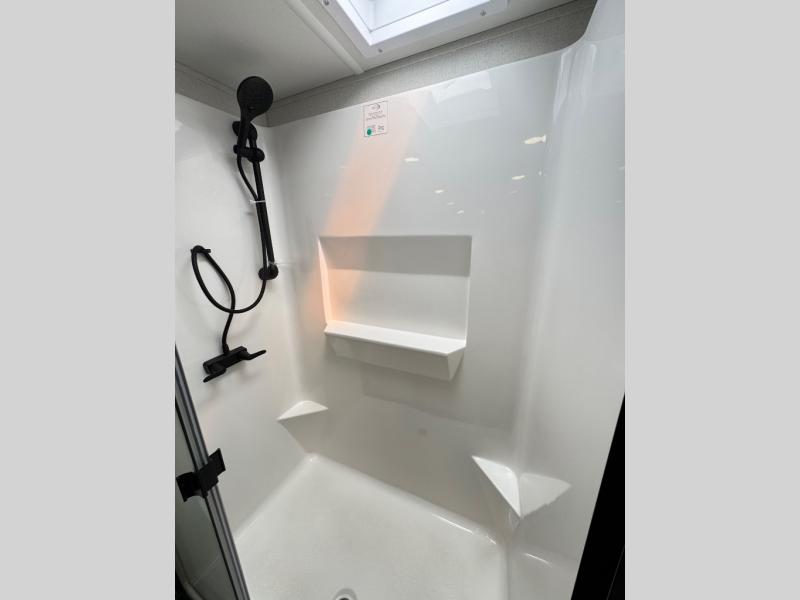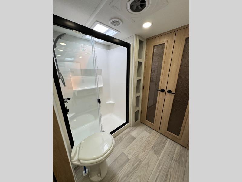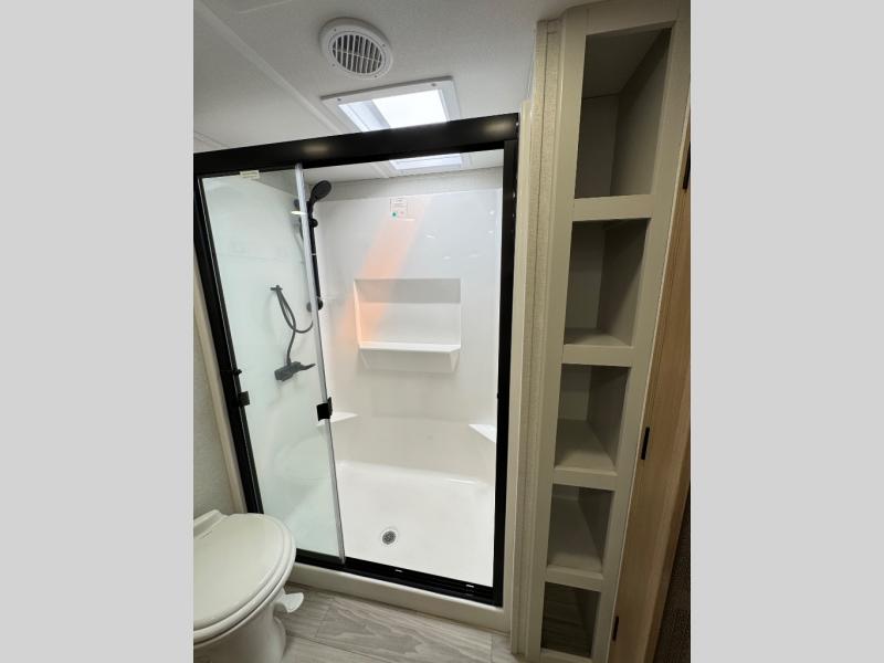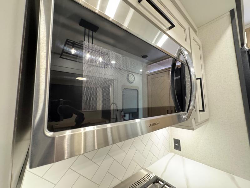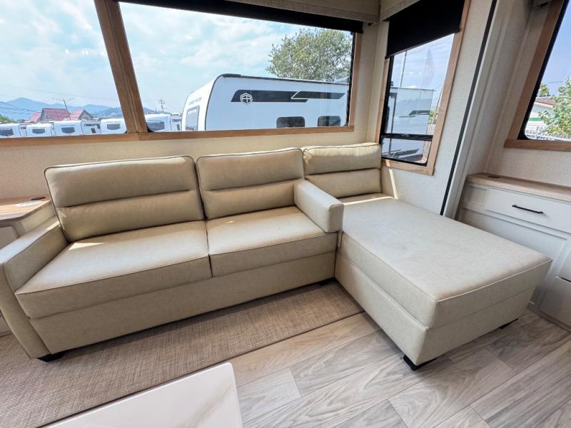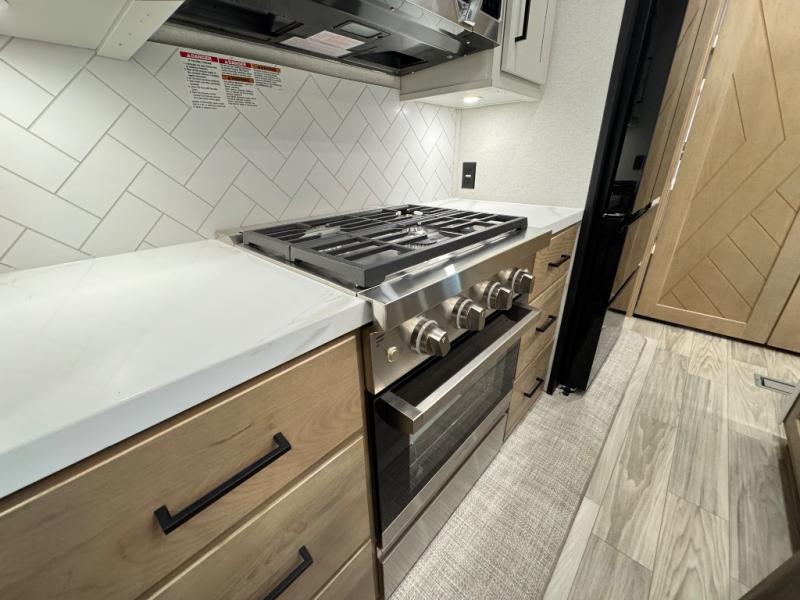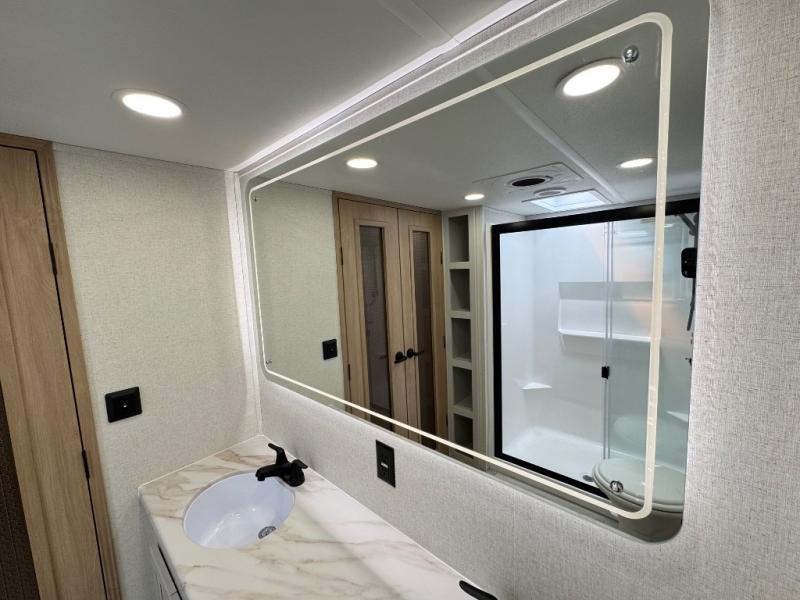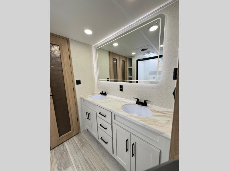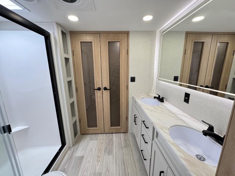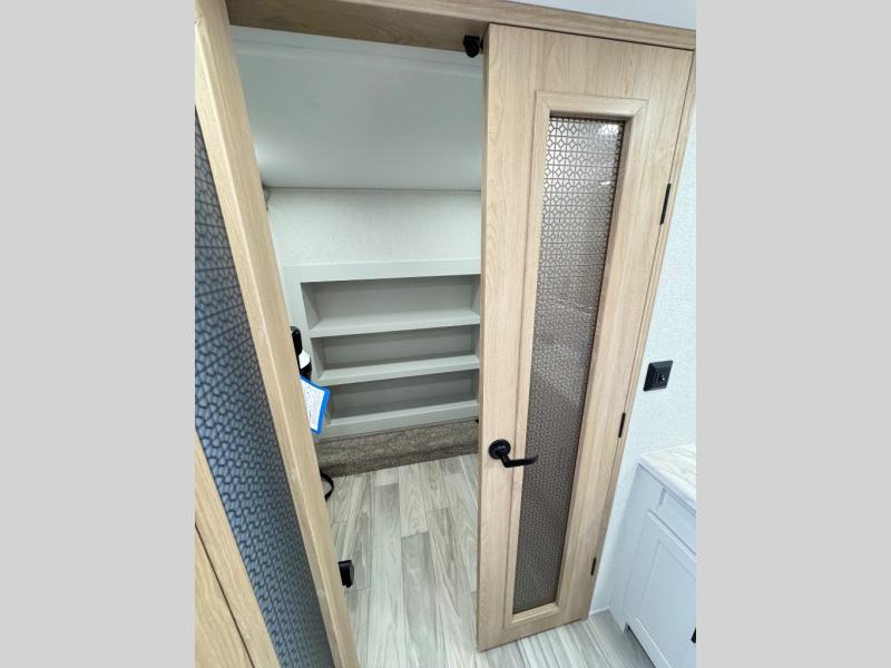 This fifth wheel is perfect for those seeking a comfortable, feature-rich home on wheels. Upon entering, you'll find a spacious rear living room, ideal for relaxation and entertainment. The room features a comfortable chase lounge, sofa, and an entertainment center with a cozy fireplace. For added convenience, there's a hidden pantry, desk with a chair, and a shelf and cabinet for storage. The kitchen is well-appointed with a stylish kitchen island featuring a beautiful waterfall edge. Overhead cabinets provide ample storage, while the microwave, 12V refrigerator, and four-burner cooktop make meal preparation a breeze. Plus, a butler pantry offers additional storage for kitchen essentials. A convenient half bath is located nearby, complete with a stackable washer and dryer prep if you want the option to add these appliances. The bedroom retreat features a comfortable king bed, a small dresser, and a tall dresser with a TV hookup. The adjacent walk-in bathroom closet boasts a one-piece fiberglass shower with a seat, dual sink, medicine cabinet, linen closet, and ample storage thanks to the various shelves, perfect for keeping your belongings organized. Exterior features include two awnings, one 12’ and the other 18’, providing ample shade and protection.