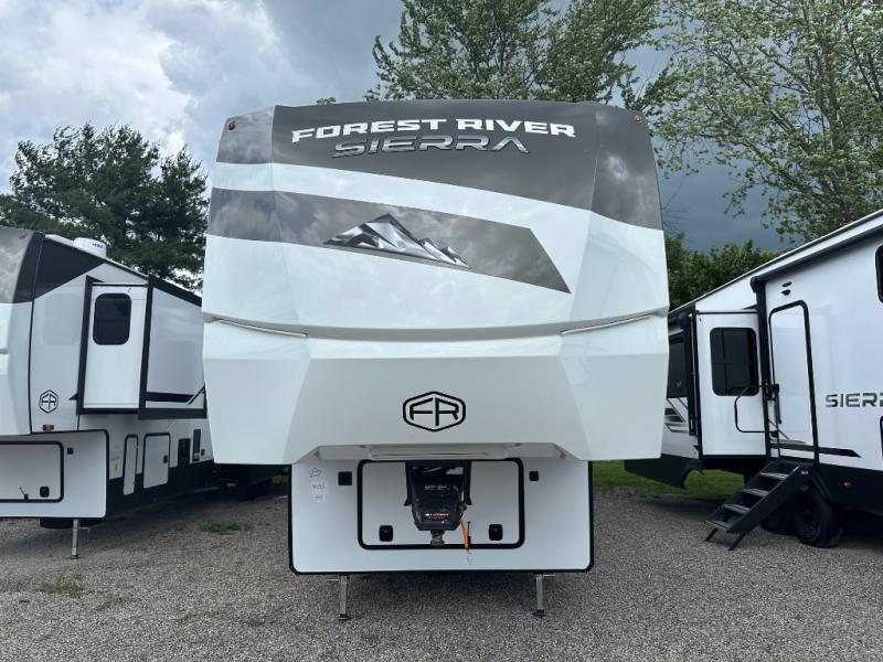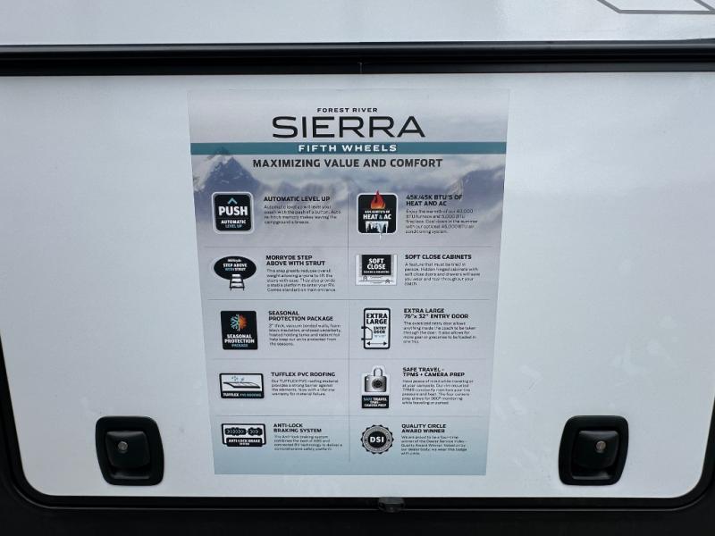 Each one of these Forest River Sierra fifth wheels are equipped with everything you need to make the most of each adventure! The underbelly armor will protect your unit's vitals from road debris and the painted two tone aerodynamic fiberglass front cap has an improved turning radius to make them easier to navigate. With an electric leveling system, you can set your unit up quick and easy then get to having fun faster than ever. The welded aluminum framed, vacuum bonded laminated superstructure will hold up through every adventure and the cambered powder coated frame comes with rust prohibitor to last longer. Each model also includes the Summit Package that comes with a king Wi-Fi extender system and Olympus antenna, a full coach water filter system, Goodyear tires with 7,000 lb. axles, and the list goes on. The interior is just as impressive with rustic wood plank linoleum, recessed residential lighting, a memory foam mattress, and mocha accent crown molding over the kitchen cabinets!