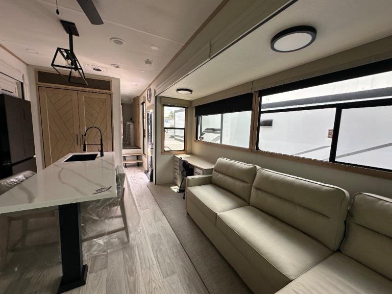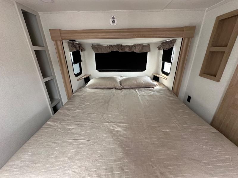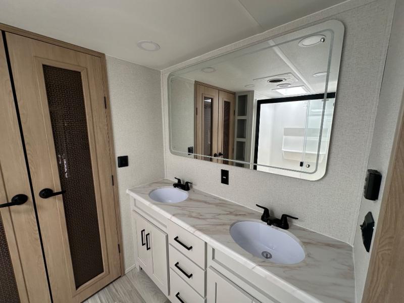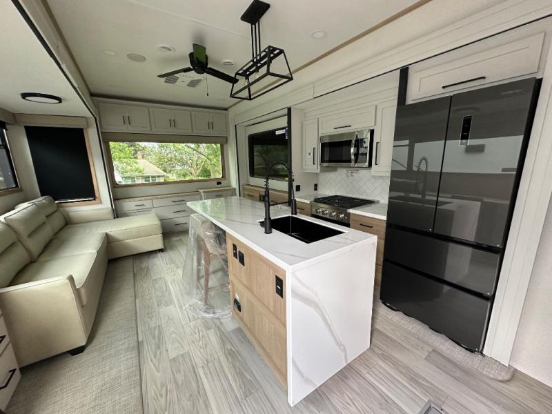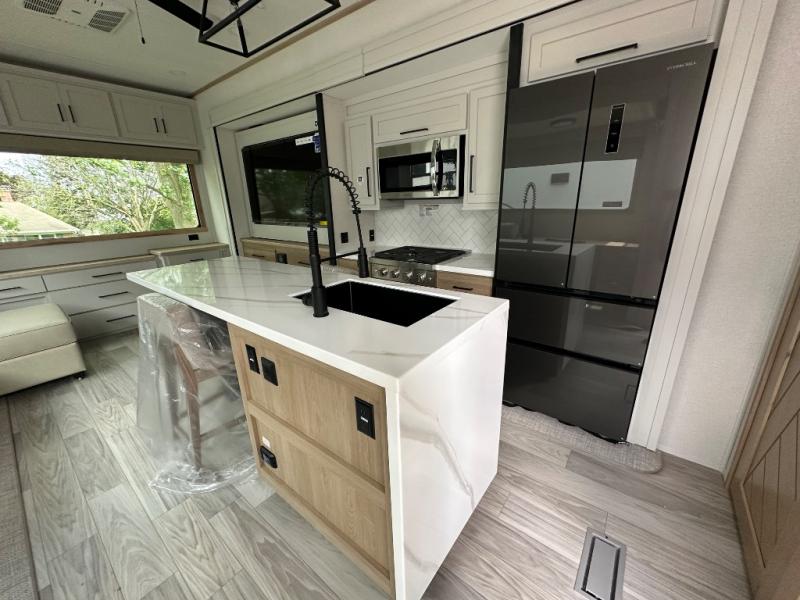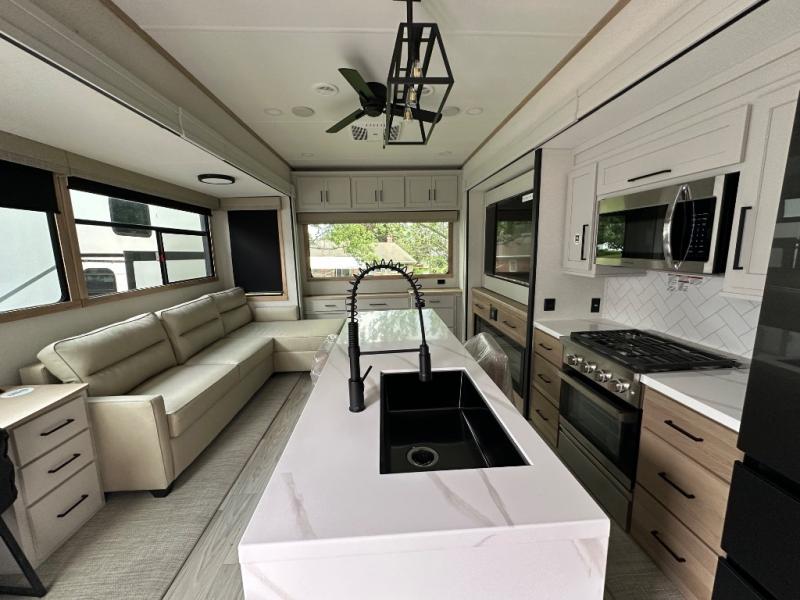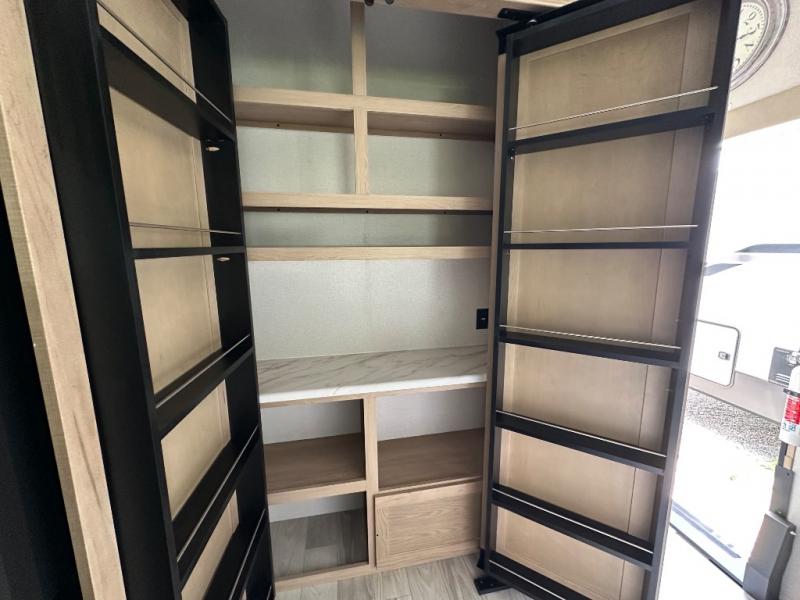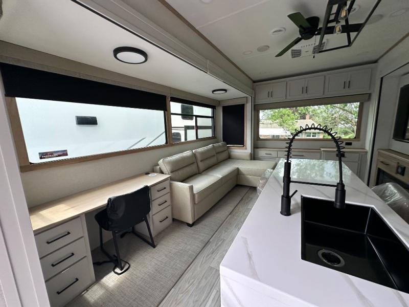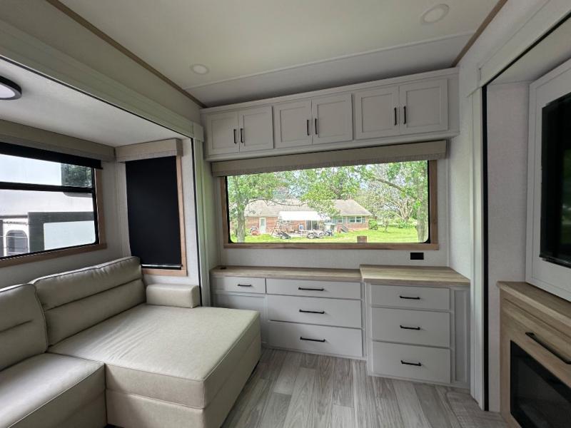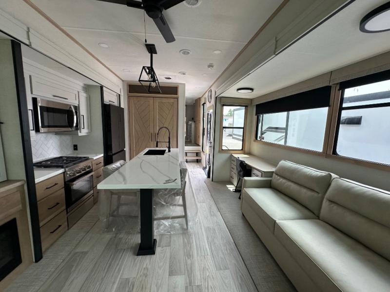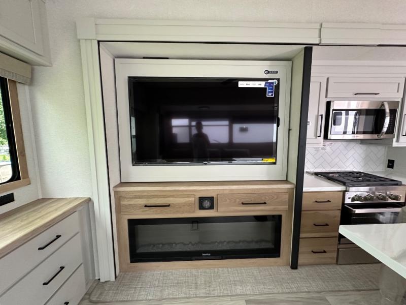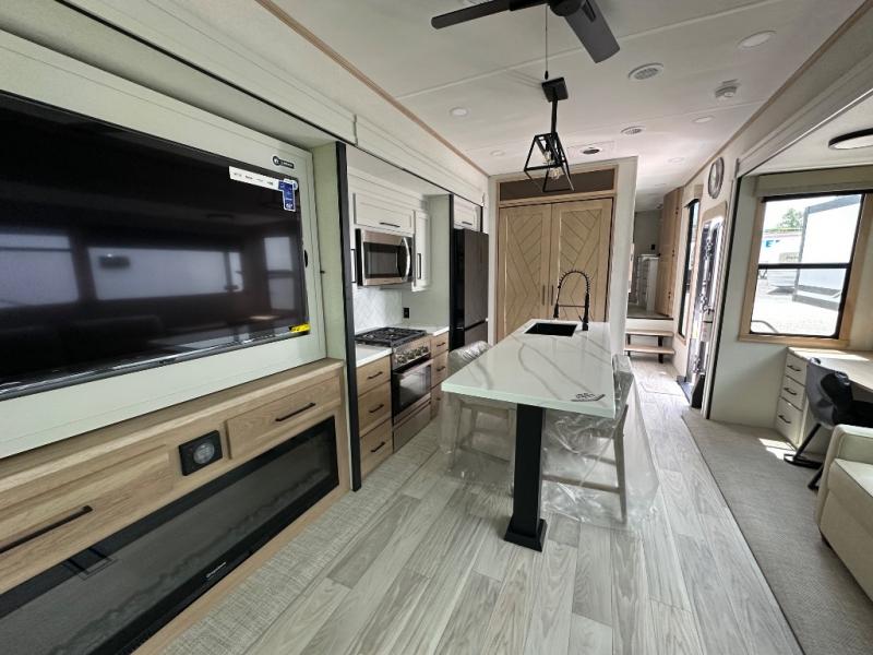 This fifth wheel is perfect for those seeking a comfortable, feature-rich home on wheels. Upon entering, you'll find a spacious rear living room, ideal for relaxation and entertainment. The room features a comfortable chase lounge, sofa, and an entertainment center with a cozy fireplace. For added convenience, there's a hidden pantry, desk with a chair, and a shelf and cabinet for storage. The kitchen is well-appointed with a stylish kitchen island featuring a beautiful waterfall edge. Overhead cabinets provide ample storage, while the microwave, 12V refrigerator, and four-burner cooktop make meal preparation a breeze. Plus, a butler pantry offers additional storage for kitchen essentials. A convenient half bath is located nearby, complete with a stackable washer and dryer prep if you want the option to add these appliances. The bedroom retreat features a comfortable king bed, a small dresser, and a tall dresser with a TV hookup. The adjacent walk-in bathroom closet boasts a one-piece fiberglass shower with a seat, dual sink, medicine cabinet, linen closet, and ample storage thanks to the various shelves, perfect for keeping your belongings organized. Exterior features include two awnings, one 12’ and the other 18’, providing ample shade and protection.