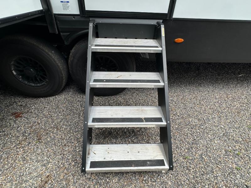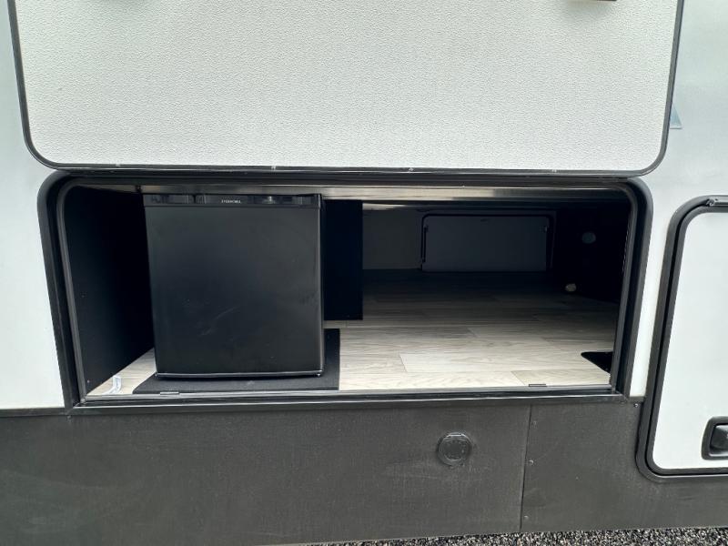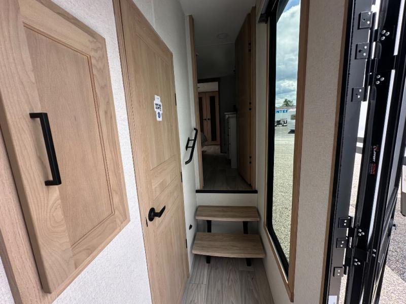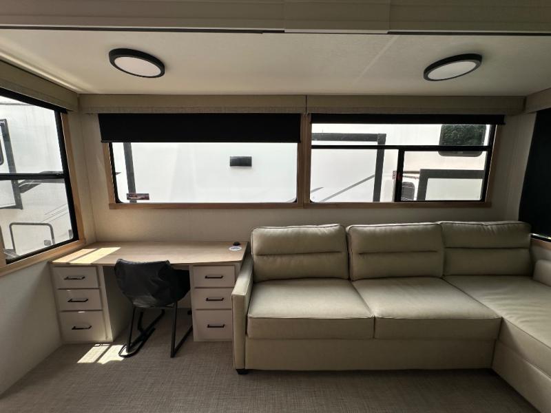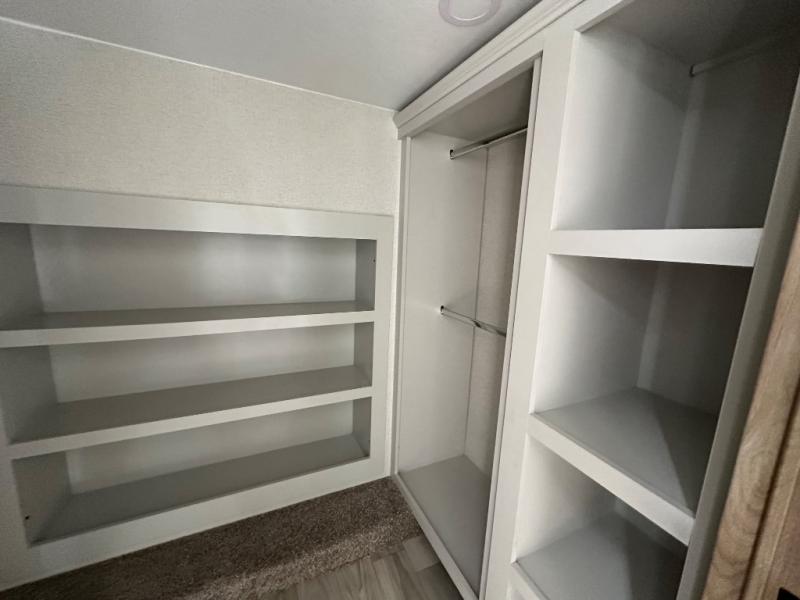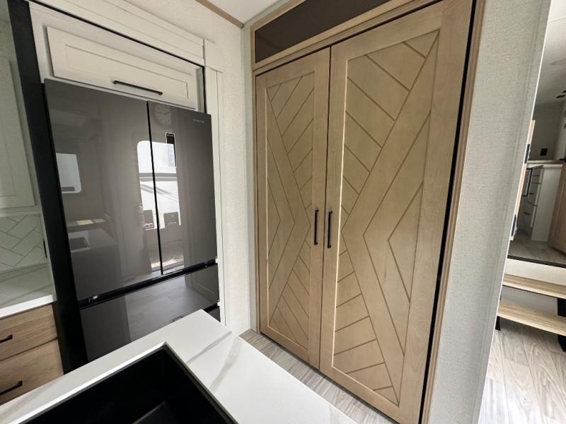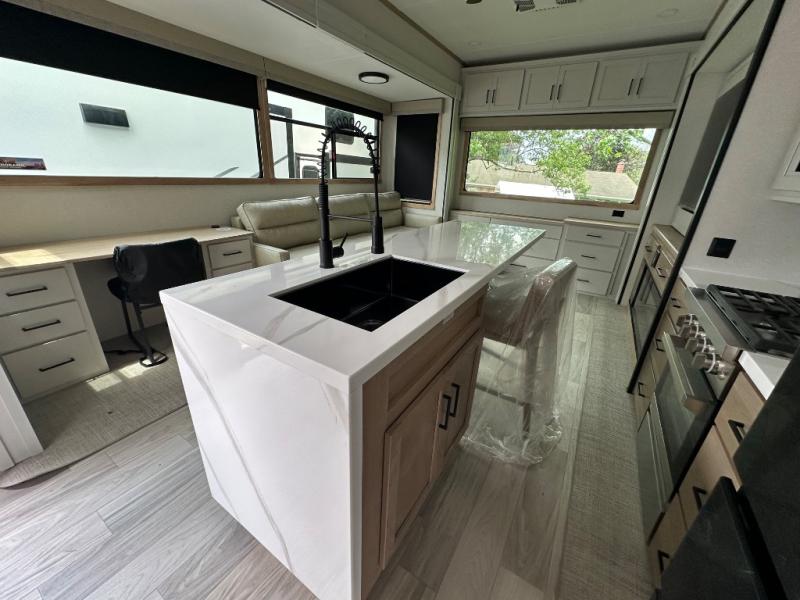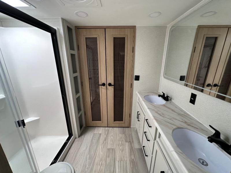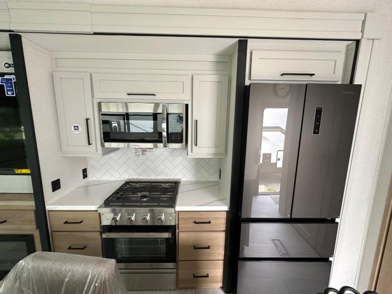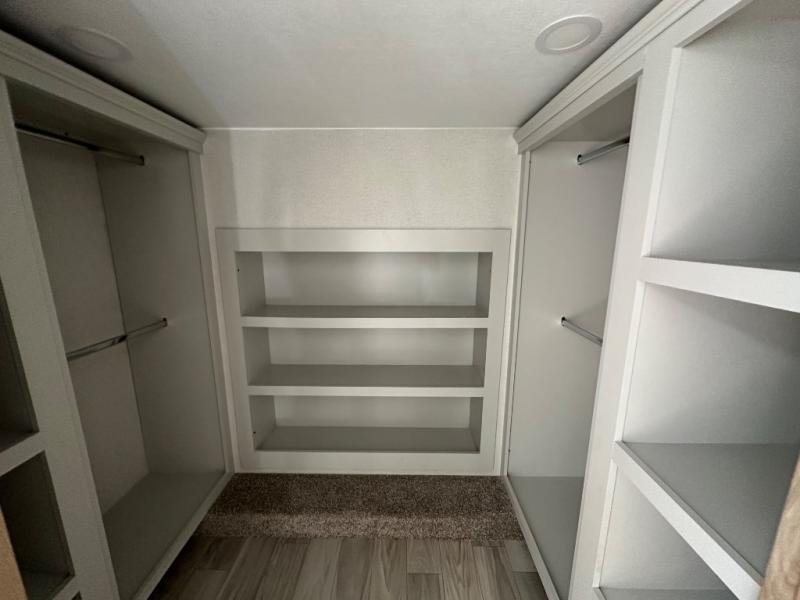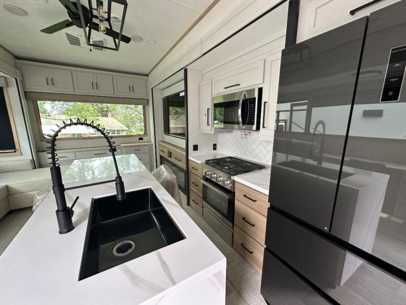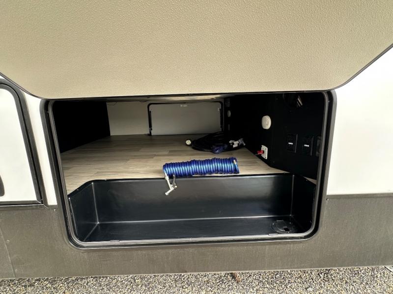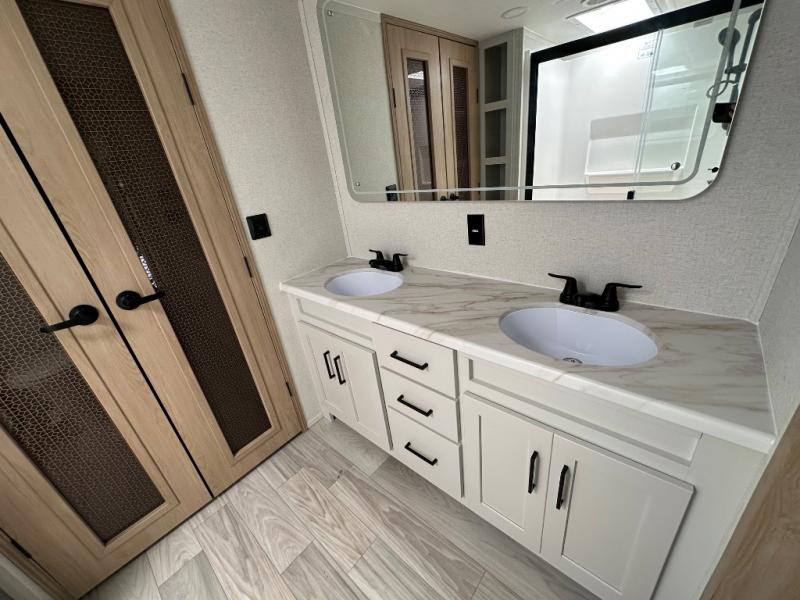 This fifth wheel is perfect for those seeking a comfortable, feature-rich home on wheels. Upon entering, you'll find a spacious rear living room, ideal for relaxation and entertainment. The room features a comfortable chase lounge, sofa, and an entertainment center with a cozy fireplace. For added convenience, there's a hidden pantry, desk with a chair, and a shelf and cabinet for storage. The kitchen is well-appointed with a stylish kitchen island featuring a beautiful waterfall edge. Overhead cabinets provide ample storage, while the microwave, 12V refrigerator, and four-burner cooktop make meal preparation a breeze. Plus, a butler pantry offers additional storage for kitchen essentials. A convenient half bath is located nearby, complete with a stackable washer and dryer prep if you want the option to add these appliances. The bedroom retreat features a comfortable king bed, a small dresser, and a tall dresser with a TV hookup. The adjacent walk-in bathroom closet boasts a one-piece fiberglass shower with a seat, dual sink, medicine cabinet, linen closet, and ample storage thanks to the various shelves, perfect for keeping your belongings organized. Exterior features include two awnings, one 12’ and the other 18’, providing ample shade and protection.
