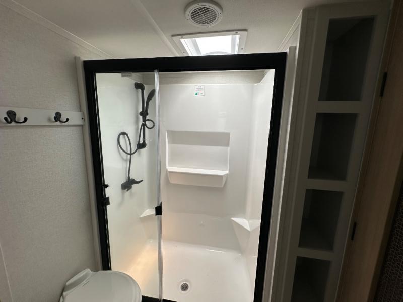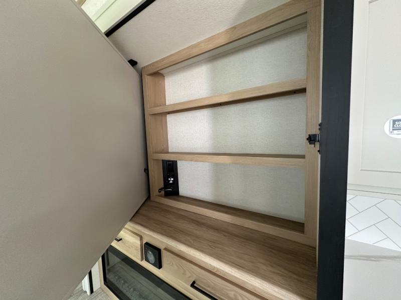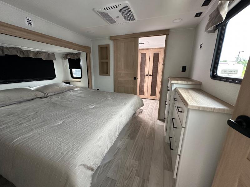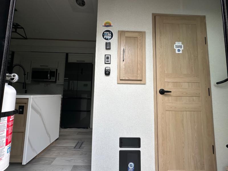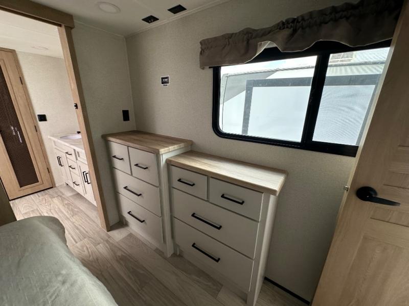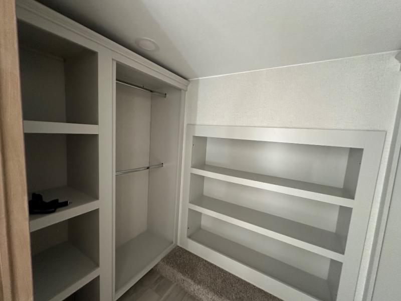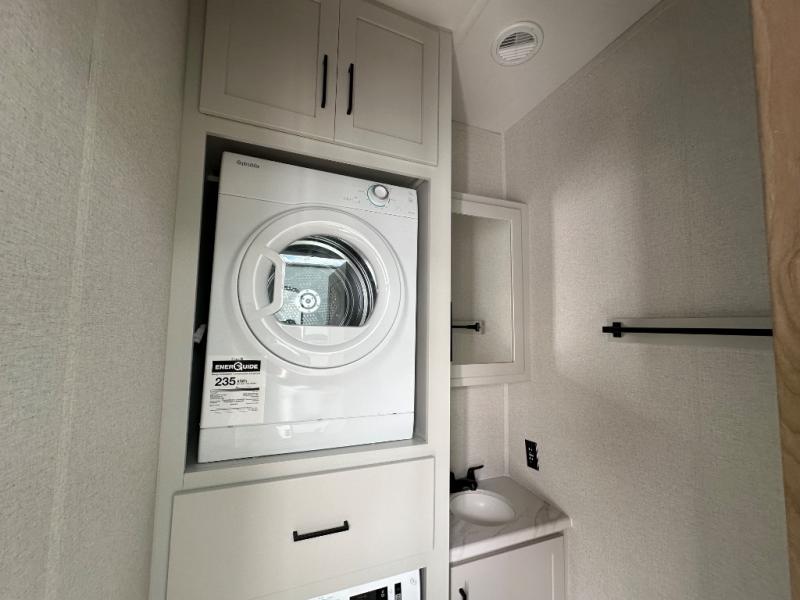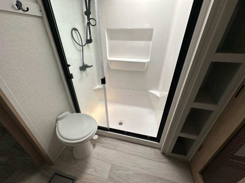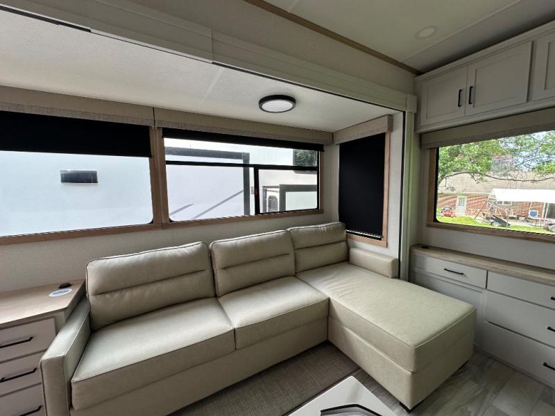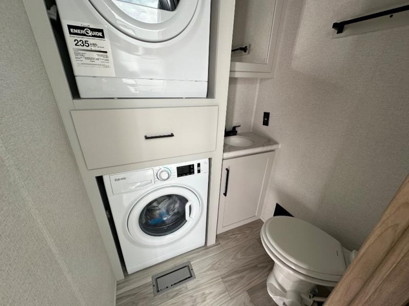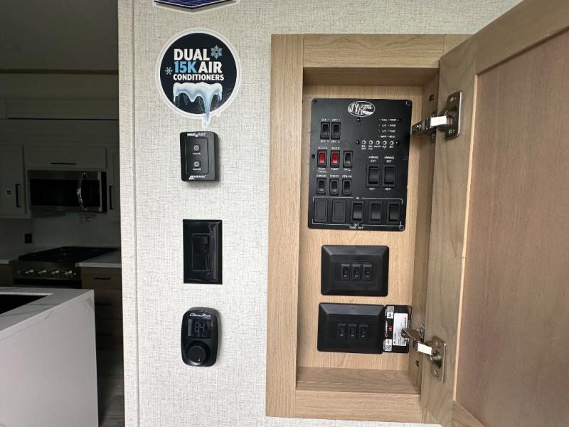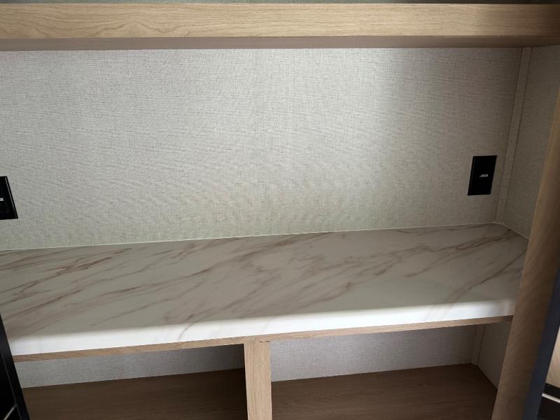 This fifth wheel is perfect for those seeking a comfortable, feature-rich home on wheels. Upon entering, you'll find a spacious rear living room, ideal for relaxation and entertainment. The room features a comfortable chase lounge, sofa, and an entertainment center with a cozy fireplace. For added convenience, there's a hidden pantry, desk with a chair, and a shelf and cabinet for storage. The kitchen is well-appointed with a stylish kitchen island featuring a beautiful waterfall edge. Overhead cabinets provide ample storage, while the microwave, 12V refrigerator, and four-burner cooktop make meal preparation a breeze. Plus, a butler pantry offers additional storage for kitchen essentials. A convenient half bath is located nearby, complete with a stackable washer and dryer prep if you want the option to add these appliances. The bedroom retreat features a comfortable king bed, a small dresser, and a tall dresser with a TV hookup. The adjacent walk-in bathroom closet boasts a one-piece fiberglass shower with a seat, dual sink, medicine cabinet, linen closet, and ample storage thanks to the various shelves, perfect for keeping your belongings organized. Exterior features include two awnings, one 12’ and the other 18’, providing ample shade and protection.