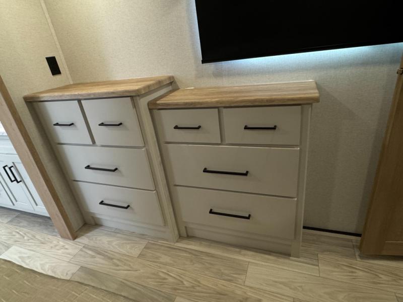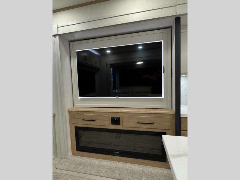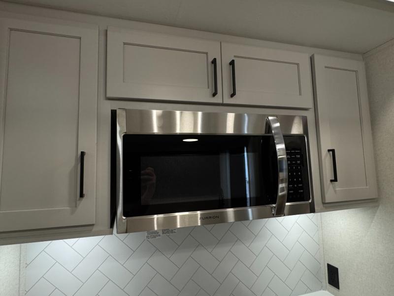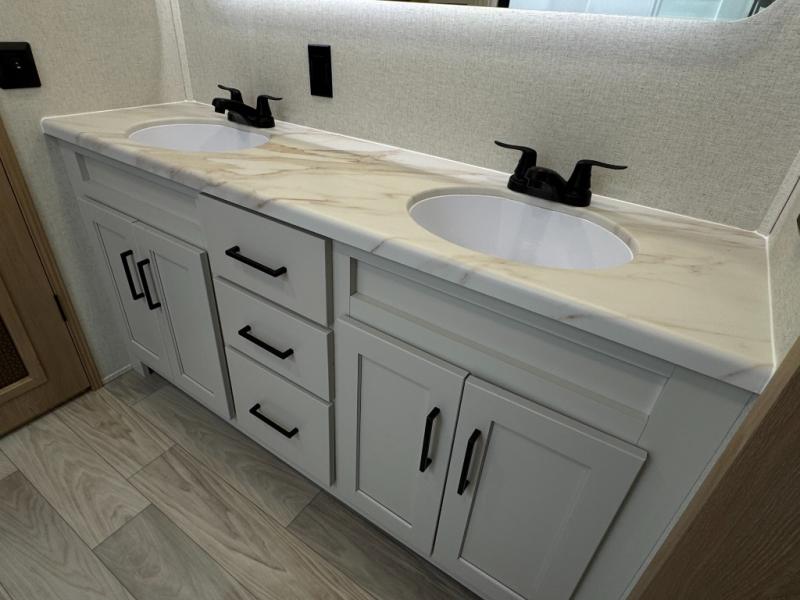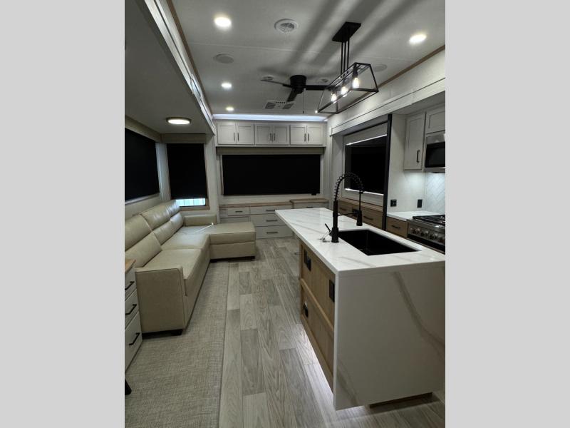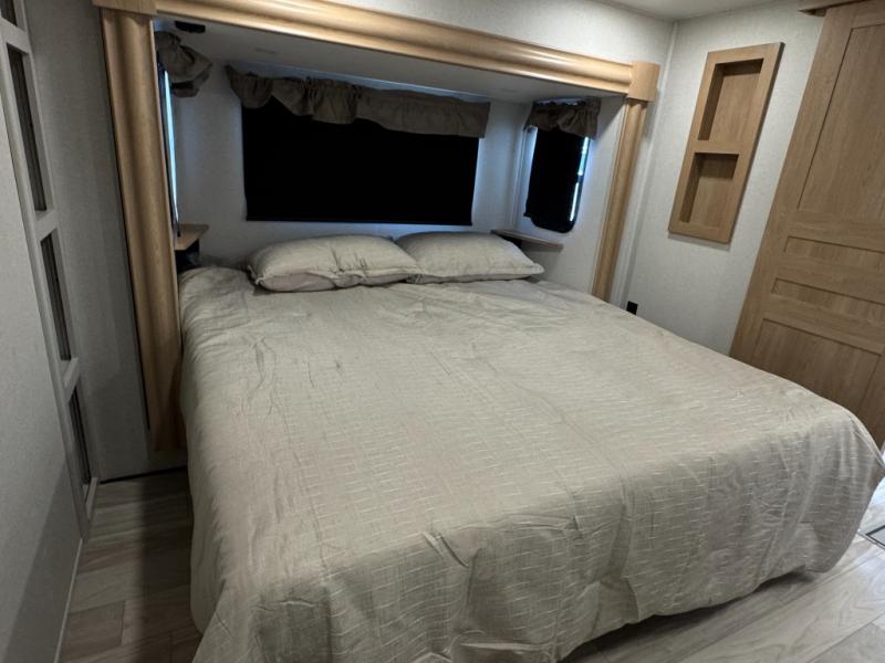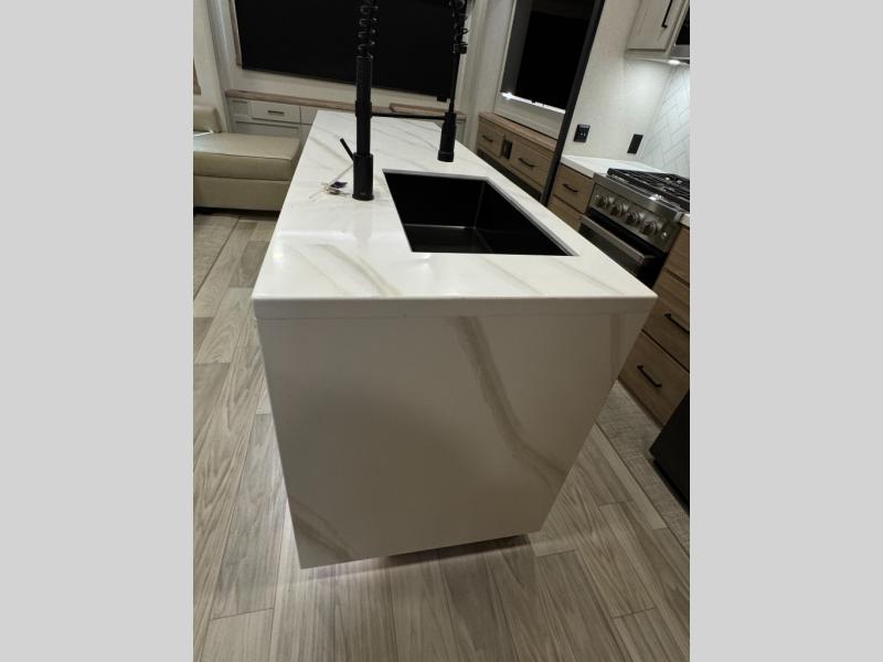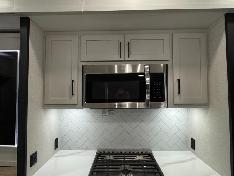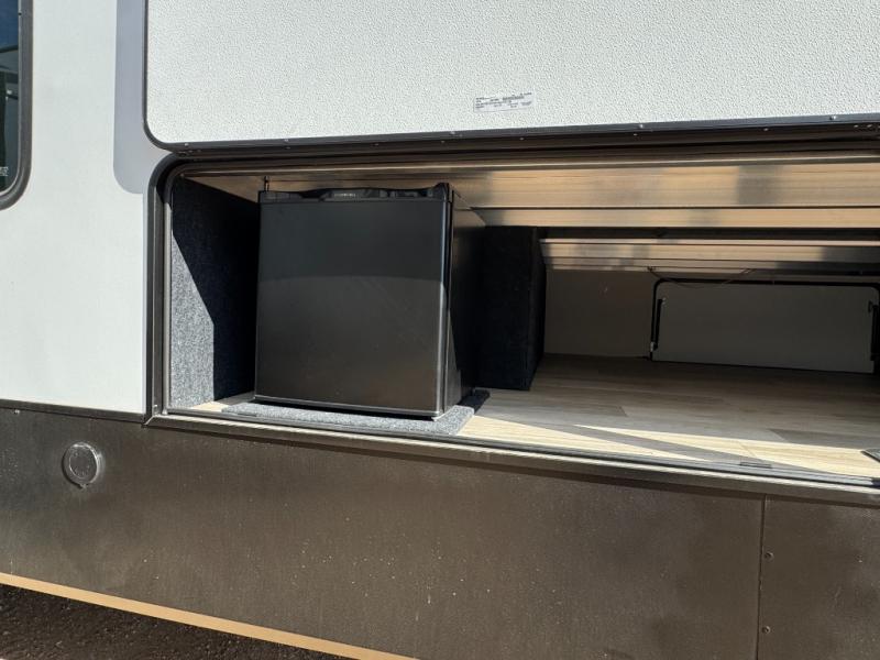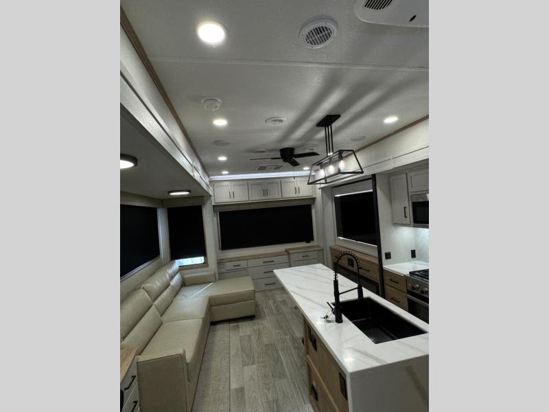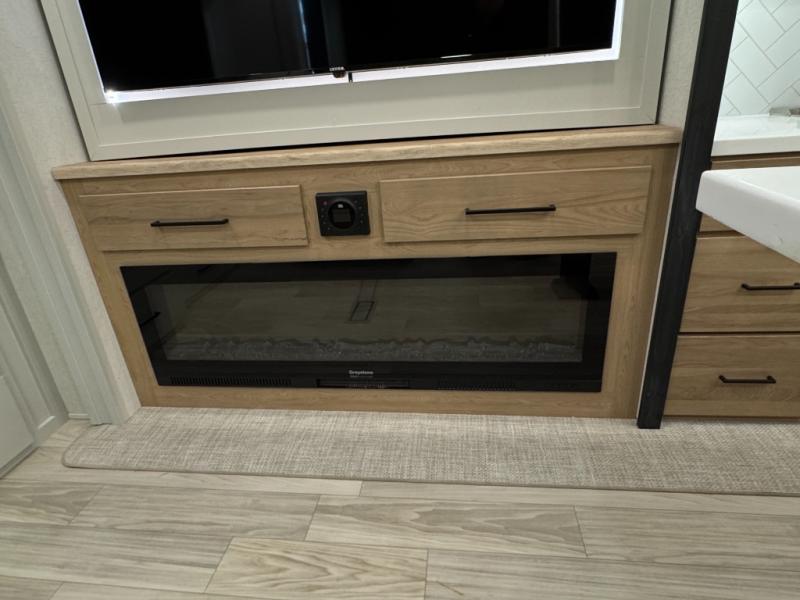 This fifth wheel is perfect for those seeking a comfortable, feature-rich home on wheels. Upon entering, you'll find a spacious rear living room, ideal for relaxation and entertainment. The room features a comfortable chase lounge, sofa, and an entertainment center with a cozy fireplace. For added convenience, there's a hidden pantry, desk with a chair, and a shelf and cabinet for storage. The kitchen is well-appointed with a stylish kitchen island featuring a beautiful waterfall edge. Overhead cabinets provide ample storage, while the microwave, 12V refrigerator, and four-burner cooktop make meal preparation a breeze. Plus, a butler pantry offers additional storage for kitchen essentials. A convenient half bath is located nearby, complete with a stackable washer and dryer prep if you want the option to add these appliances. The bedroom retreat features a comfortable king bed, a small dresser, and a tall dresser with a TV hookup. The adjacent walk-in bathroom closet boasts a one-piece fiberglass shower with a seat, dual sink, medicine cabinet, linen closet, and ample storage thanks to the various shelves, perfect for keeping your belongings organized. Exterior features include two awnings, one 12’ and the other 18’, providing ample shade and protection.