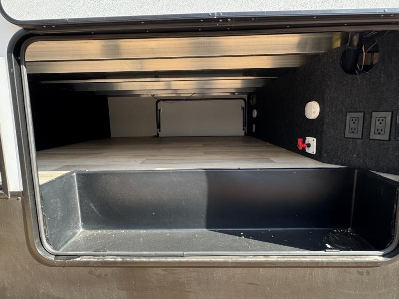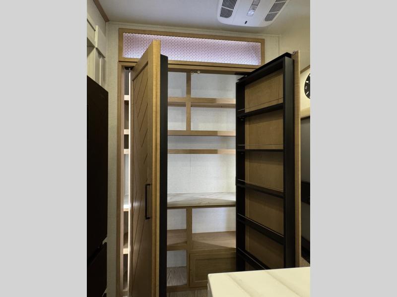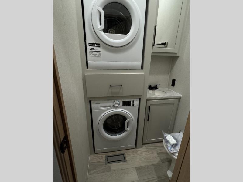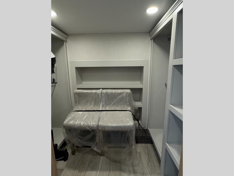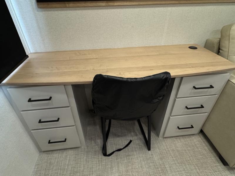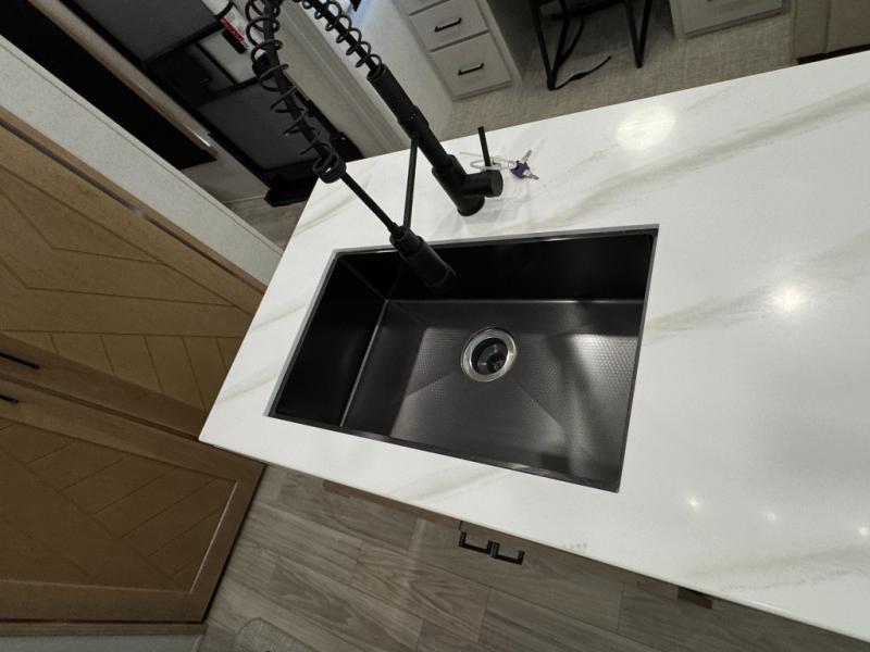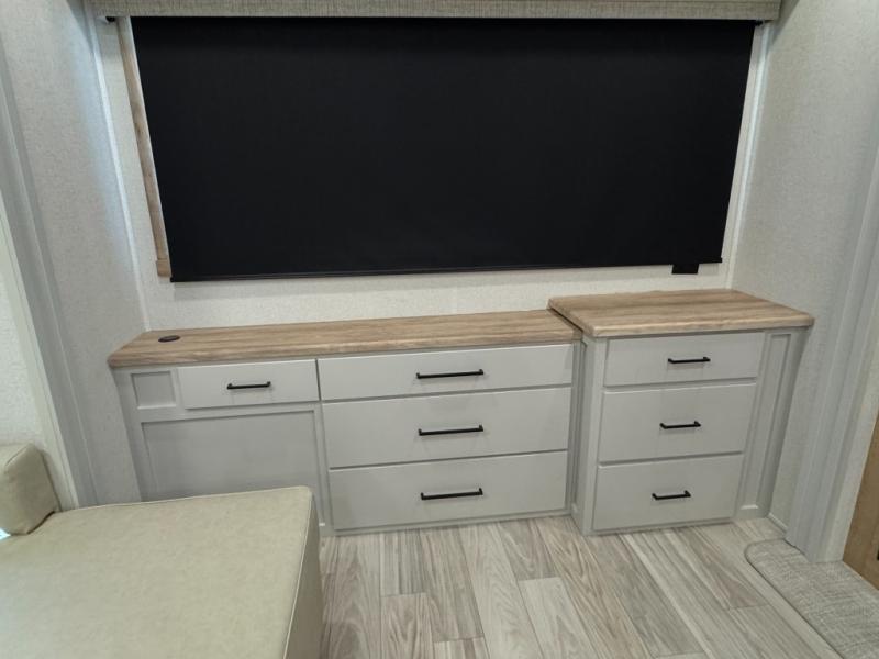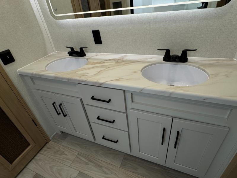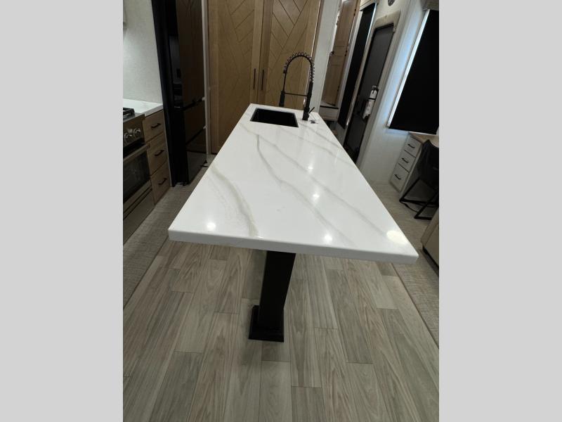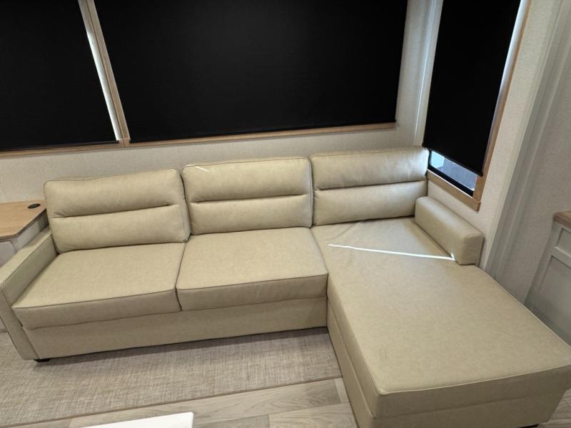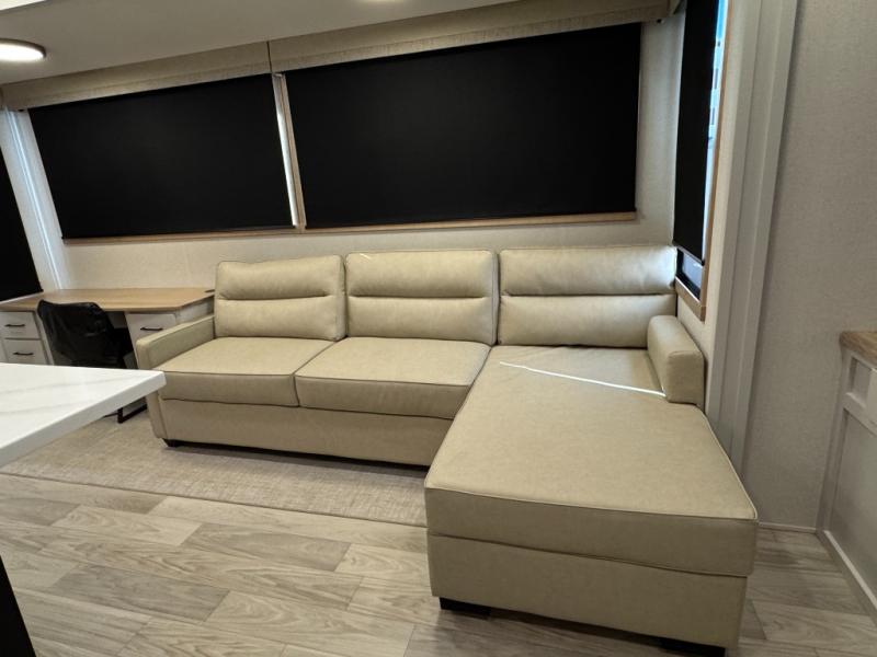 This fifth wheel is perfect for those seeking a comfortable, feature-rich home on wheels. Upon entering, you'll find a spacious rear living room, ideal for relaxation and entertainment. The room features a comfortable chase lounge, sofa, and an entertainment center with a cozy fireplace. For added convenience, there's a hidden pantry, desk with a chair, and a shelf and cabinet for storage. The kitchen is well-appointed with a stylish kitchen island featuring a beautiful waterfall edge. Overhead cabinets provide ample storage, while the microwave, 12V refrigerator, and four-burner cooktop make meal preparation a breeze. Plus, a butler pantry offers additional storage for kitchen essentials. A convenient half bath is located nearby, complete with a stackable washer and dryer prep if you want the option to add these appliances. The bedroom retreat features a comfortable king bed, a small dresser, and a tall dresser with a TV hookup. The adjacent walk-in bathroom closet boasts a one-piece fiberglass shower with a seat, dual sink, medicine cabinet, linen closet, and ample storage thanks to the various shelves, perfect for keeping your belongings organized. Exterior features include two awnings, one 12’ and the other 18’, providing ample shade and protection.