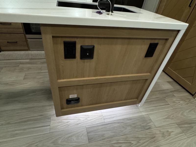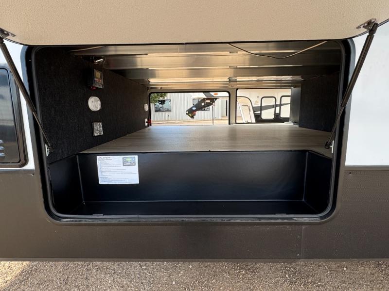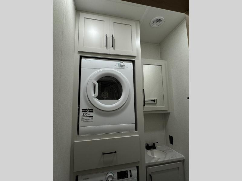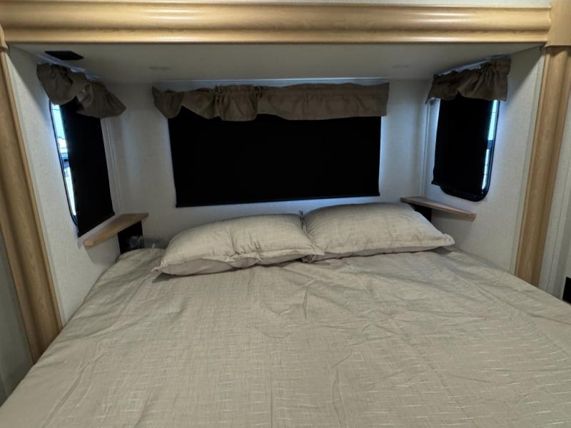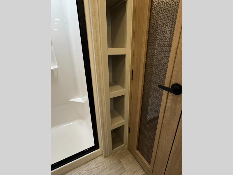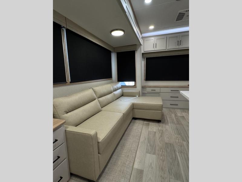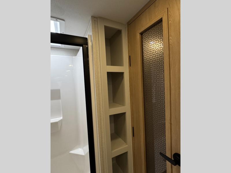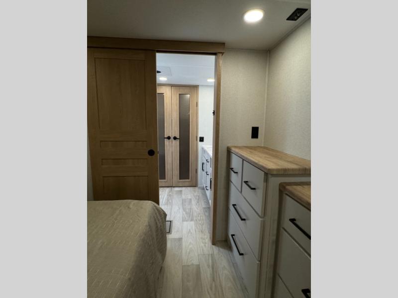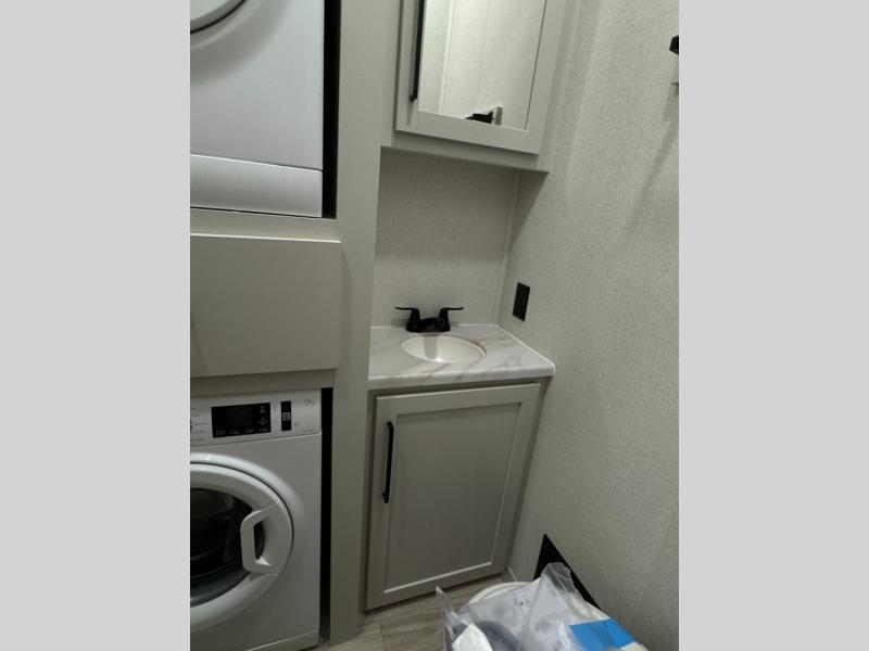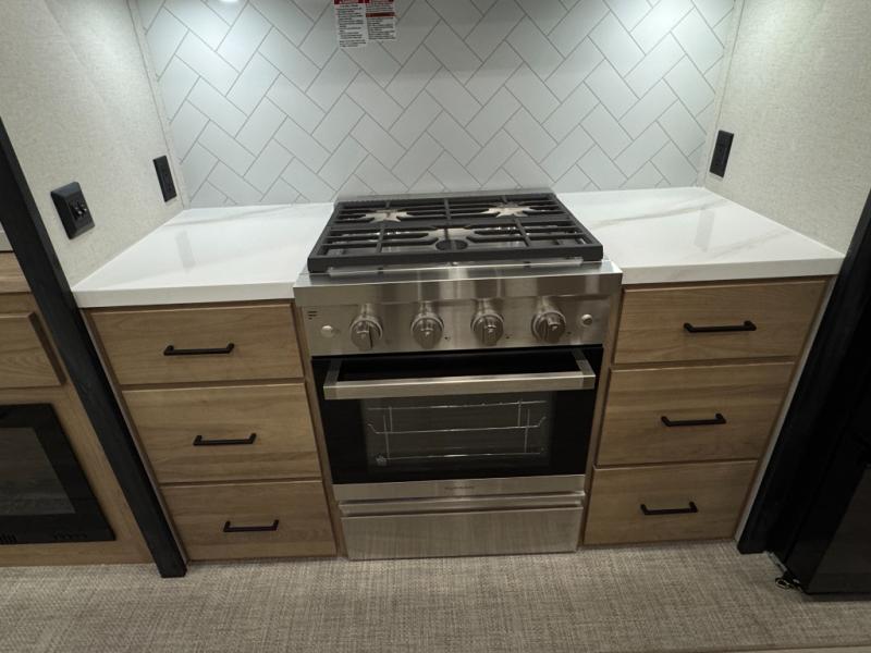 This fifth wheel is perfect for those seeking a comfortable, feature-rich home on wheels. Upon entering, you'll find a spacious rear living room, ideal for relaxation and entertainment. The room features a comfortable chase lounge, sofa, and an entertainment center with a cozy fireplace. For added convenience, there's a hidden pantry, desk with a chair, and a shelf and cabinet for storage. The kitchen is well-appointed with a stylish kitchen island featuring a beautiful waterfall edge. Overhead cabinets provide ample storage, while the microwave, 12V refrigerator, and four-burner cooktop make meal preparation a breeze. Plus, a butler pantry offers additional storage for kitchen essentials. A convenient half bath is located nearby, complete with a stackable washer and dryer prep if you want the option to add these appliances. The bedroom retreat features a comfortable king bed, a small dresser, and a tall dresser with a TV hookup. The adjacent walk-in bathroom closet boasts a one-piece fiberglass shower with a seat, dual sink, medicine cabinet, linen closet, and ample storage thanks to the various shelves, perfect for keeping your belongings organized. Exterior features include two awnings, one 12’ and the other 18’, providing ample shade and protection.