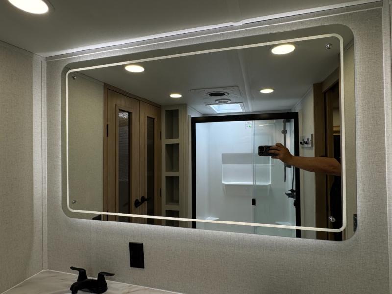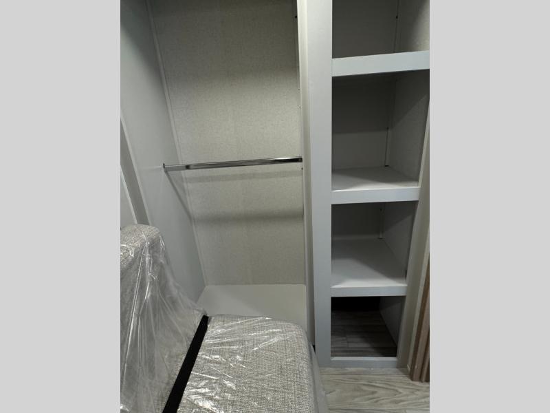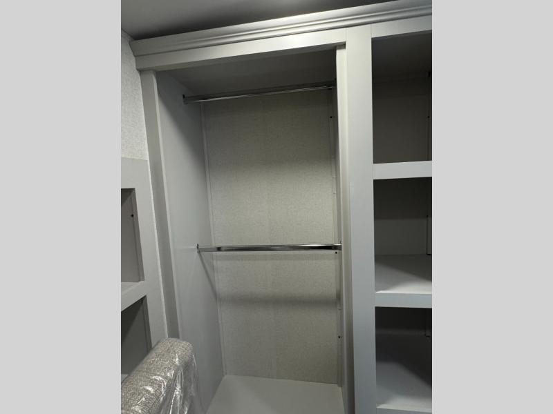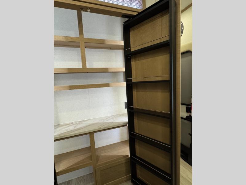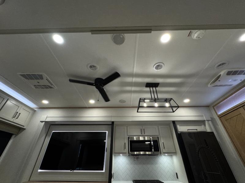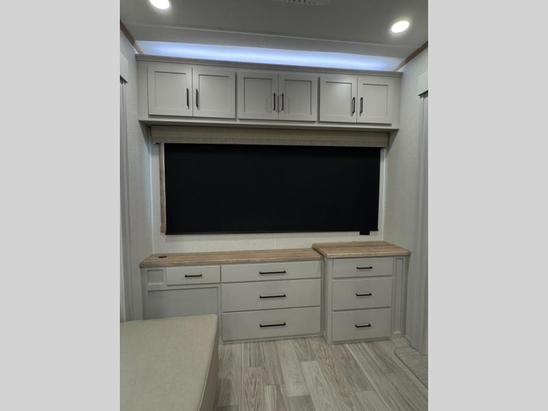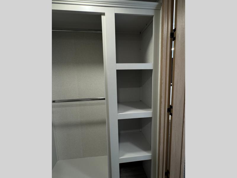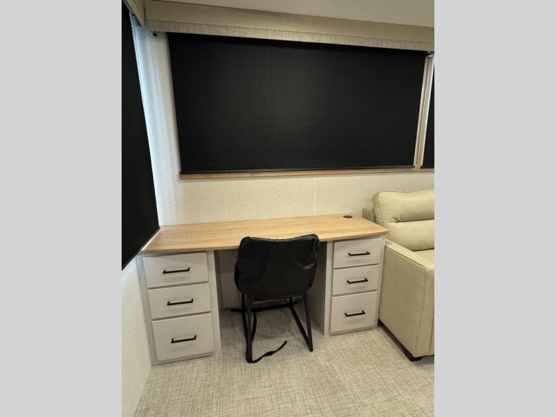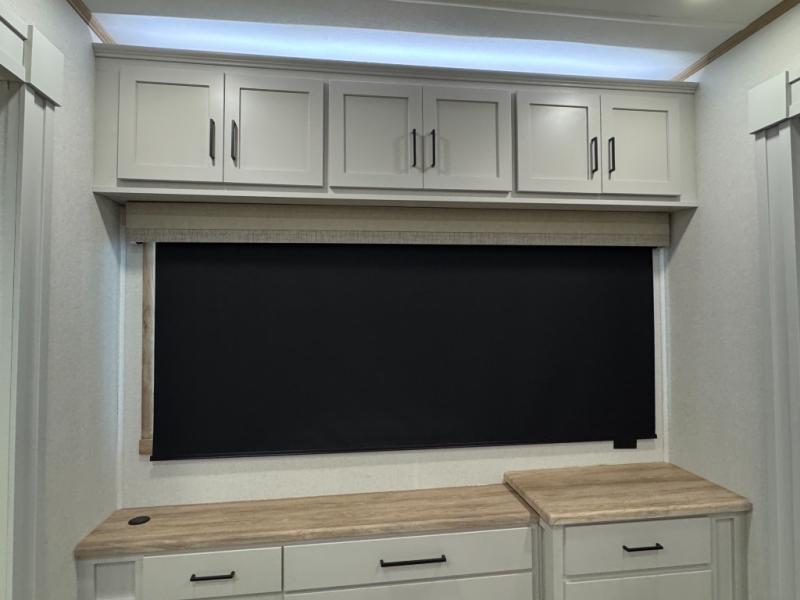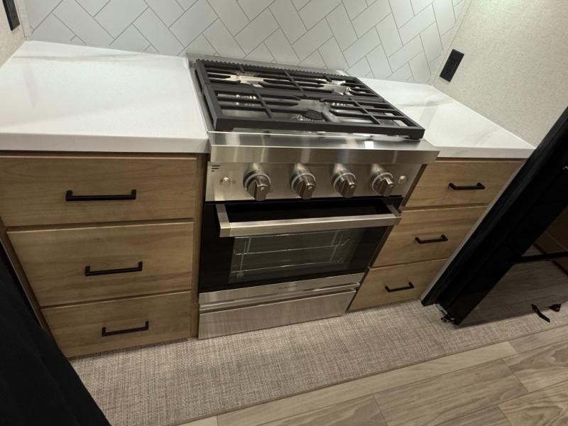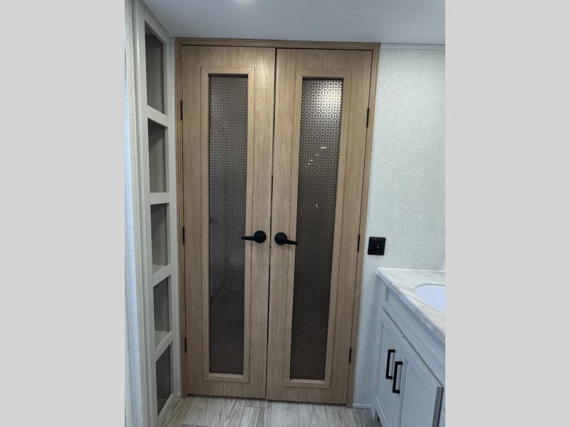 This fifth wheel is perfect for those seeking a comfortable, feature-rich home on wheels. Upon entering, you'll find a spacious rear living room, ideal for relaxation and entertainment. The room features a comfortable chase lounge, sofa, and an entertainment center with a cozy fireplace. For added convenience, there's a hidden pantry, desk with a chair, and a shelf and cabinet for storage. The kitchen is well-appointed with a stylish kitchen island featuring a beautiful waterfall edge. Overhead cabinets provide ample storage, while the microwave, 12V refrigerator, and four-burner cooktop make meal preparation a breeze. Plus, a butler pantry offers additional storage for kitchen essentials. A convenient half bath is located nearby, complete with a stackable washer and dryer prep if you want the option to add these appliances. The bedroom retreat features a comfortable king bed, a small dresser, and a tall dresser with a TV hookup. The adjacent walk-in bathroom closet boasts a one-piece fiberglass shower with a seat, dual sink, medicine cabinet, linen closet, and ample storage thanks to the various shelves, perfect for keeping your belongings organized. Exterior features include two awnings, one 12’ and the other 18’, providing ample shade and protection.