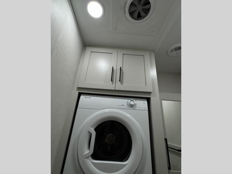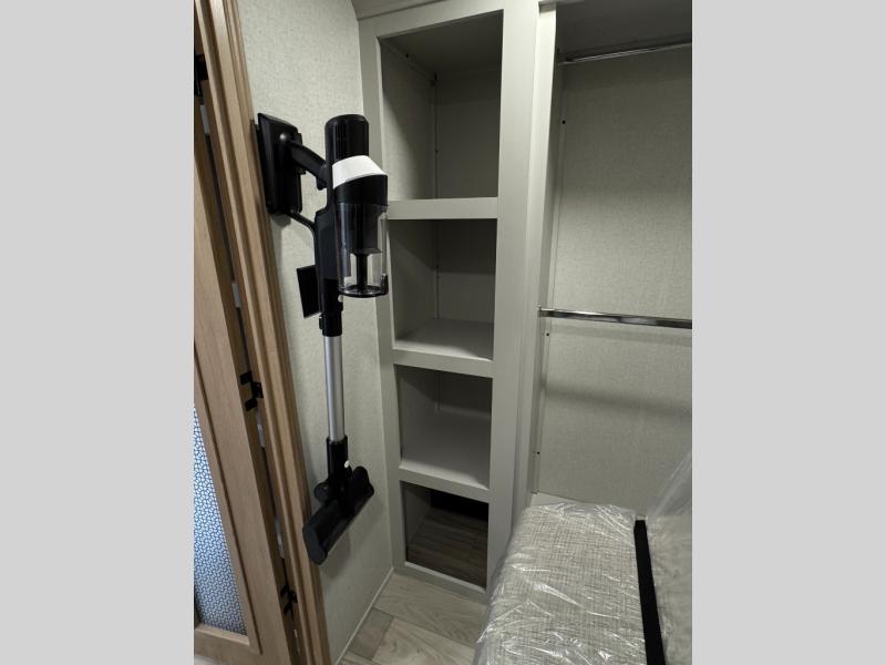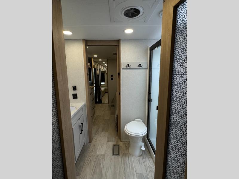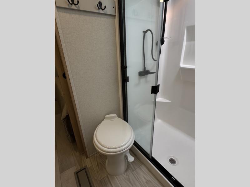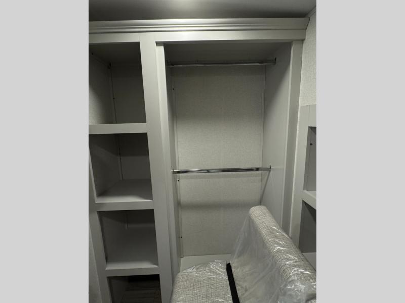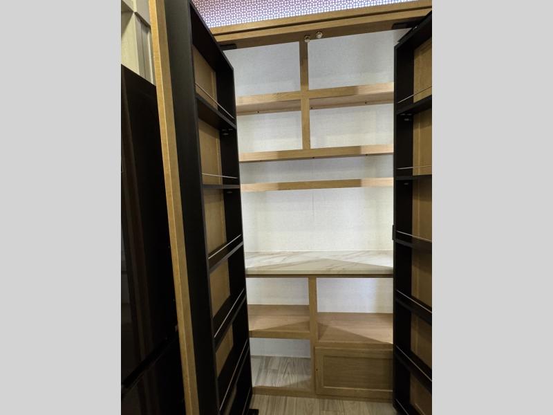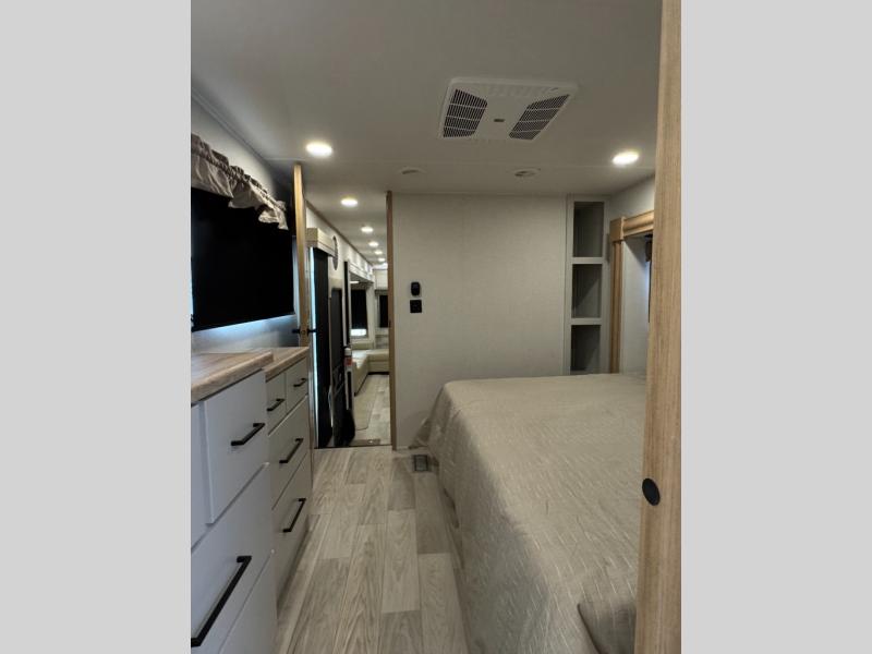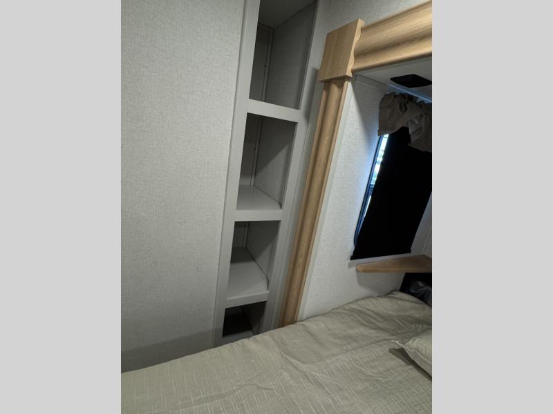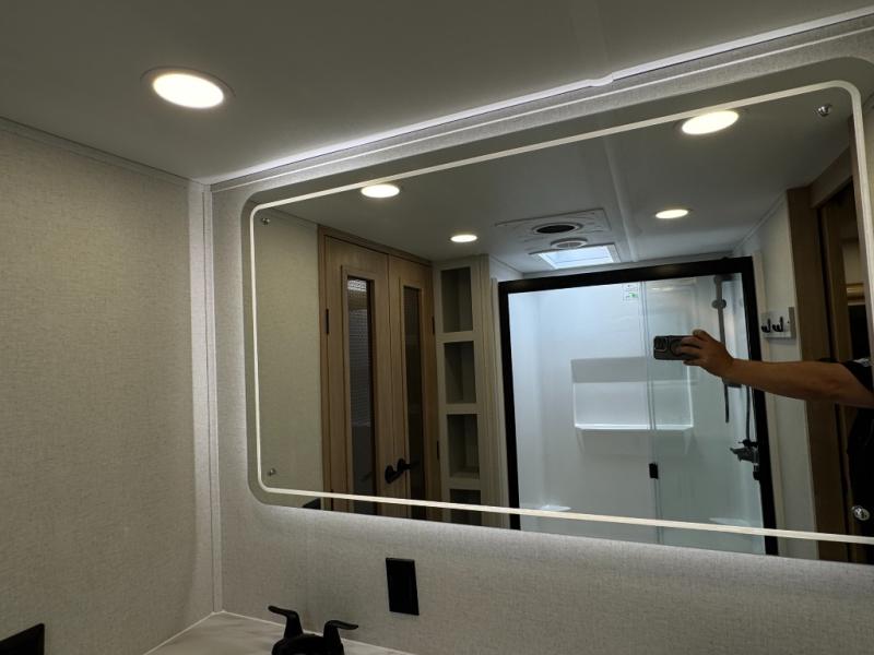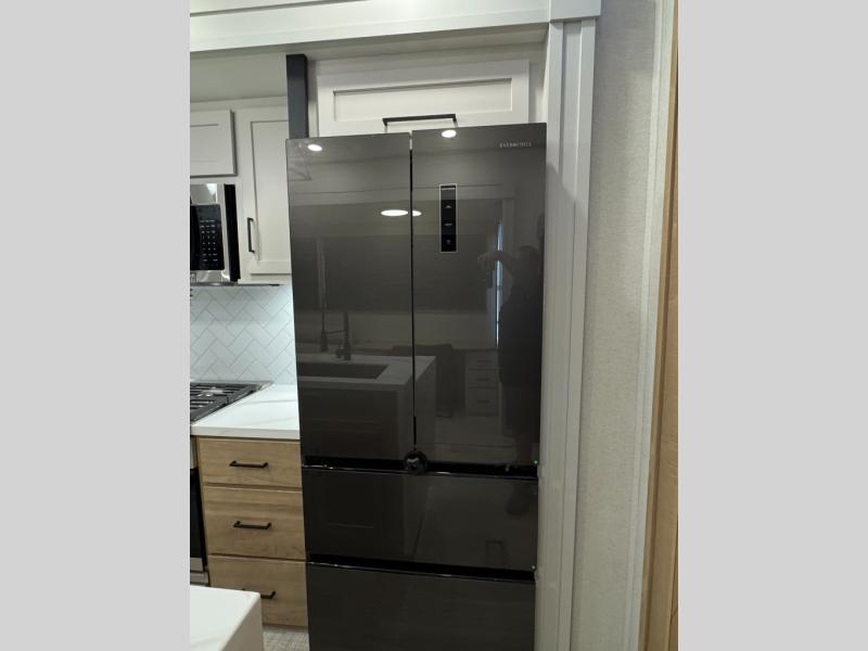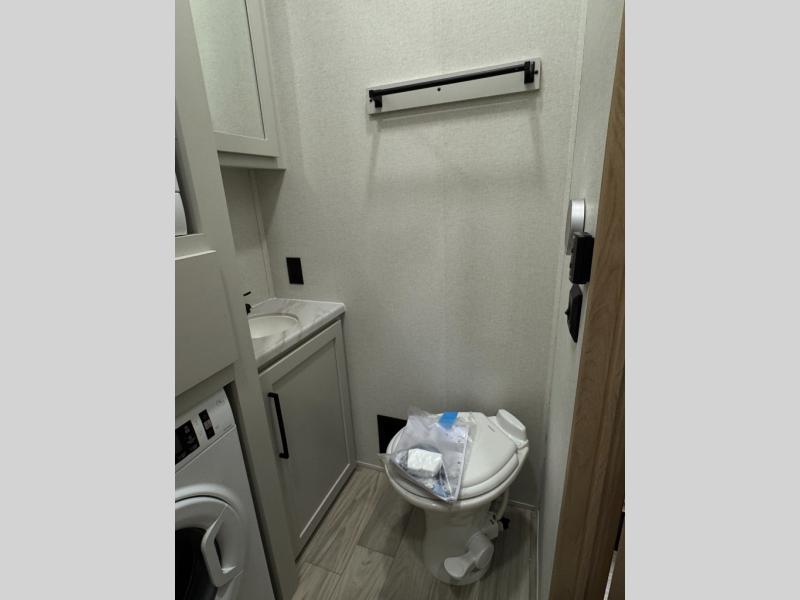 This fifth wheel is perfect for those seeking a comfortable, feature-rich home on wheels. Upon entering, you'll find a spacious rear living room, ideal for relaxation and entertainment. The room features a comfortable chase lounge, sofa, and an entertainment center with a cozy fireplace. For added convenience, there's a hidden pantry, desk with a chair, and a shelf and cabinet for storage. The kitchen is well-appointed with a stylish kitchen island featuring a beautiful waterfall edge. Overhead cabinets provide ample storage, while the microwave, 12V refrigerator, and four-burner cooktop make meal preparation a breeze. Plus, a butler pantry offers additional storage for kitchen essentials. A convenient half bath is located nearby, complete with a stackable washer and dryer prep if you want the option to add these appliances. The bedroom retreat features a comfortable king bed, a small dresser, and a tall dresser with a TV hookup. The adjacent walk-in bathroom closet boasts a one-piece fiberglass shower with a seat, dual sink, medicine cabinet, linen closet, and ample storage thanks to the various shelves, perfect for keeping your belongings organized. Exterior features include two awnings, one 12’ and the other 18’, providing ample shade and protection.