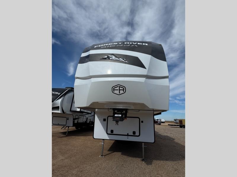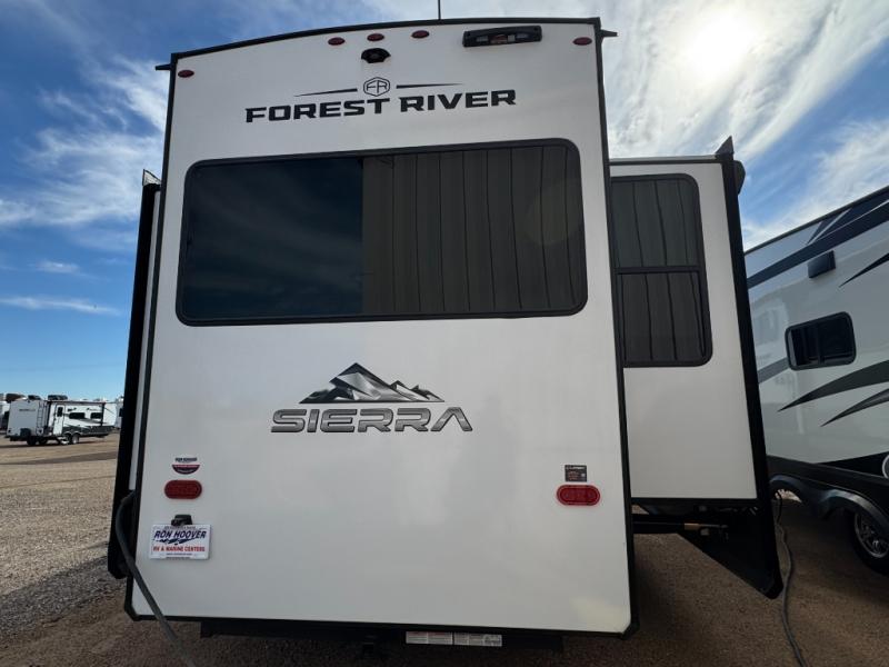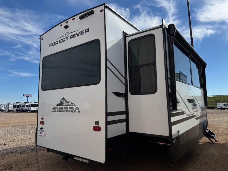 Each one of these Forest River Sierra fifth wheels are equipped with everything you need to make the most of each adventure! The underbelly armor will protect your unit's vitals from road debris and the painted two tone aerodynamic fiberglass front cap has an improved turning radius to make them easier to navigate. With an electric leveling system, you can set your unit up quick and easy then get to having fun faster than ever. The welded aluminum framed, vacuum bonded laminated superstructure will hold up through every adventure and the cambered powder coated frame comes with rust prohibitor to last longer. Each model also includes the Summit Package that comes with a king Wi-Fi extender system and Olympus antenna, a full coach water filter system, Goodyear tires with 7,000 lb. axles, and the list goes on. The interior is just as impressive with rustic wood plank linoleum, recessed residential lighting, a memory foam mattress, and mocha accent crown molding over the kitchen cabinets!