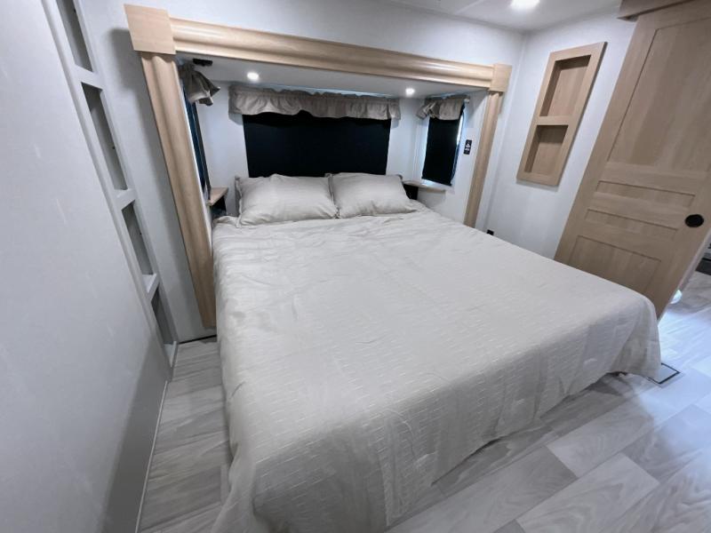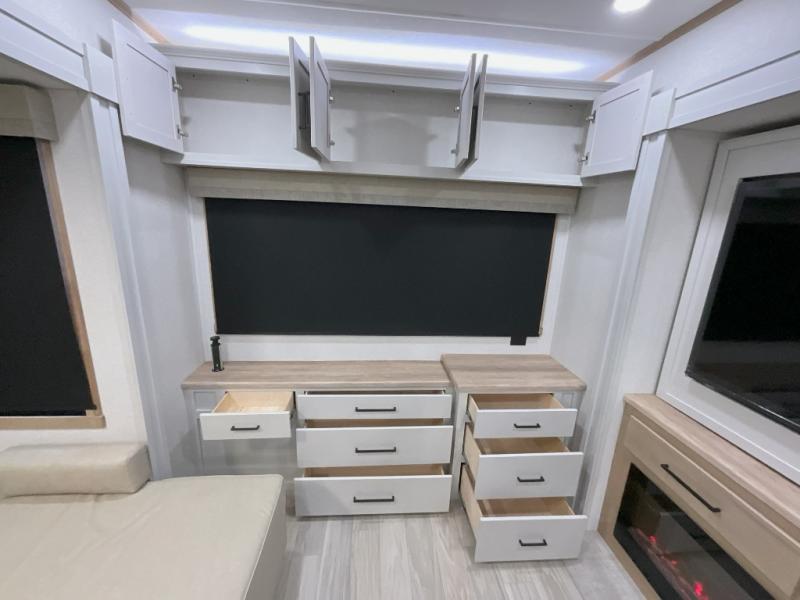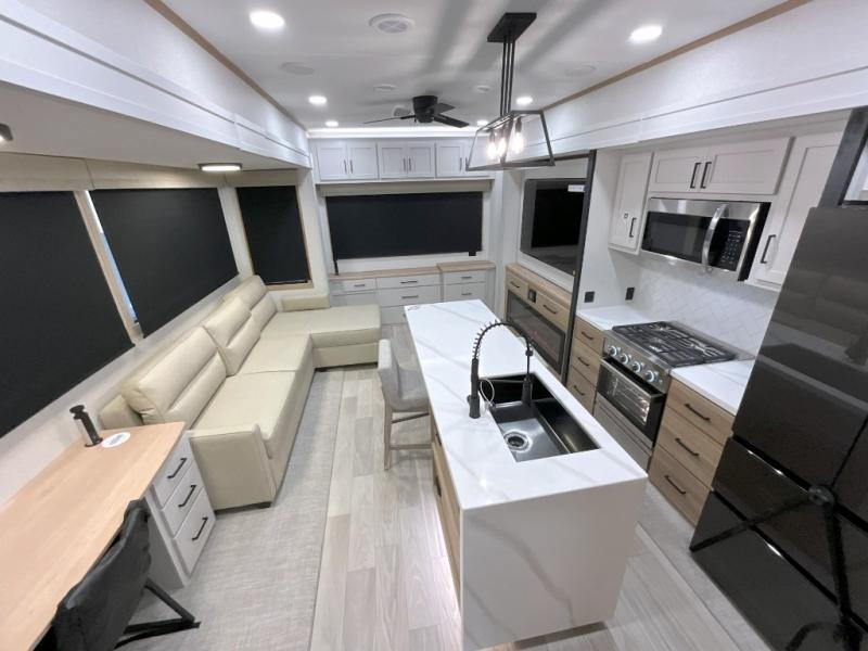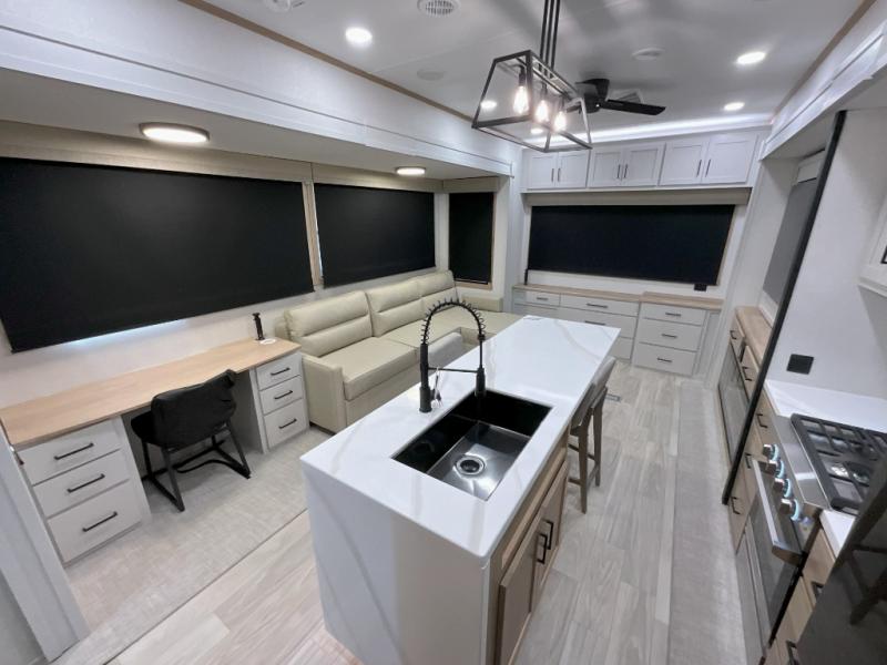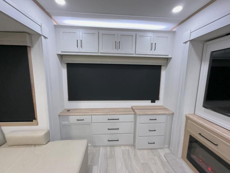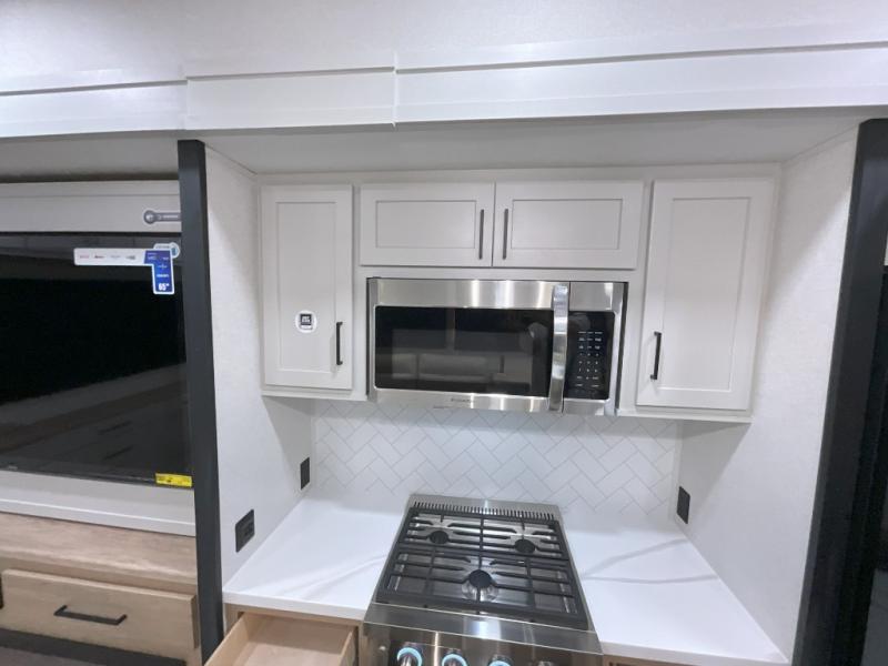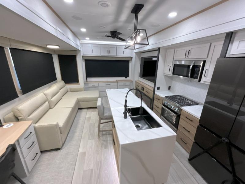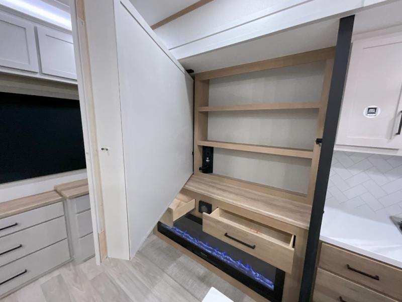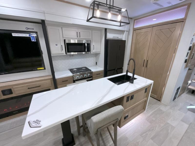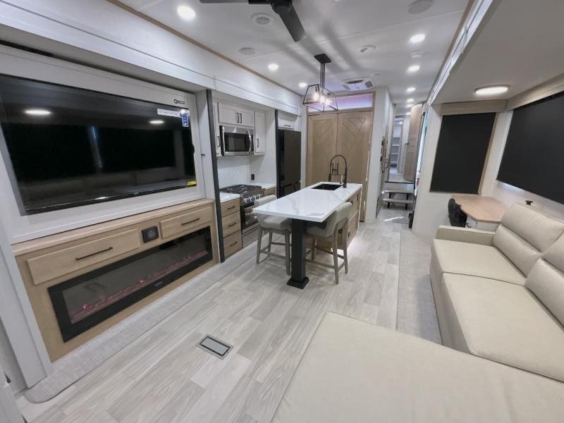 This fifth wheel is perfect for those seeking a comfortable, feature-rich home on wheels. Upon entering, you'll find a spacious rear living room, ideal for relaxation and entertainment. The room features a comfortable chase lounge, sofa, and an entertainment center with a cozy fireplace. For added convenience, there's a hidden pantry, desk with a chair, and a shelf and cabinet for storage. The kitchen is well-appointed with a stylish kitchen island featuring a beautiful waterfall edge. Overhead cabinets provide ample storage, while the microwave, 12V refrigerator, and four-burner cooktop make meal preparation a breeze. Plus, a butler pantry offers additional storage for kitchen essentials. A convenient half bath is located nearby, complete with a stackable washer and dryer prep if you want the option to add these appliances. The bedroom retreat features a comfortable king bed, a small dresser, and a tall dresser with a TV hookup. The adjacent walk-in bathroom closet boasts a one-piece fiberglass shower with a seat, dual sink, medicine cabinet, linen closet, and ample storage thanks to the various shelves, perfect for keeping your belongings organized. Exterior features include two awnings, one 12’ and the other 18’, providing ample shade and protection.