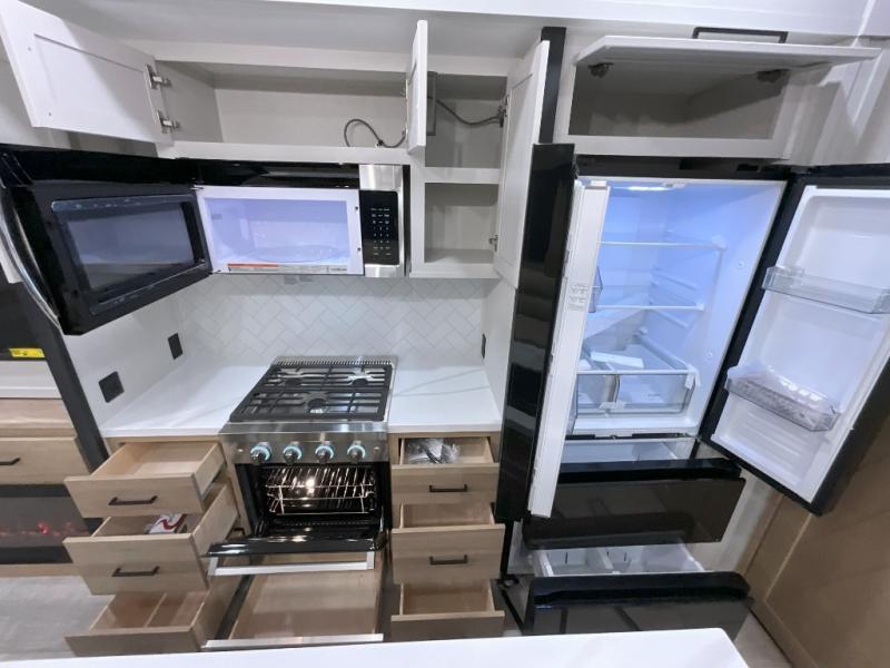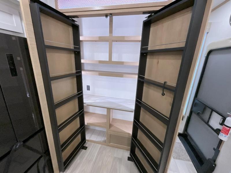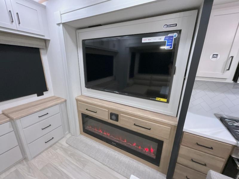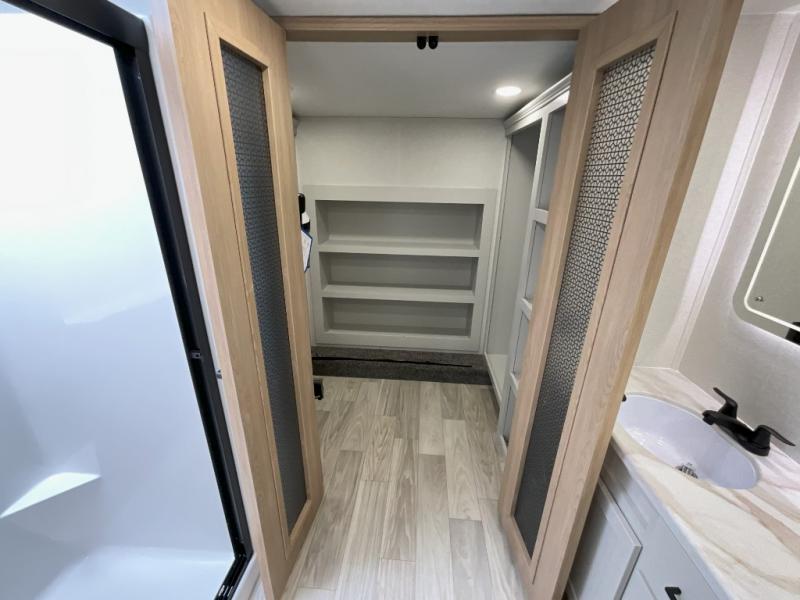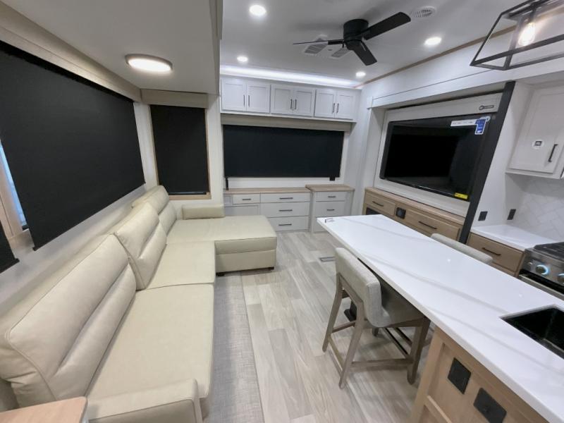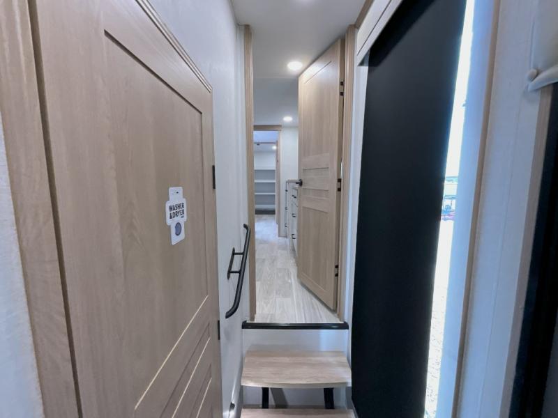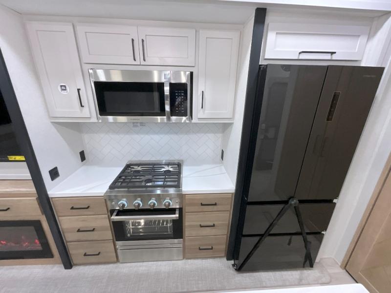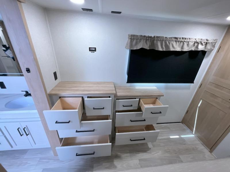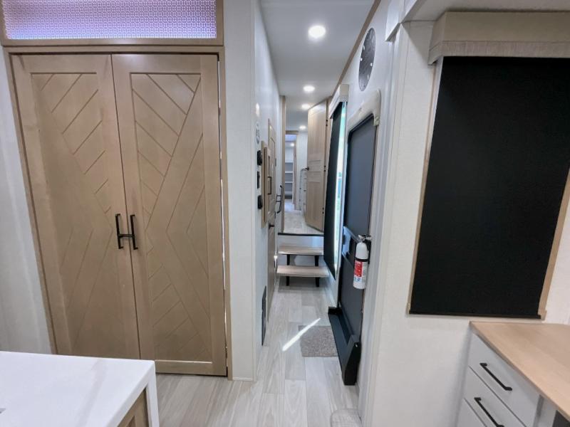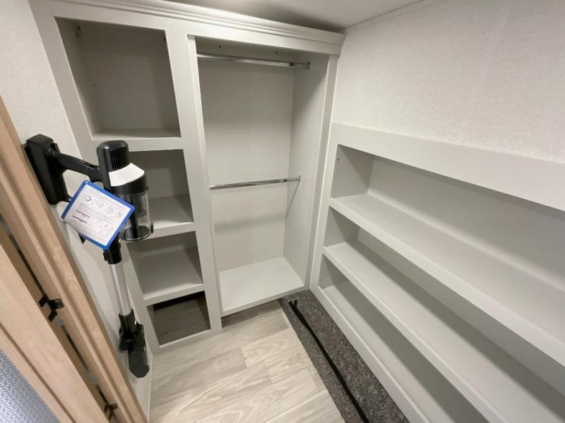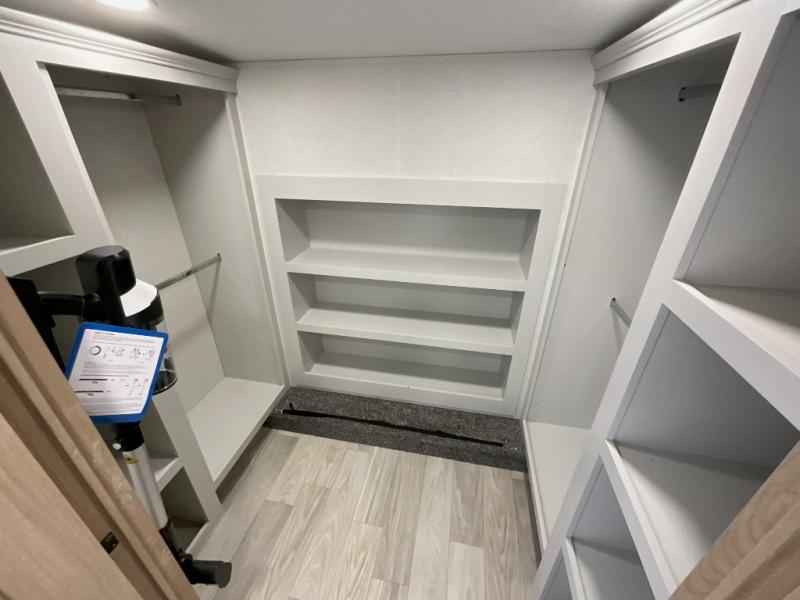 This fifth wheel is perfect for those seeking a comfortable, feature-rich home on wheels. Upon entering, you'll find a spacious rear living room, ideal for relaxation and entertainment. The room features a comfortable chase lounge, sofa, and an entertainment center with a cozy fireplace. For added convenience, there's a hidden pantry, desk with a chair, and a shelf and cabinet for storage. The kitchen is well-appointed with a stylish kitchen island featuring a beautiful waterfall edge. Overhead cabinets provide ample storage, while the microwave, 12V refrigerator, and four-burner cooktop make meal preparation a breeze. Plus, a butler pantry offers additional storage for kitchen essentials. A convenient half bath is located nearby, complete with a stackable washer and dryer prep if you want the option to add these appliances. The bedroom retreat features a comfortable king bed, a small dresser, and a tall dresser with a TV hookup. The adjacent walk-in bathroom closet boasts a one-piece fiberglass shower with a seat, dual sink, medicine cabinet, linen closet, and ample storage thanks to the various shelves, perfect for keeping your belongings organized. Exterior features include two awnings, one 12’ and the other 18’, providing ample shade and protection.