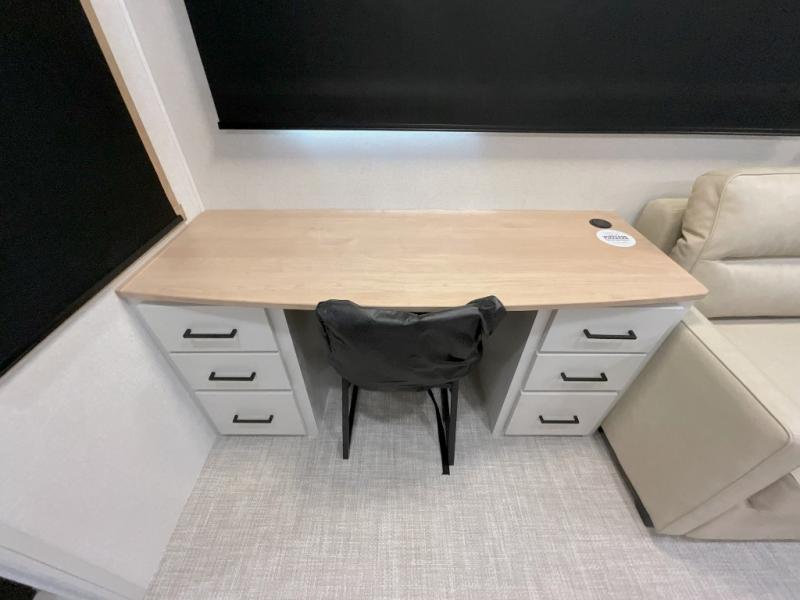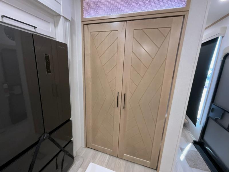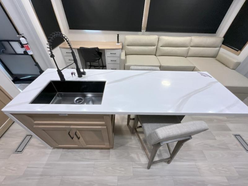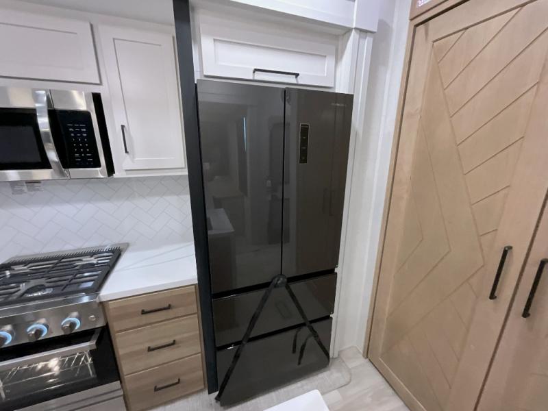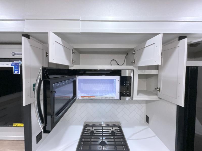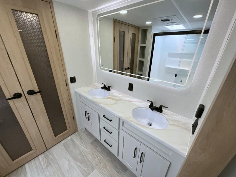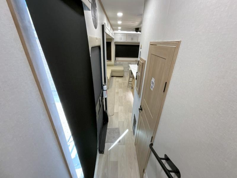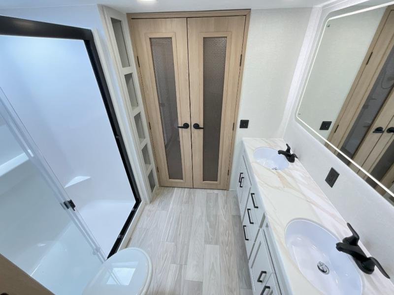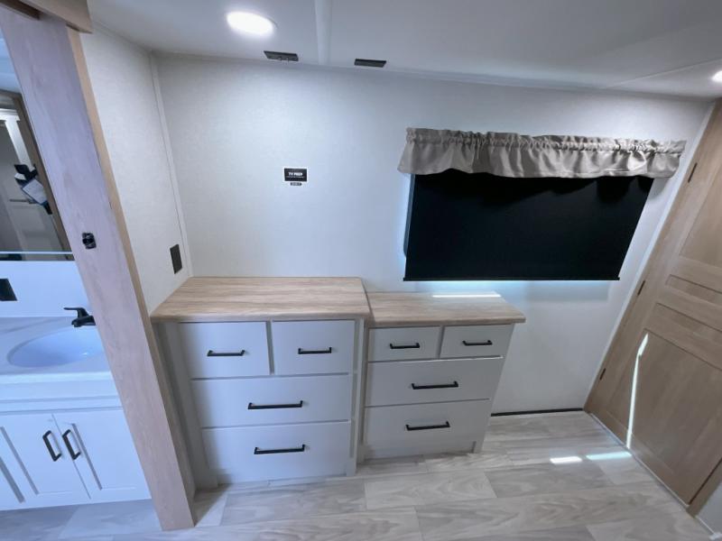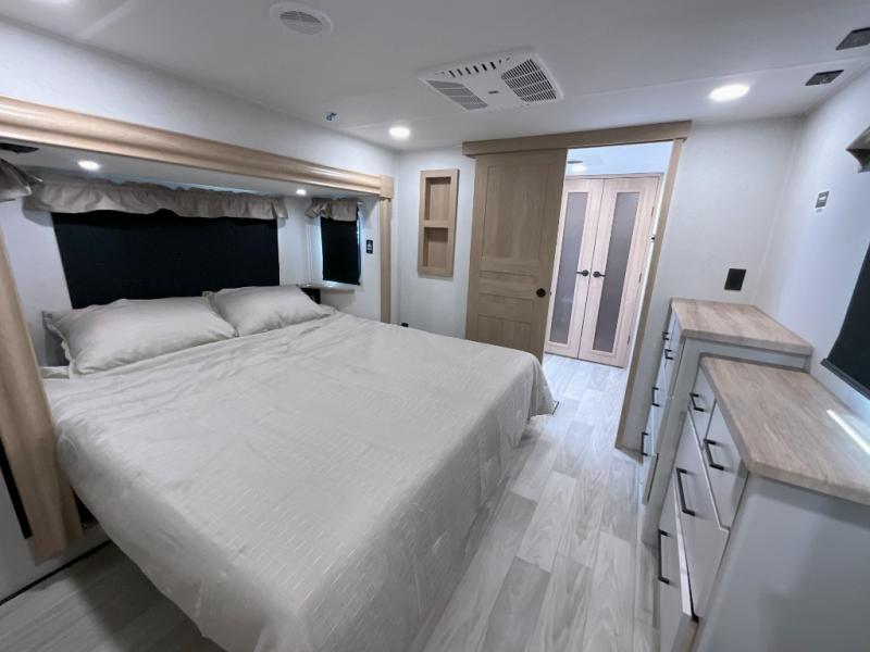 This fifth wheel is perfect for those seeking a comfortable, feature-rich home on wheels. Upon entering, you'll find a spacious rear living room, ideal for relaxation and entertainment. The room features a comfortable chase lounge, sofa, and an entertainment center with a cozy fireplace. For added convenience, there's a hidden pantry, desk with a chair, and a shelf and cabinet for storage. The kitchen is well-appointed with a stylish kitchen island featuring a beautiful waterfall edge. Overhead cabinets provide ample storage, while the microwave, 12V refrigerator, and four-burner cooktop make meal preparation a breeze. Plus, a butler pantry offers additional storage for kitchen essentials. A convenient half bath is located nearby, complete with a stackable washer and dryer prep if you want the option to add these appliances. The bedroom retreat features a comfortable king bed, a small dresser, and a tall dresser with a TV hookup. The adjacent walk-in bathroom closet boasts a one-piece fiberglass shower with a seat, dual sink, medicine cabinet, linen closet, and ample storage thanks to the various shelves, perfect for keeping your belongings organized. Exterior features include two awnings, one 12’ and the other 18’, providing ample shade and protection.