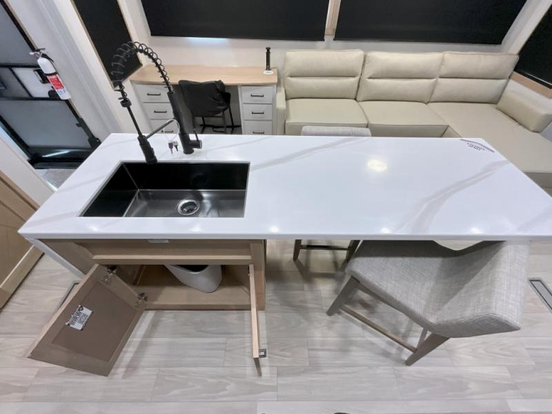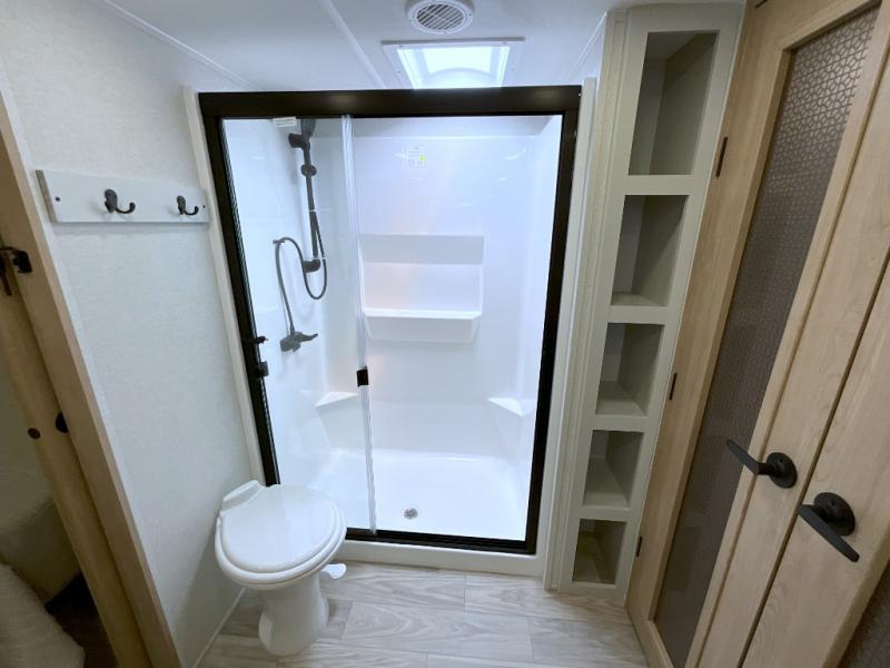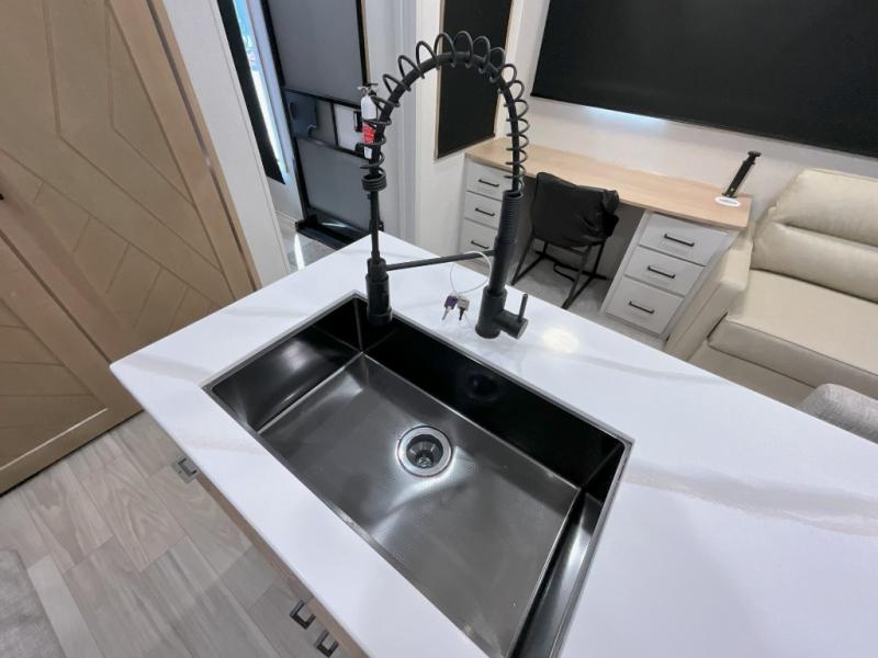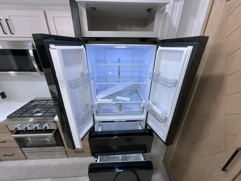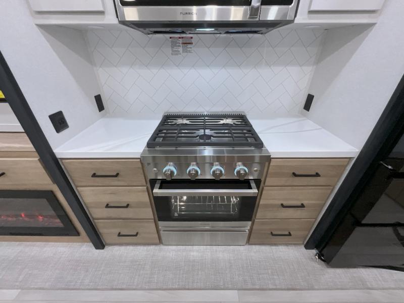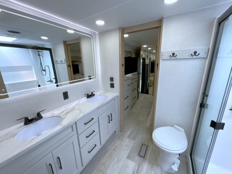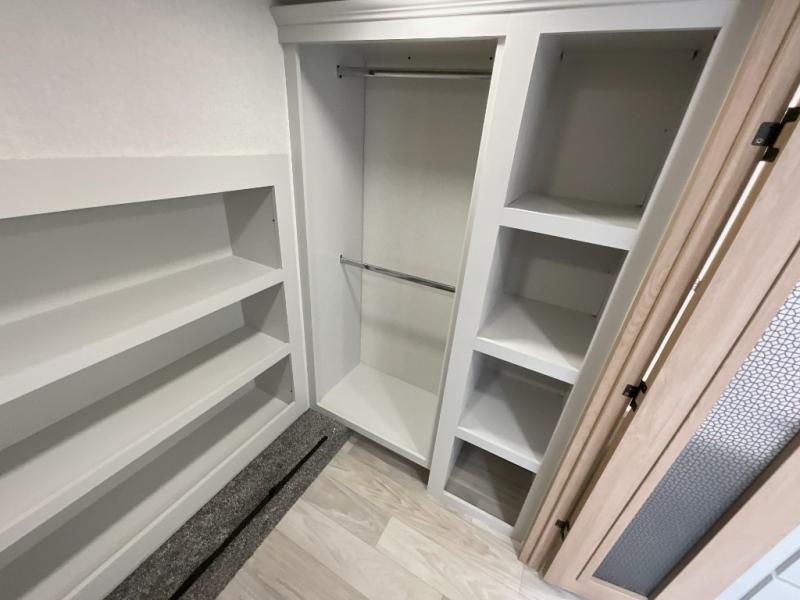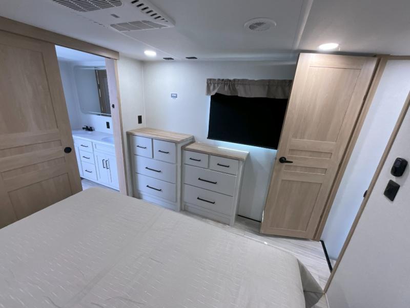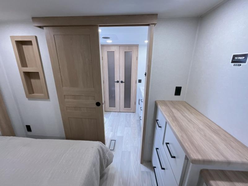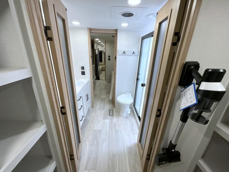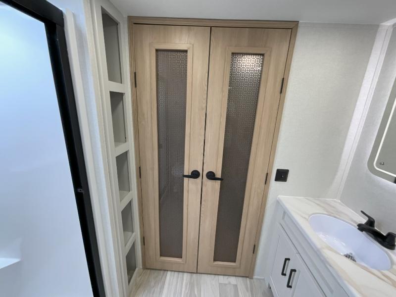 This fifth wheel is perfect for those seeking a comfortable, feature-rich home on wheels. Upon entering, you'll find a spacious rear living room, ideal for relaxation and entertainment. The room features a comfortable chase lounge, sofa, and an entertainment center with a cozy fireplace. For added convenience, there's a hidden pantry, desk with a chair, and a shelf and cabinet for storage. The kitchen is well-appointed with a stylish kitchen island featuring a beautiful waterfall edge. Overhead cabinets provide ample storage, while the microwave, 12V refrigerator, and four-burner cooktop make meal preparation a breeze. Plus, a butler pantry offers additional storage for kitchen essentials. A convenient half bath is located nearby, complete with a stackable washer and dryer prep if you want the option to add these appliances. The bedroom retreat features a comfortable king bed, a small dresser, and a tall dresser with a TV hookup. The adjacent walk-in bathroom closet boasts a one-piece fiberglass shower with a seat, dual sink, medicine cabinet, linen closet, and ample storage thanks to the various shelves, perfect for keeping your belongings organized. Exterior features include two awnings, one 12’ and the other 18’, providing ample shade and protection.