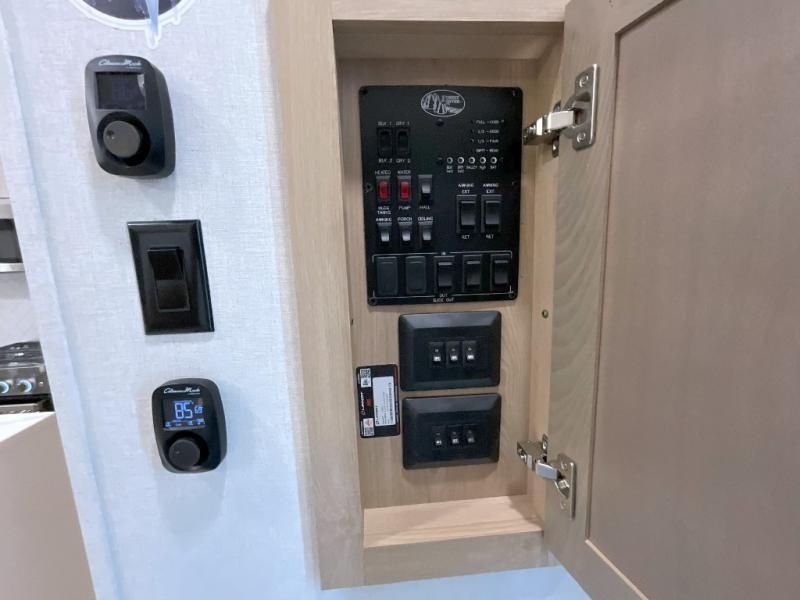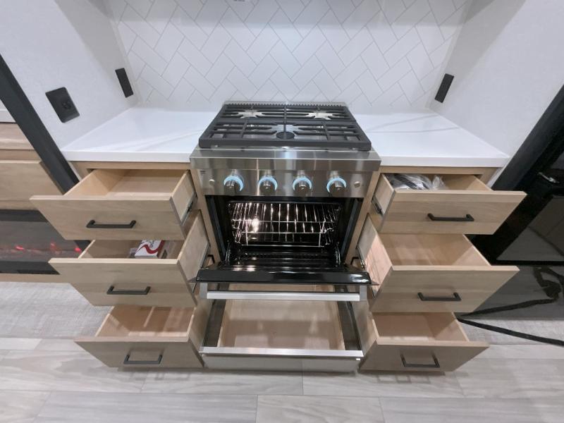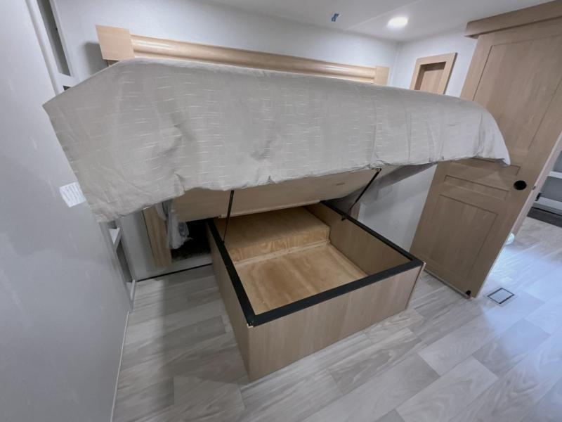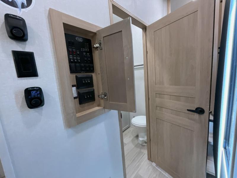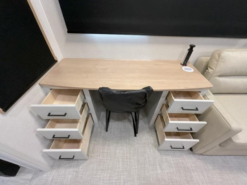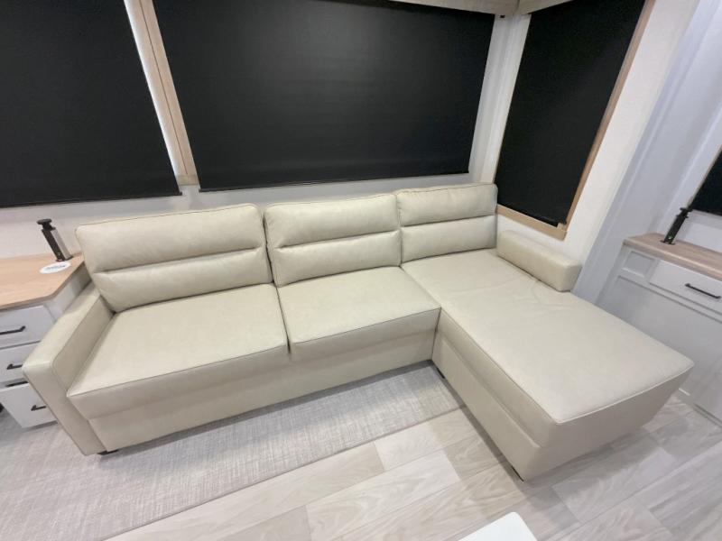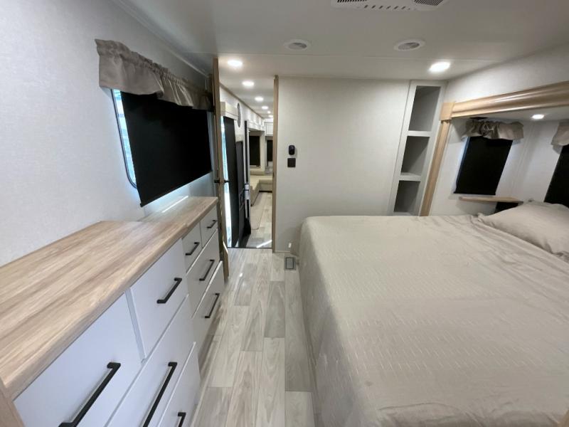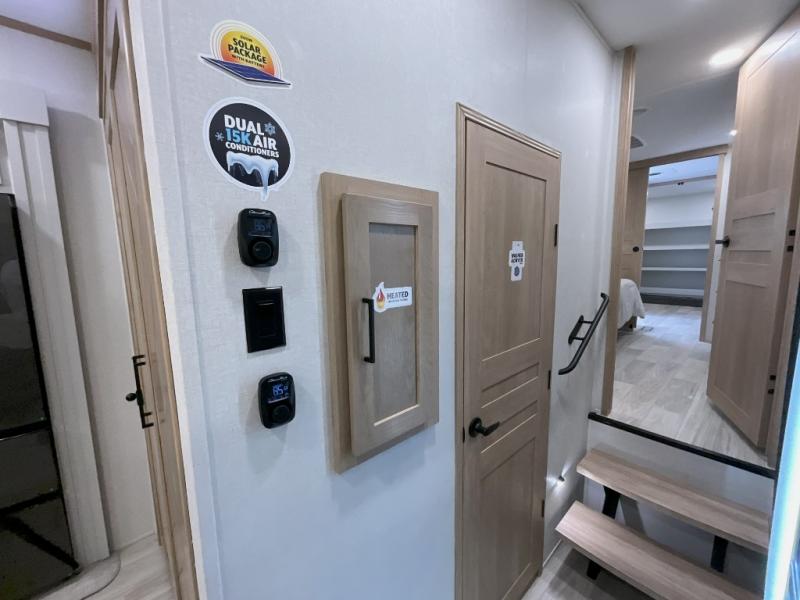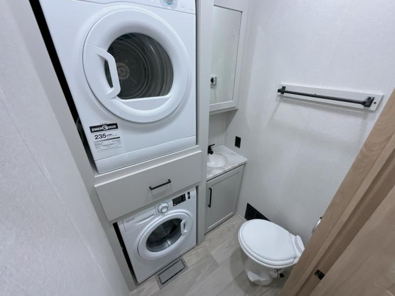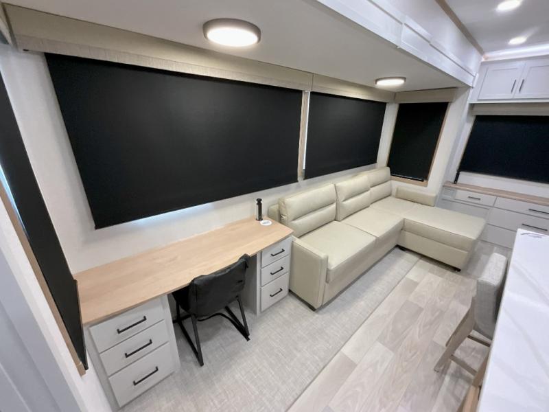 This fifth wheel is perfect for those seeking a comfortable, feature-rich home on wheels. Upon entering, you'll find a spacious rear living room, ideal for relaxation and entertainment. The room features a comfortable chase lounge, sofa, and an entertainment center with a cozy fireplace. For added convenience, there's a hidden pantry, desk with a chair, and a shelf and cabinet for storage. The kitchen is well-appointed with a stylish kitchen island featuring a beautiful waterfall edge. Overhead cabinets provide ample storage, while the microwave, 12V refrigerator, and four-burner cooktop make meal preparation a breeze. Plus, a butler pantry offers additional storage for kitchen essentials. A convenient half bath is located nearby, complete with a stackable washer and dryer prep if you want the option to add these appliances. The bedroom retreat features a comfortable king bed, a small dresser, and a tall dresser with a TV hookup. The adjacent walk-in bathroom closet boasts a one-piece fiberglass shower with a seat, dual sink, medicine cabinet, linen closet, and ample storage thanks to the various shelves, perfect for keeping your belongings organized. Exterior features include two awnings, one 12’ and the other 18’, providing ample shade and protection.