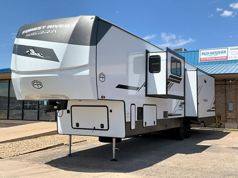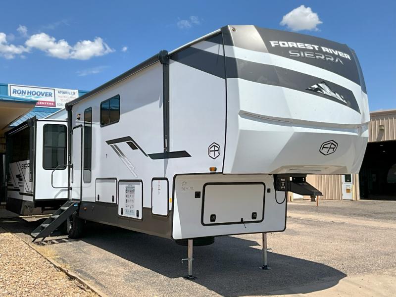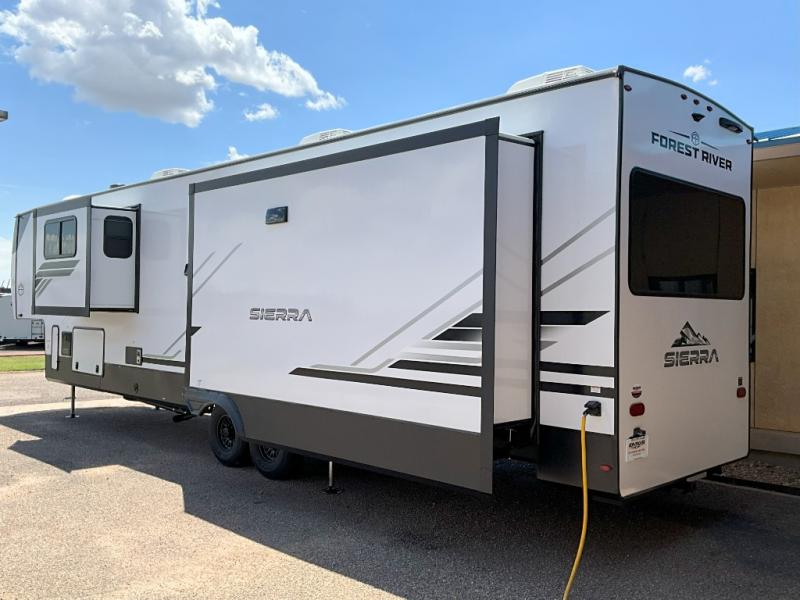 Each one of these Forest River Sierra fifth wheels are equipped with everything you need to make the most of each adventure! The underbelly armor will protect your unit's vitals from road debris and the painted two tone aerodynamic fiberglass front cap has an improved turning radius to make them easier to navigate. With an electric leveling system, you can set your unit up quick and easy then get to having fun faster than ever. The welded aluminum framed, vacuum bonded laminated superstructure will hold up through every adventure and the cambered powder coated frame comes with rust prohibitor to last longer. Each model also includes the Summit Package that comes with a king Wi-Fi extender system and Olympus antenna, a full coach water filter system, Goodyear tires with 7,000 lb. axles, and the list goes on. The interior is just as impressive with rustic wood plank linoleum, recessed residential lighting, a memory foam mattress, and mocha accent crown molding over the kitchen cabinets!