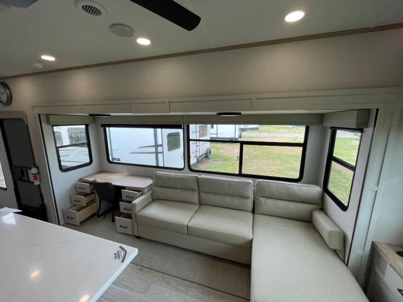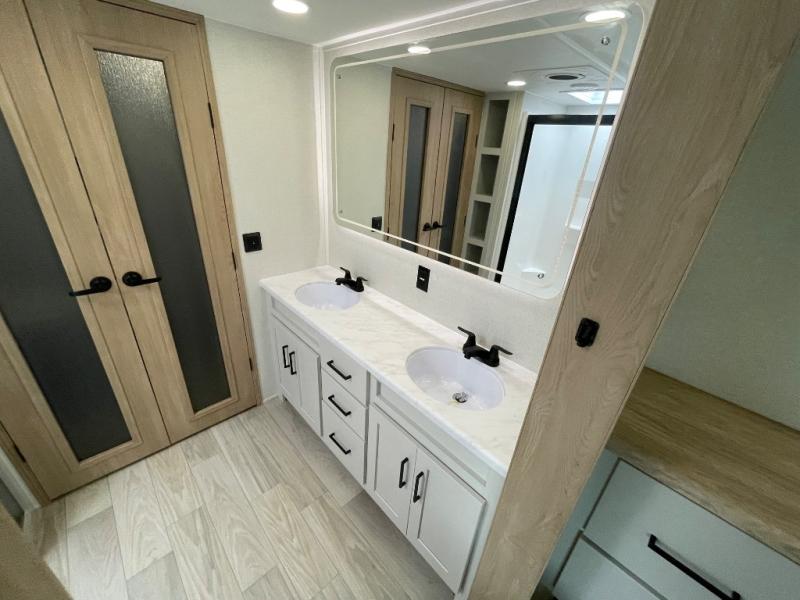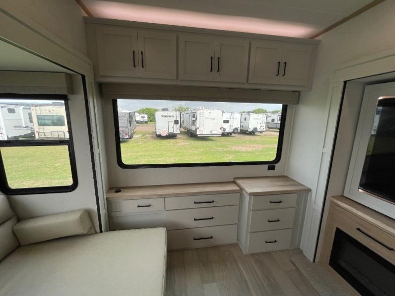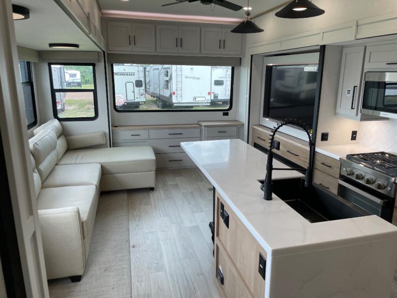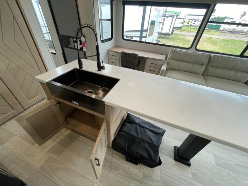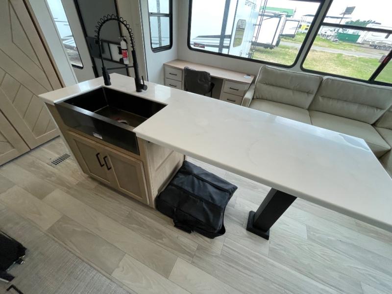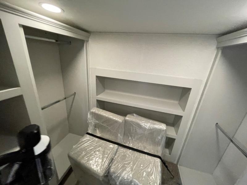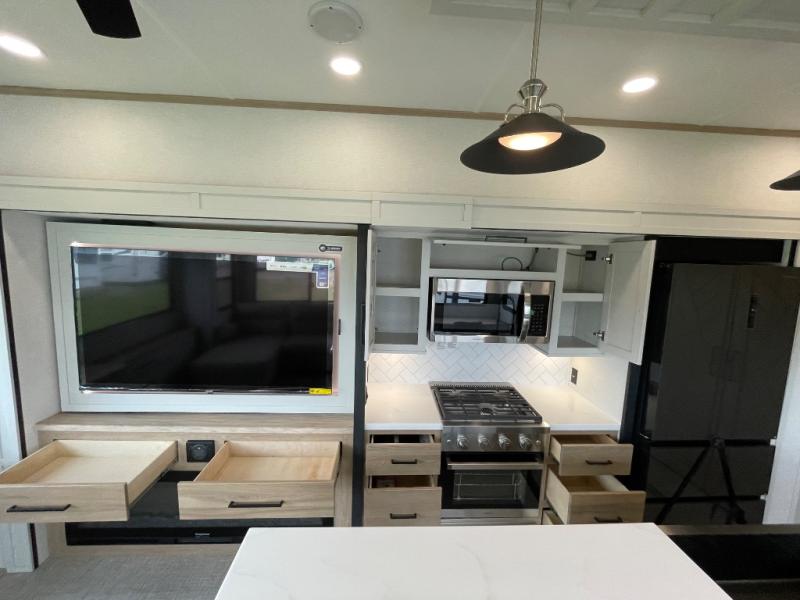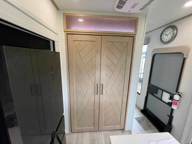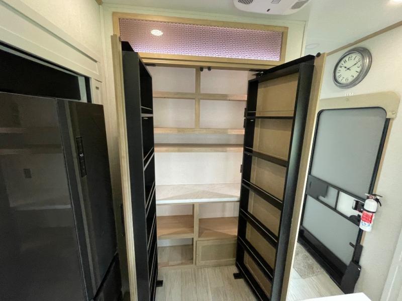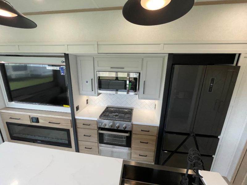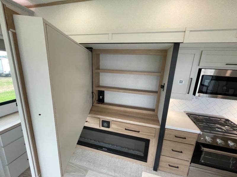This fifth wheel is perfect for those seeking a comfortable, feature-rich home on wheels. Upon entering, you'll find a spacious rear living room, ideal for relaxation and entertainment. The room features a comfortable chase lounge, sofa, and an entertainment center with a cozy fireplace. For added convenience, there's a hidden pantry, desk with a chair, and a shelf and cabinet for storage. The kitchen is well-appointed with a stylish kitchen island featuring a beautiful waterfall edge. Overhead cabinets provide ample storage, while the microwave, 12V refrigerator, and four-burner cooktop make meal preparation a breeze. Plus, a butler pantry offers additional storage for kitchen essentials. A convenient half bath is located nearby, complete with a stackable washer and dryer prep if you want the option to add these appliances. The bedroom retreat features a comfortable king bed, a small dresser, and a tall dresser with a TV hookup. The adjacent walk-in bathroom closet boasts a one-piece fiberglass shower with a seat, dual sink, medicine cabinet, linen closet, and ample storage thanks to the various shelves, perfect for keeping your belongings organized. Exterior features include two awnings, one 12’ and the other 18’, providing ample shade and protection.
