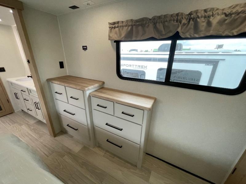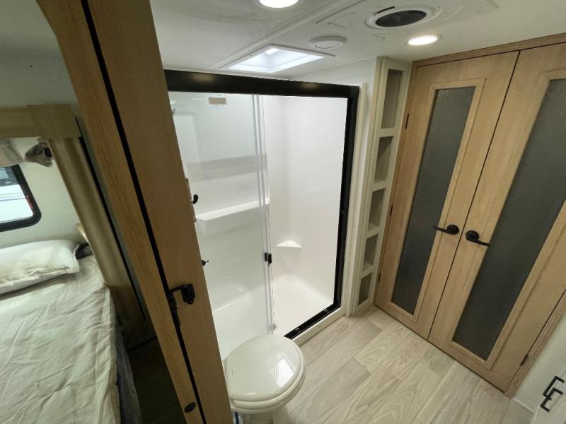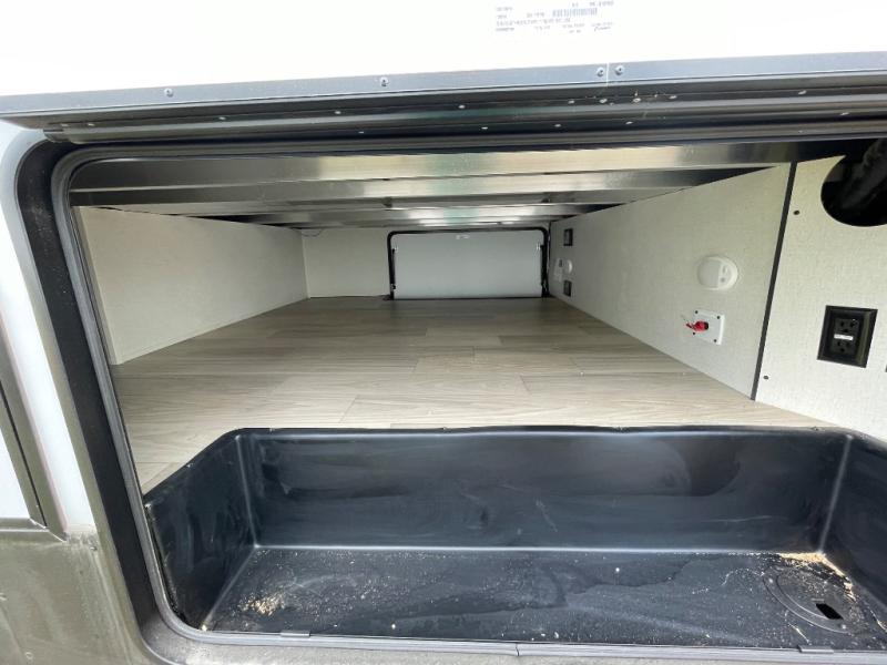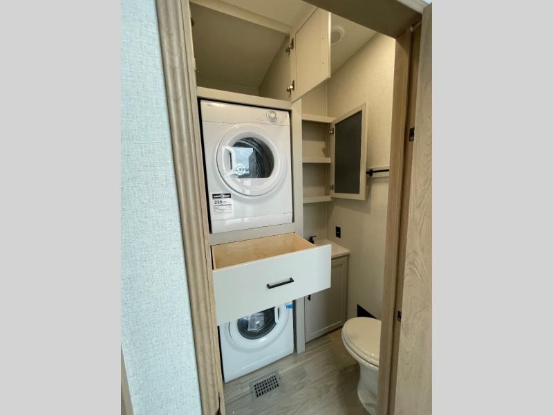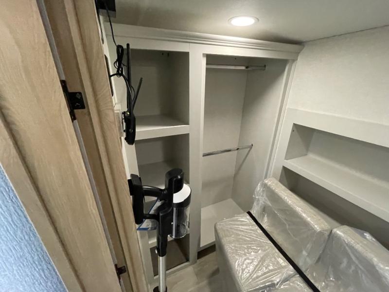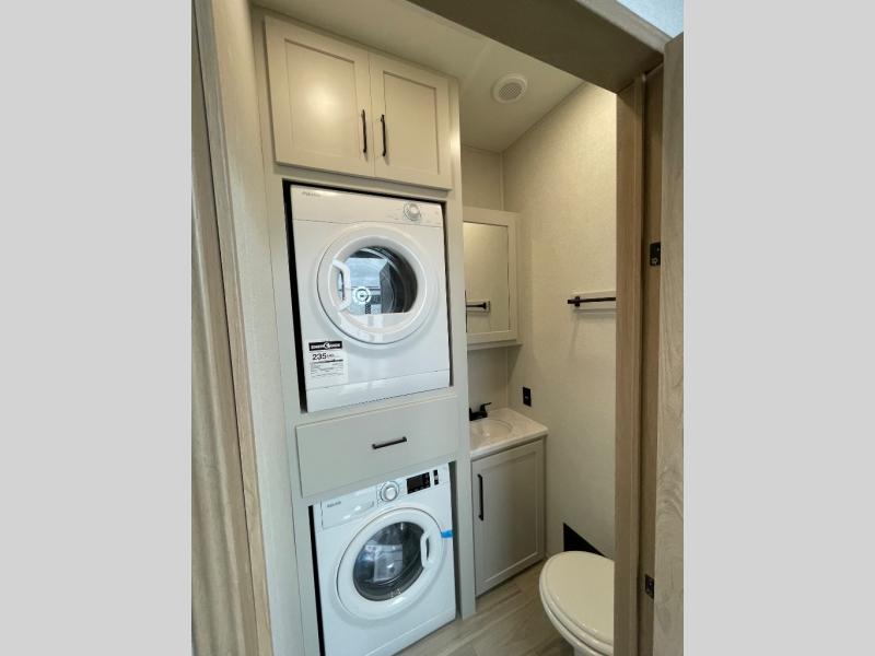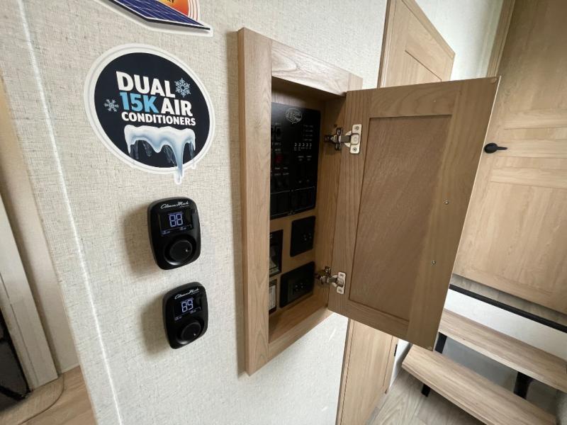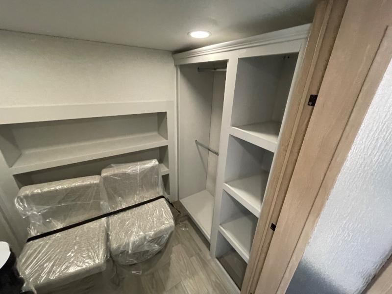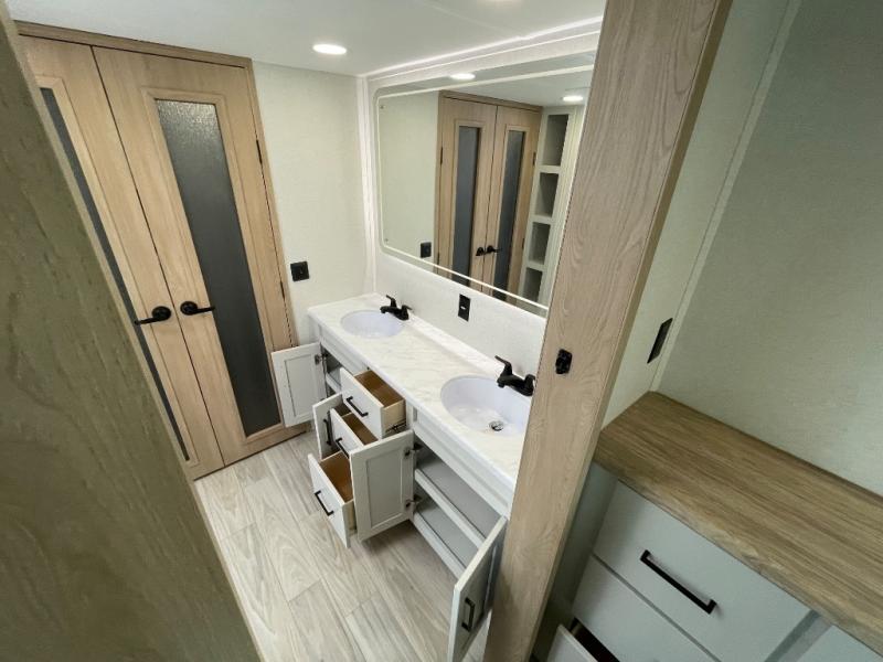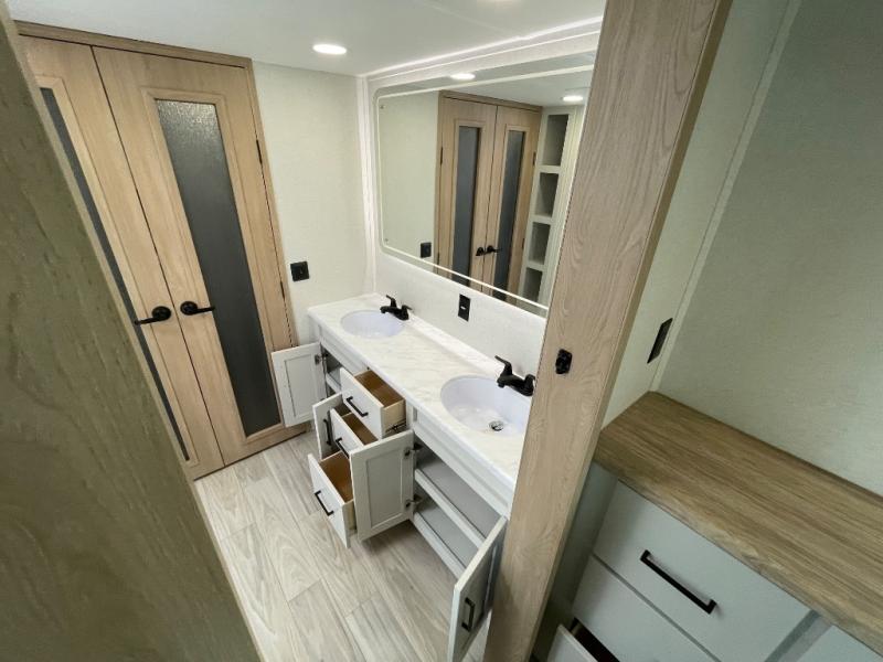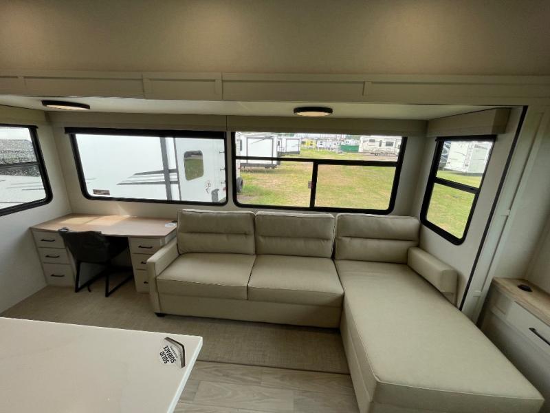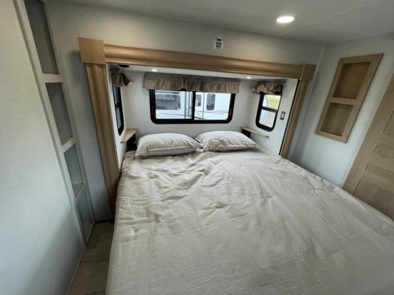 This fifth wheel is perfect for those seeking a comfortable, feature-rich home on wheels. Upon entering, you'll find a spacious rear living room, ideal for relaxation and entertainment. The room features a comfortable chase lounge, sofa, and an entertainment center with a cozy fireplace. For added convenience, there's a hidden pantry, desk with a chair, and a shelf and cabinet for storage. The kitchen is well-appointed with a stylish kitchen island featuring a beautiful waterfall edge. Overhead cabinets provide ample storage, while the microwave, 12V refrigerator, and four-burner cooktop make meal preparation a breeze. Plus, a butler pantry offers additional storage for kitchen essentials. A convenient half bath is located nearby, complete with a stackable washer and dryer prep if you want the option to add these appliances. The bedroom retreat features a comfortable king bed, a small dresser, and a tall dresser with a TV hookup. The adjacent walk-in bathroom closet boasts a one-piece fiberglass shower with a seat, dual sink, medicine cabinet, linen closet, and ample storage thanks to the various shelves, perfect for keeping your belongings organized. Exterior features include two awnings, one 12’ and the other 18’, providing ample shade and protection.