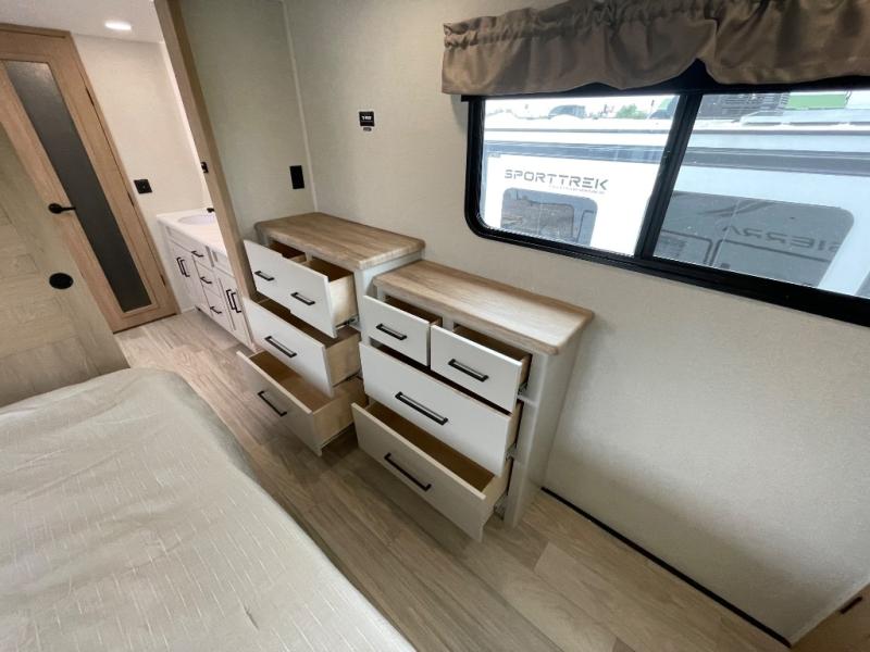 Each one of these Forest River Sierra fifth wheels are equipped with everything you need to make the most of each adventure! The underbelly armor will protect your unit's vitals from road debris and the painted two tone aerodynamic fiberglass front cap has an improved turning radius to make them easier to navigate. With an electric leveling system, you can set your unit up quick and easy then get to having fun faster than ever. The welded aluminum framed, vacuum bonded laminated superstructure will hold up through every adventure and the cambered powder coated frame comes with rust prohibitor to last longer. Each model also includes the Summit Package that comes with a king Wi-Fi extender system and Olympus antenna, a full coach water filter system, Goodyear tires with 7,000 lb. axles, and the list goes on. The interior is just as impressive with rustic wood plank linoleum, recessed residential lighting, a memory foam mattress, and mocha accent crown molding over the kitchen cabinets!
