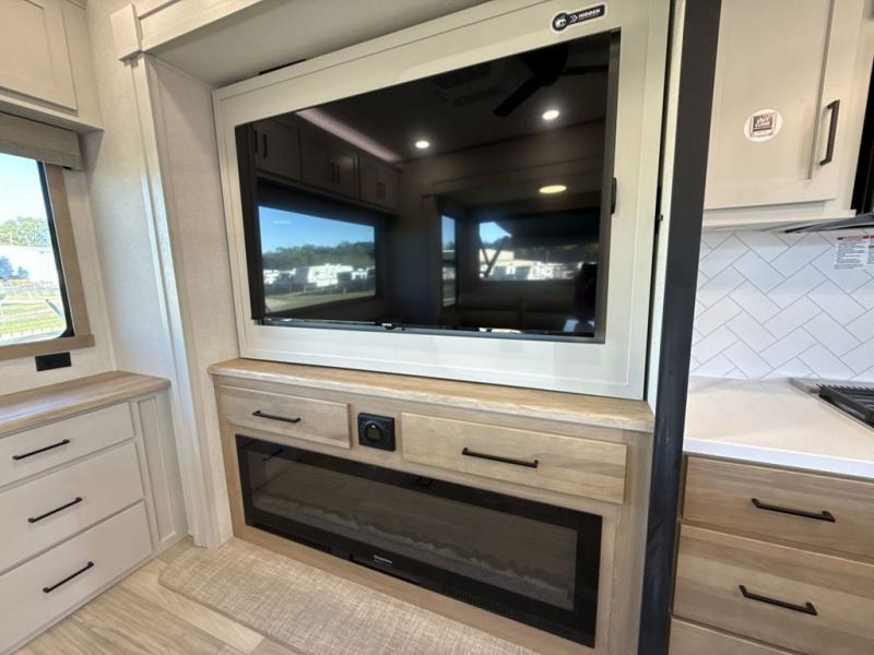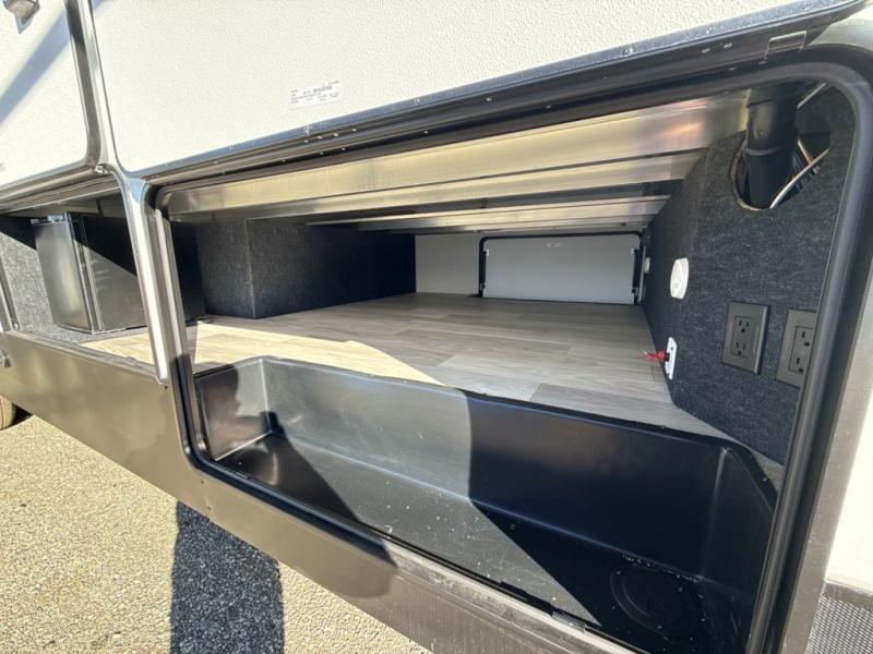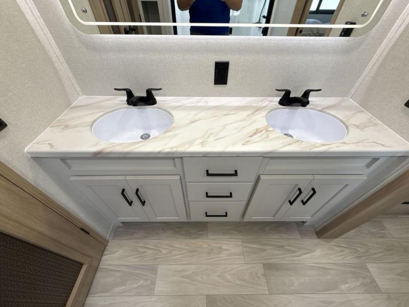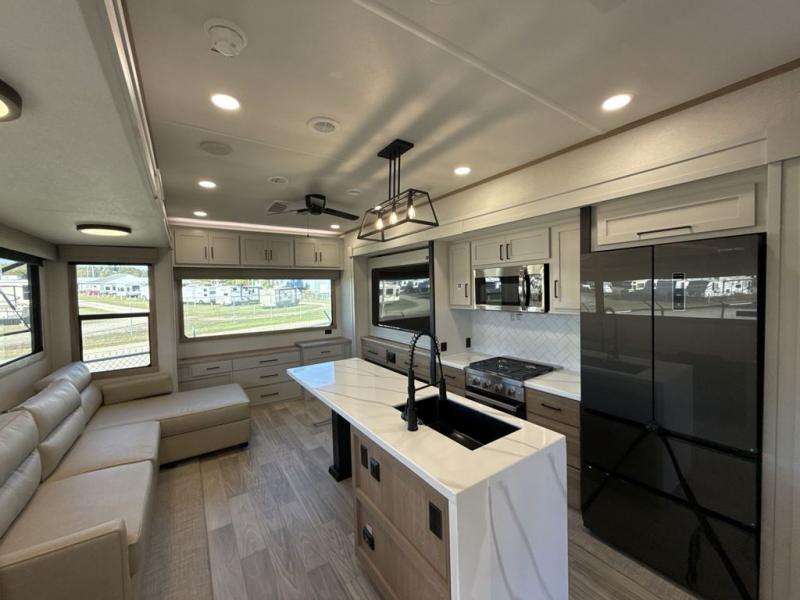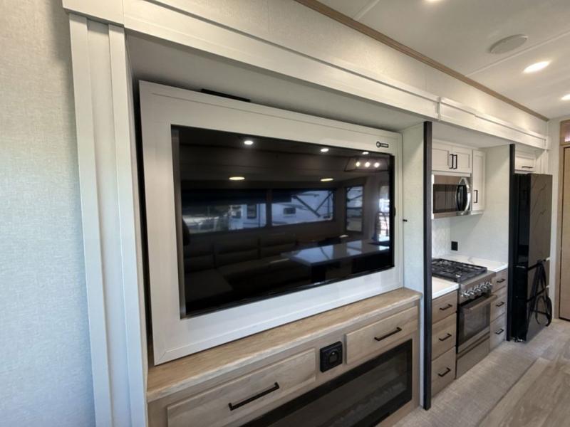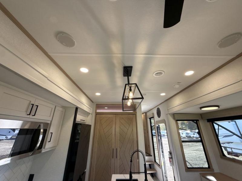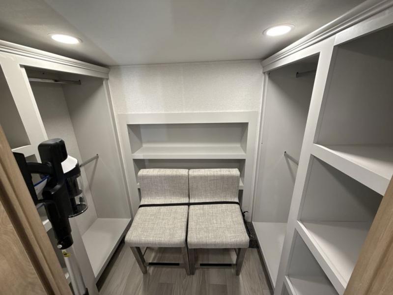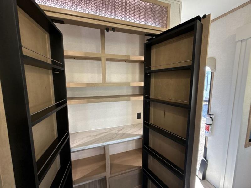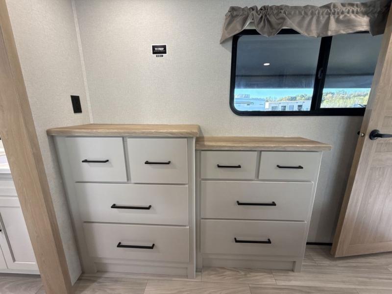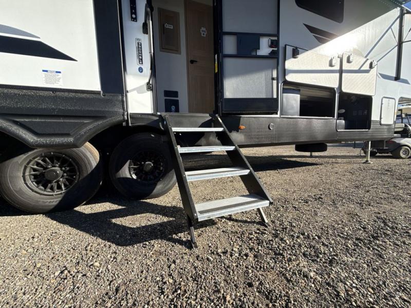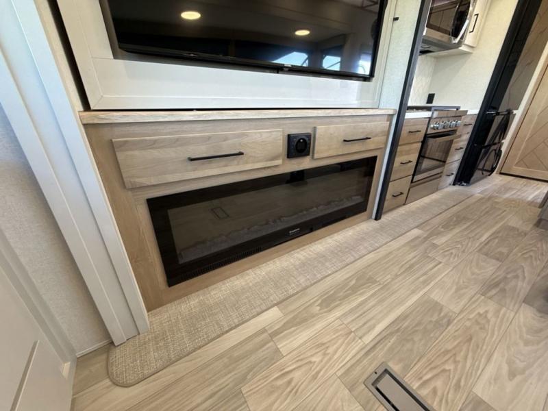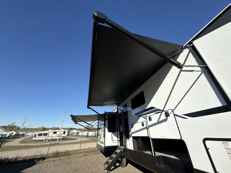 This fifth wheel is perfect for those seeking a comfortable, feature-rich home on wheels. Upon entering, you'll find a spacious rear living room, ideal for relaxation and entertainment. The room features a comfortable chase lounge, sofa, and an entertainment center with a cozy fireplace. For added convenience, there's a hidden pantry, desk with a chair, and a shelf and cabinet for storage. The kitchen is well-appointed with a stylish kitchen island featuring a beautiful waterfall edge. Overhead cabinets provide ample storage, while the microwave, 12V refrigerator, and four-burner cooktop make meal preparation a breeze. Plus, a butler pantry offers additional storage for kitchen essentials. A convenient half bath is located nearby, complete with a stackable washer and dryer prep if you want the option to add these appliances. The bedroom retreat features a comfortable king bed, a small dresser, and a tall dresser with a TV hookup. The adjacent walk-in bathroom closet boasts a one-piece fiberglass shower with a seat, dual sink, medicine cabinet, linen closet, and ample storage thanks to the various shelves, perfect for keeping your belongings organized. Exterior features include two awnings, one 12’ and the other 18’, providing ample shade and protection.