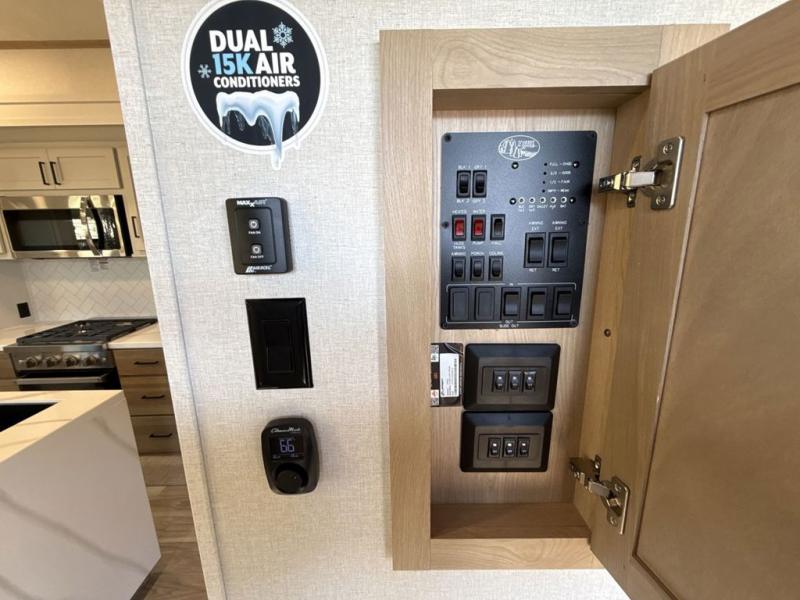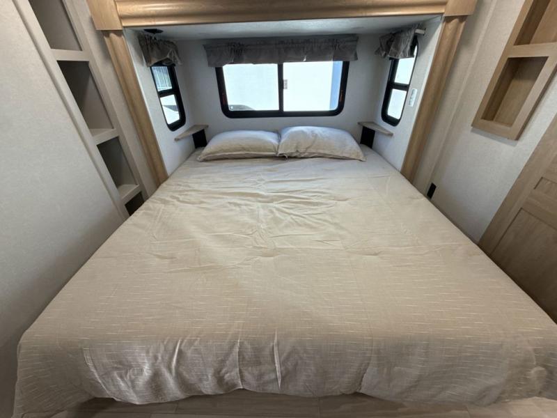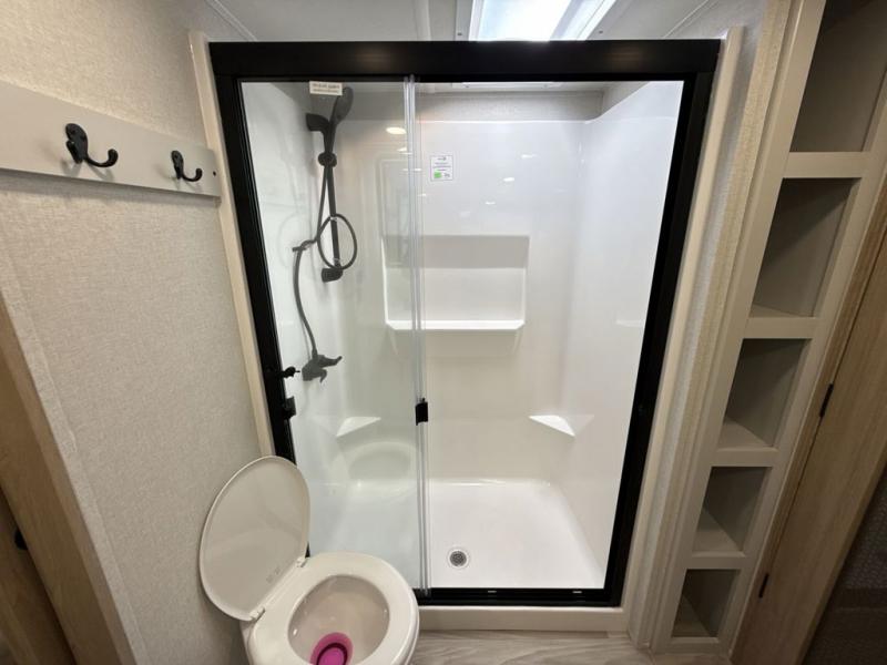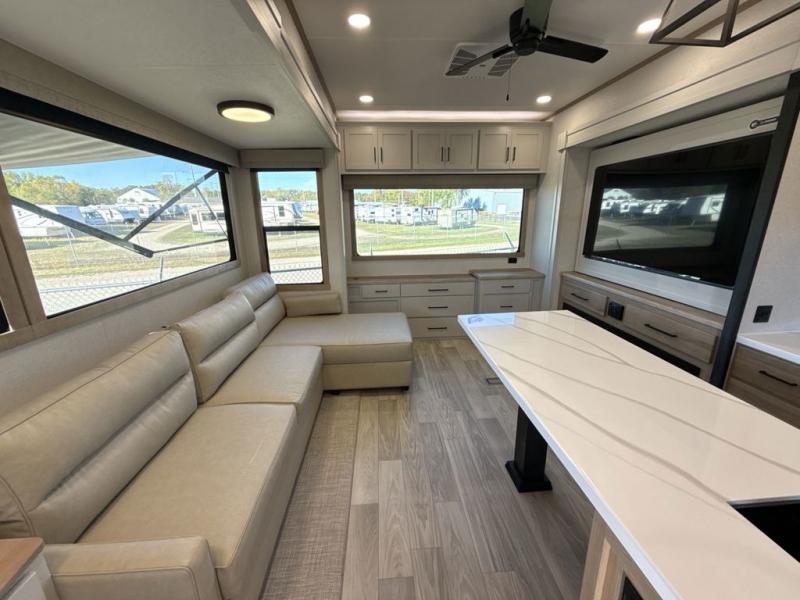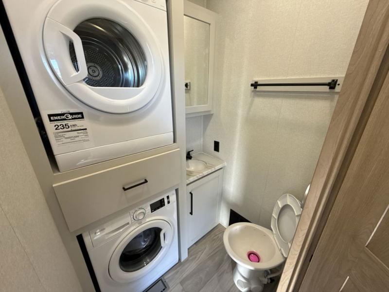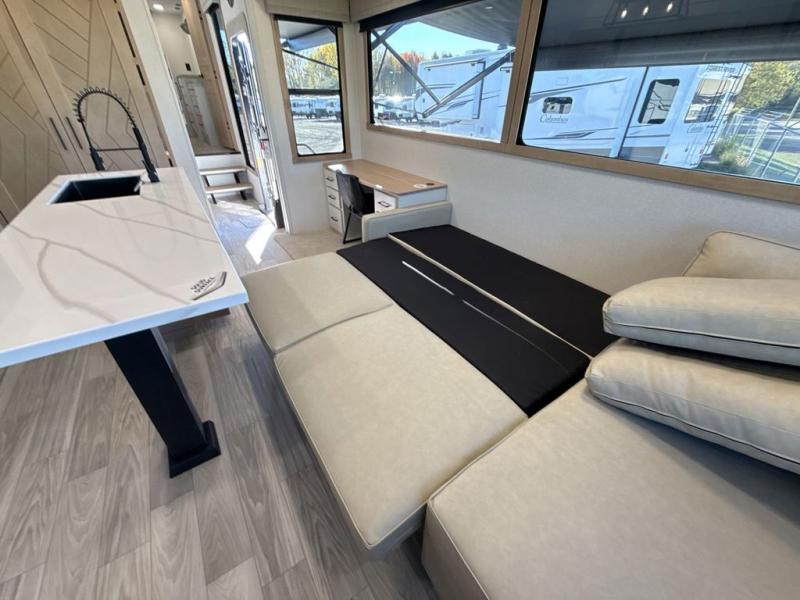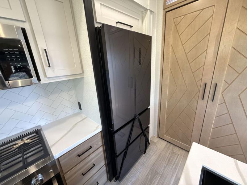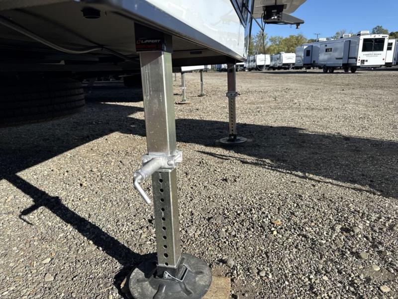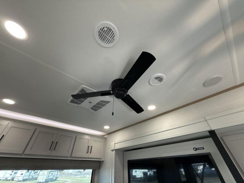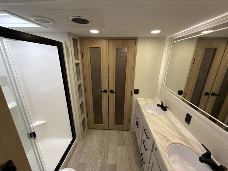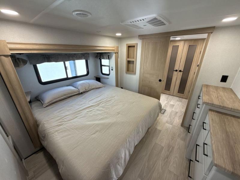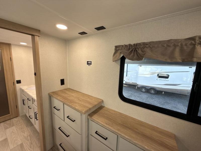 This fifth wheel is perfect for those seeking a comfortable, feature-rich home on wheels. Upon entering, you'll find a spacious rear living room, ideal for relaxation and entertainment. The room features a comfortable chase lounge, sofa, and an entertainment center with a cozy fireplace. For added convenience, there's a hidden pantry, desk with a chair, and a shelf and cabinet for storage. The kitchen is well-appointed with a stylish kitchen island featuring a beautiful waterfall edge. Overhead cabinets provide ample storage, while the microwave, 12V refrigerator, and four-burner cooktop make meal preparation a breeze. Plus, a butler pantry offers additional storage for kitchen essentials. A convenient half bath is located nearby, complete with a stackable washer and dryer prep if you want the option to add these appliances. The bedroom retreat features a comfortable king bed, a small dresser, and a tall dresser with a TV hookup. The adjacent walk-in bathroom closet boasts a one-piece fiberglass shower with a seat, dual sink, medicine cabinet, linen closet, and ample storage thanks to the various shelves, perfect for keeping your belongings organized. Exterior features include two awnings, one 12’ and the other 18’, providing ample shade and protection.