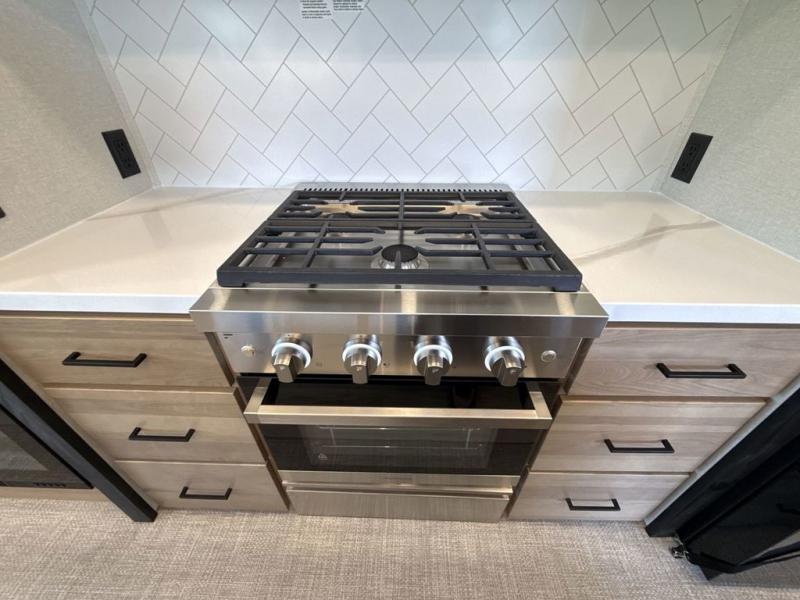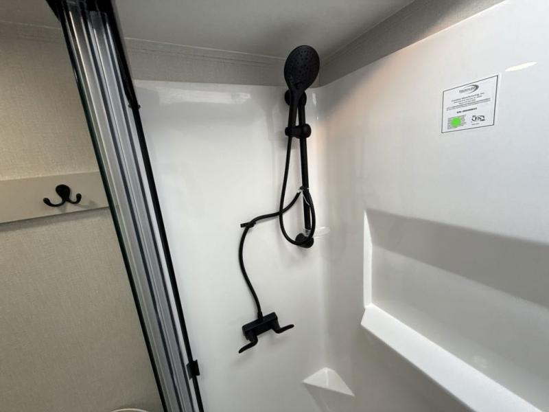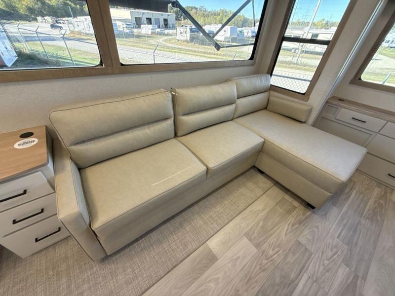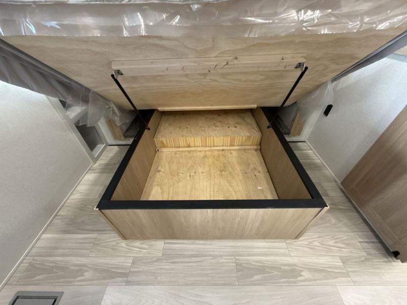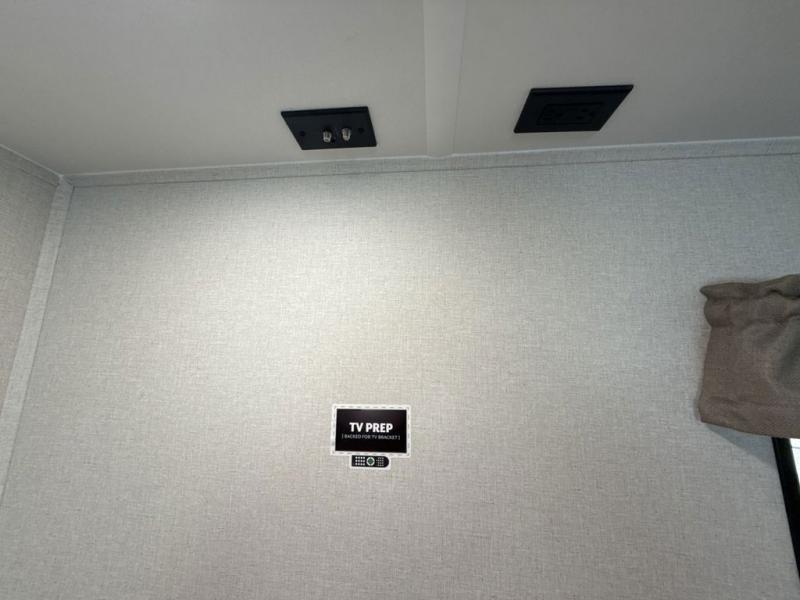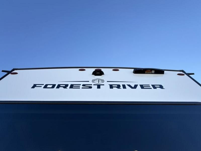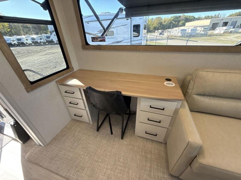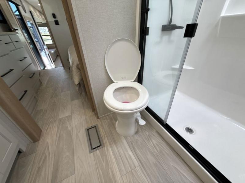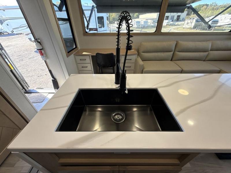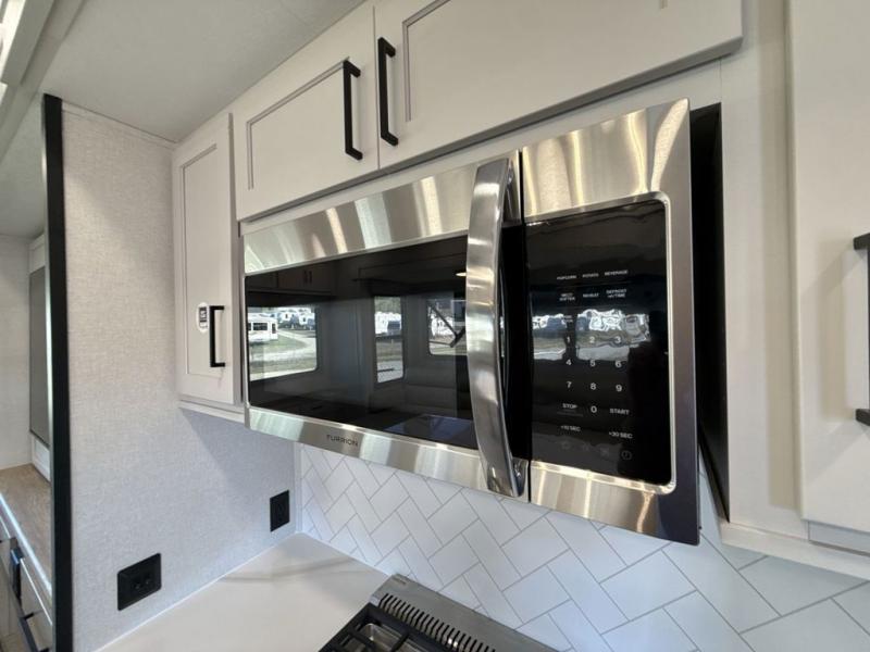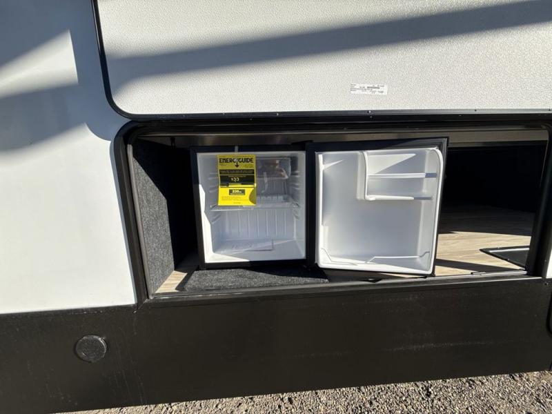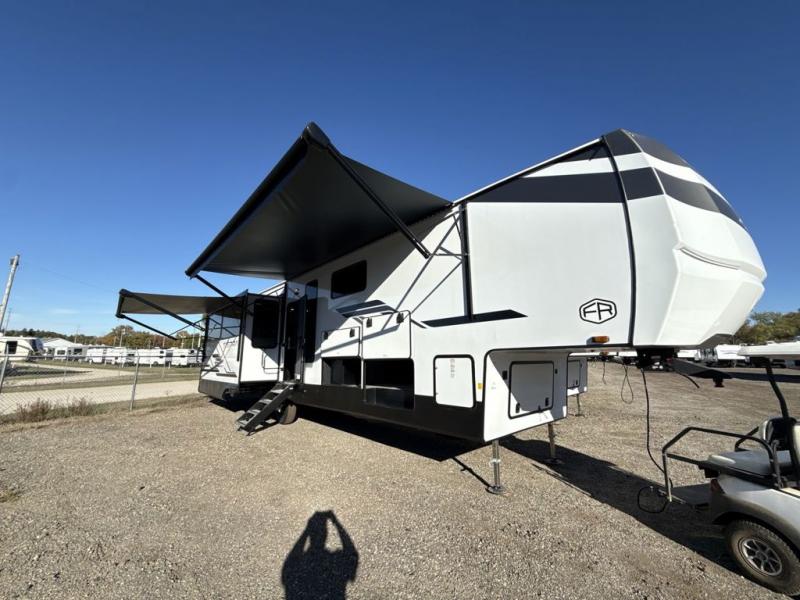 This fifth wheel is perfect for those seeking a comfortable, feature-rich home on wheels. Upon entering, you'll find a spacious rear living room, ideal for relaxation and entertainment. The room features a comfortable chase lounge, sofa, and an entertainment center with a cozy fireplace. For added convenience, there's a hidden pantry, desk with a chair, and a shelf and cabinet for storage. The kitchen is well-appointed with a stylish kitchen island featuring a beautiful waterfall edge. Overhead cabinets provide ample storage, while the microwave, 12V refrigerator, and four-burner cooktop make meal preparation a breeze. Plus, a butler pantry offers additional storage for kitchen essentials. A convenient half bath is located nearby, complete with a stackable washer and dryer prep if you want the option to add these appliances. The bedroom retreat features a comfortable king bed, a small dresser, and a tall dresser with a TV hookup. The adjacent walk-in bathroom closet boasts a one-piece fiberglass shower with a seat, dual sink, medicine cabinet, linen closet, and ample storage thanks to the various shelves, perfect for keeping your belongings organized. Exterior features include two awnings, one 12’ and the other 18’, providing ample shade and protection.