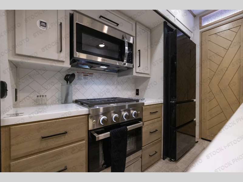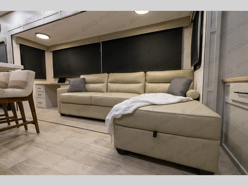 This fifth wheel is perfect for those seeking a comfortable, feature-rich home on wheels. Upon entering, you'll find a spacious rear living room, ideal for relaxation and entertainment. The room features a comfortable chase lounge, sofa, and an entertainment center with a cozy fireplace. For added convenience, there's a hidden pantry, desk with a chair, and a shelf and cabinet for storage. The kitchen is well-appointed with a stylish kitchen island featuring a beautiful waterfall edge. Overhead cabinets provide ample storage, while the microwave, 12V refrigerator, and four-burner cooktop make meal preparation a breeze. Plus, a butler pantry offers additional storage for kitchen essentials. A convenient half bath is located nearby, complete with a stackable washer and dryer prep if you want the option to add these appliances. The bedroom retreat features a comfortable king bed, a small dresser, and a tall dresser with a TV hookup. The adjacent walk-in bathroom closet boasts a one-piece fiberglass shower with a seat, dual sink, medicine cabinet, linen closet, and ample storage thanks to the various shelves, perfect for keeping your belongings organized. Exterior features include two awnings, one 12’ and the other 18’, providing ample shade and protection.