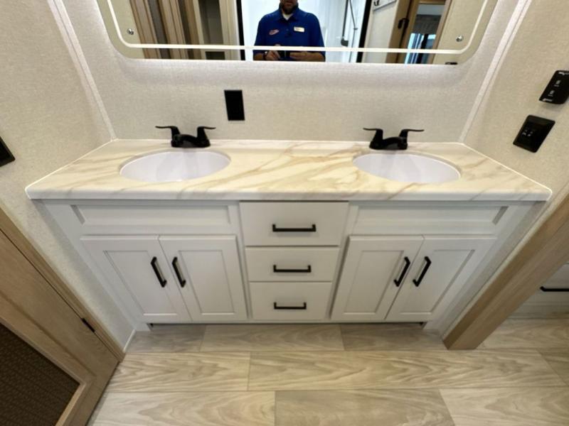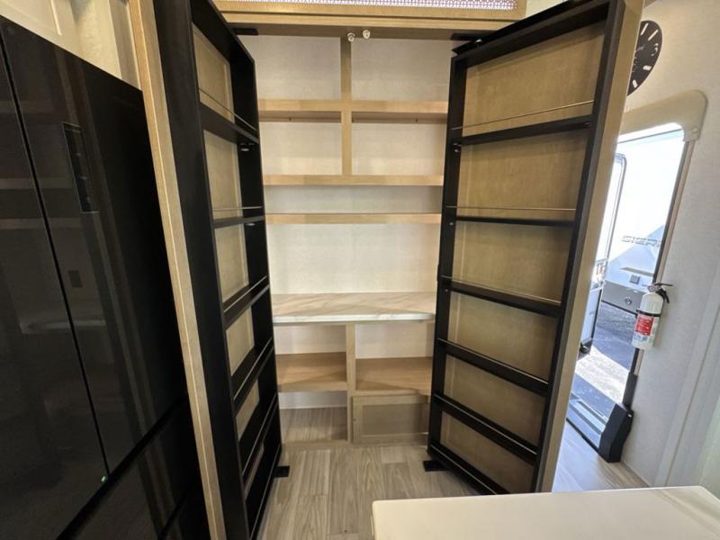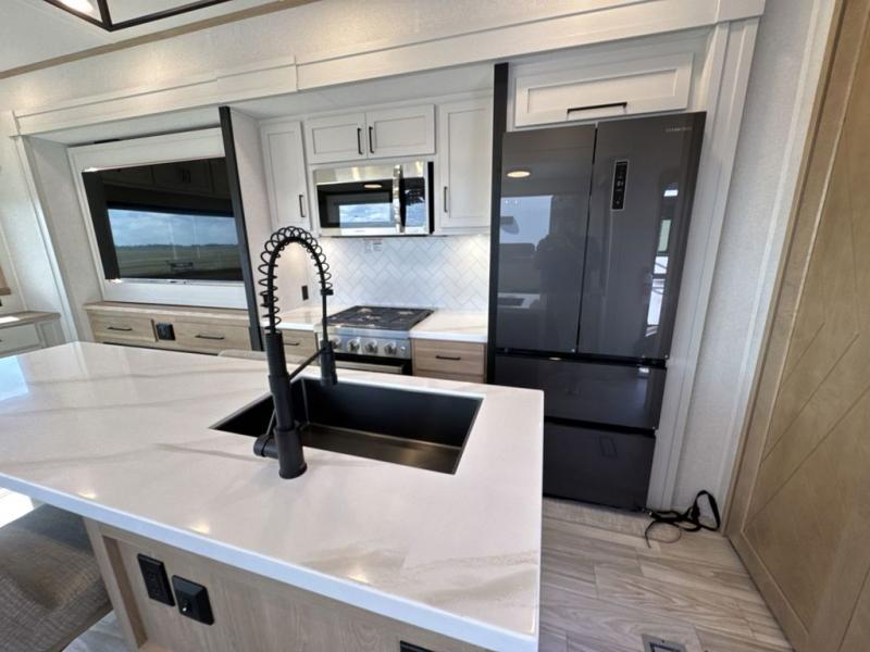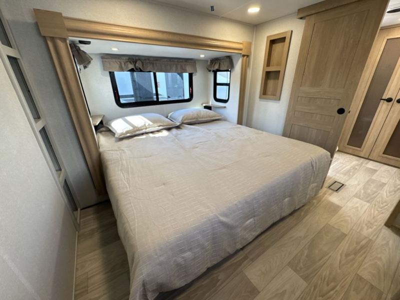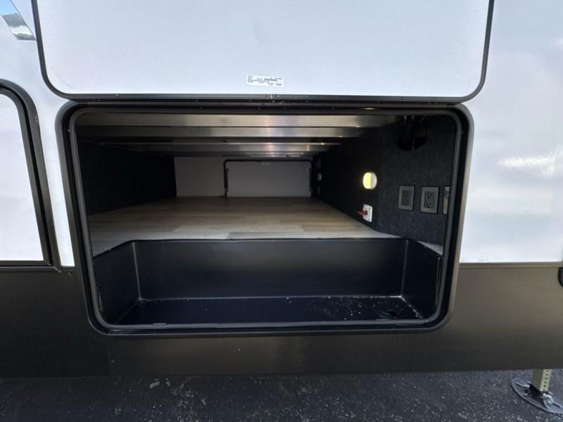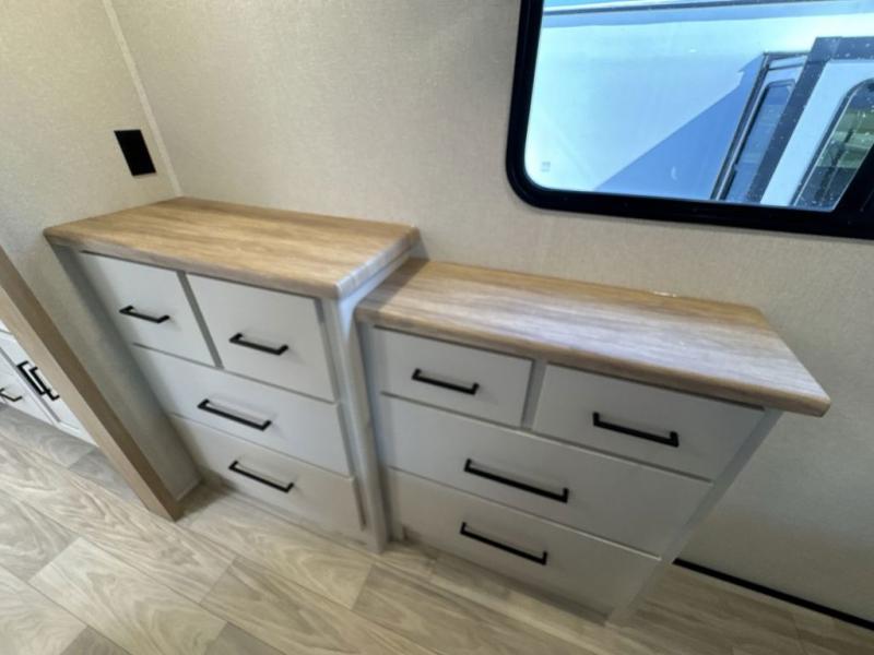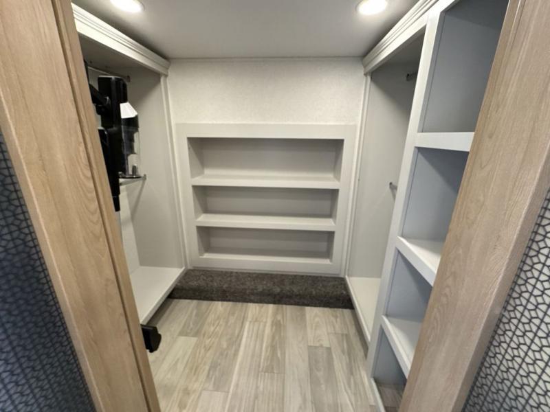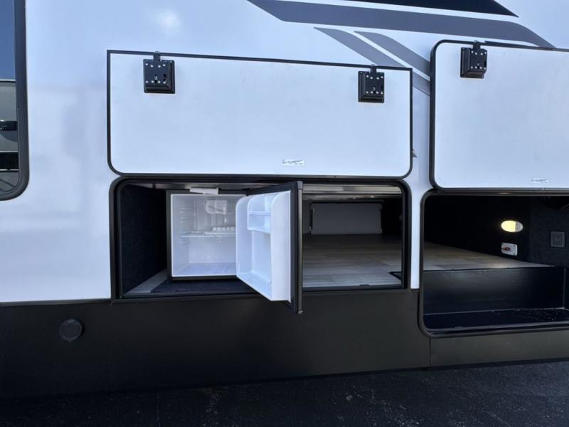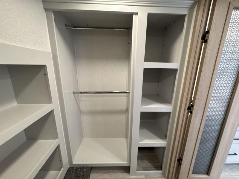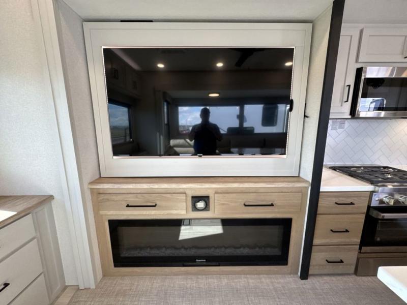 This fifth wheel is perfect for those seeking a comfortable, feature-rich home on wheels. Upon entering, you'll find a spacious rear living room, ideal for relaxation and entertainment. The room features a comfortable chase lounge, sofa, and an entertainment center with a cozy fireplace. For added convenience, there's a hidden pantry, desk with a chair, and a shelf and cabinet for storage. The kitchen is well-appointed with a stylish kitchen island featuring a beautiful waterfall edge. Overhead cabinets provide ample storage, while the microwave, 12V refrigerator, and four-burner cooktop make meal preparation a breeze. Plus, a butler pantry offers additional storage for kitchen essentials. A convenient half bath is located nearby, complete with a stackable washer and dryer prep if you want the option to add these appliances. The bedroom retreat features a comfortable king bed, a small dresser, and a tall dresser with a TV hookup. The adjacent walk-in bathroom closet boasts a one-piece fiberglass shower with a seat, dual sink, medicine cabinet, linen closet, and ample storage thanks to the various shelves, perfect for keeping your belongings organized. Exterior features include two awnings, one 12’ and the other 18’, providing ample shade and protection.