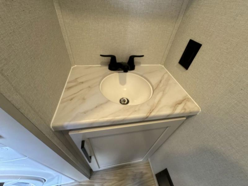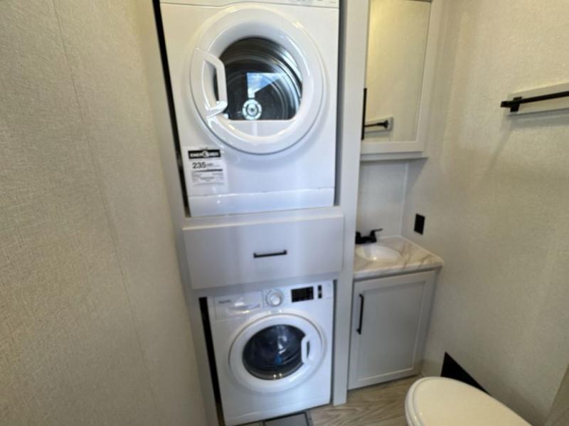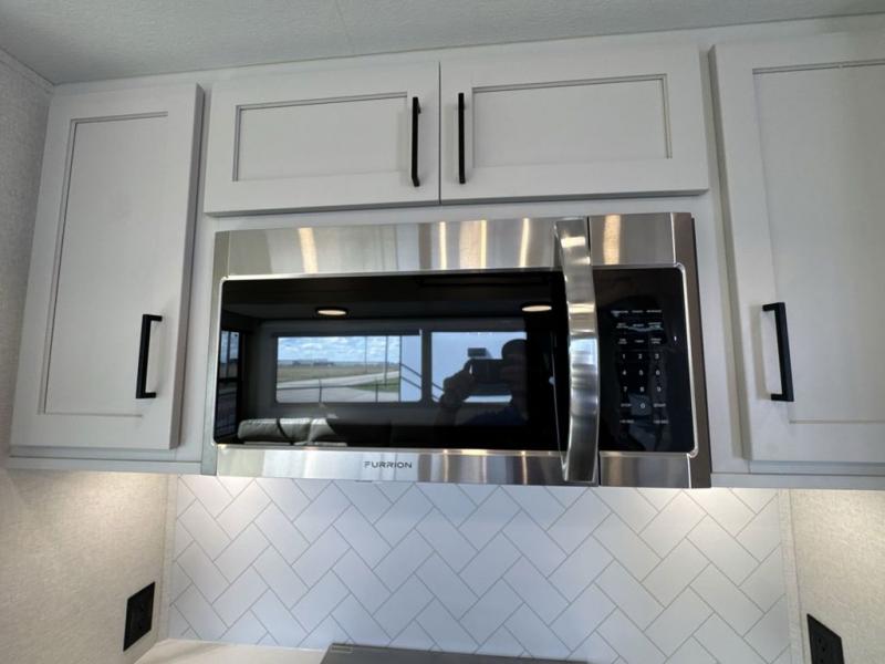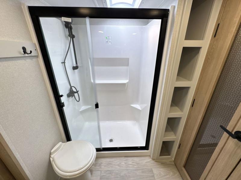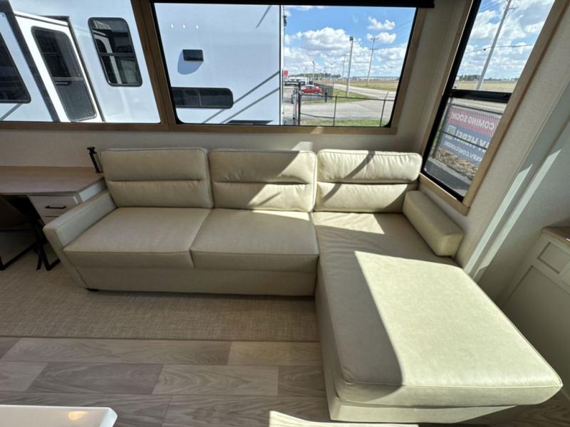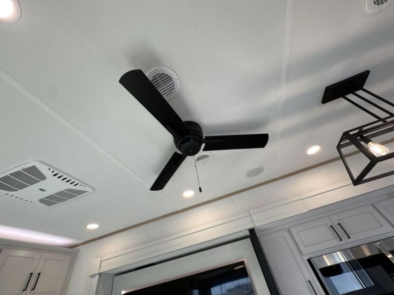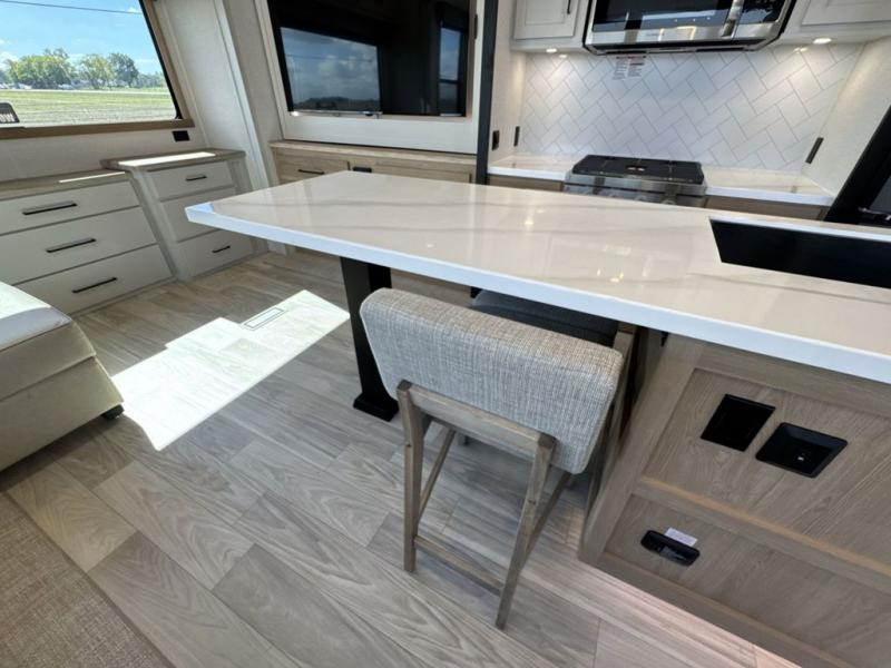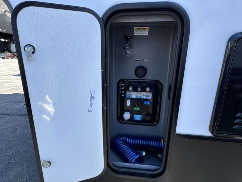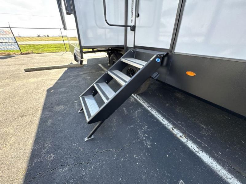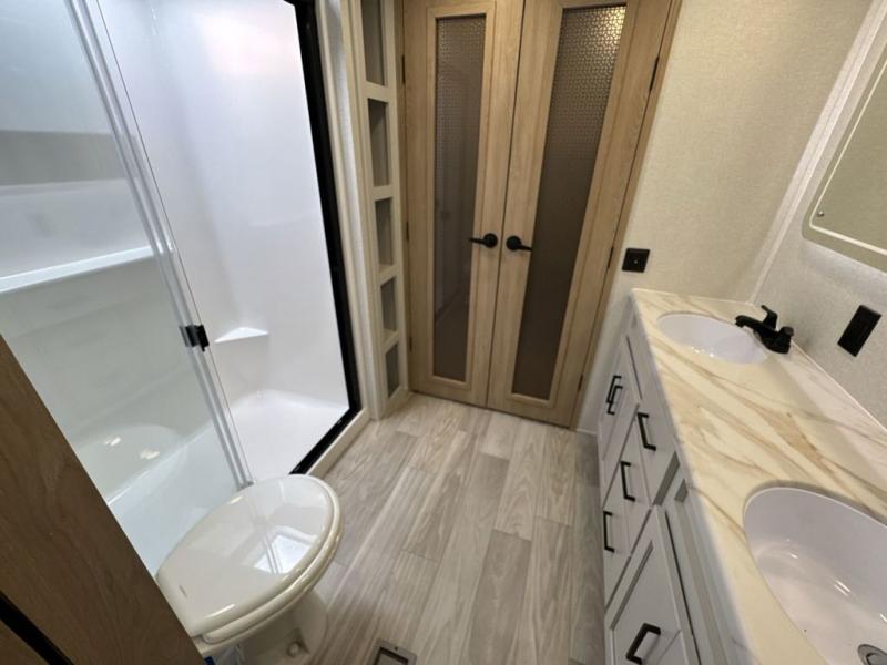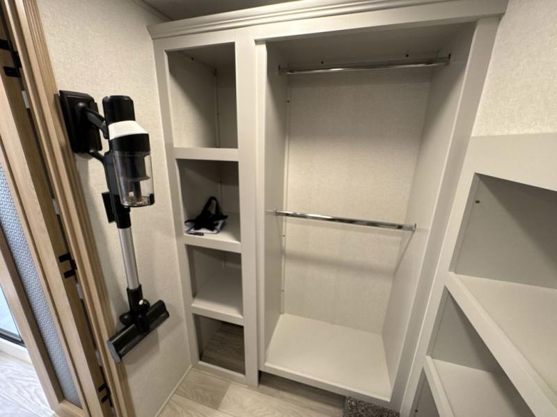 This fifth wheel is perfect for those seeking a comfortable, feature-rich home on wheels. Upon entering, you'll find a spacious rear living room, ideal for relaxation and entertainment. The room features a comfortable chase lounge, sofa, and an entertainment center with a cozy fireplace. For added convenience, there's a hidden pantry, desk with a chair, and a shelf and cabinet for storage. The kitchen is well-appointed with a stylish kitchen island featuring a beautiful waterfall edge. Overhead cabinets provide ample storage, while the microwave, 12V refrigerator, and four-burner cooktop make meal preparation a breeze. Plus, a butler pantry offers additional storage for kitchen essentials. A convenient half bath is located nearby, complete with a stackable washer and dryer prep if you want the option to add these appliances. The bedroom retreat features a comfortable king bed, a small dresser, and a tall dresser with a TV hookup. The adjacent walk-in bathroom closet boasts a one-piece fiberglass shower with a seat, dual sink, medicine cabinet, linen closet, and ample storage thanks to the various shelves, perfect for keeping your belongings organized. Exterior features include two awnings, one 12’ and the other 18’, providing ample shade and protection.
