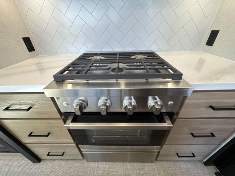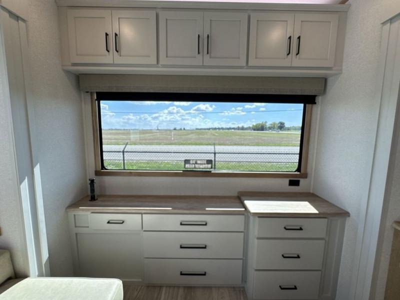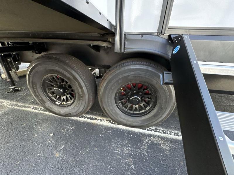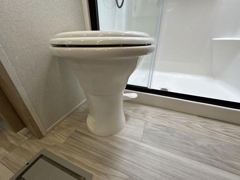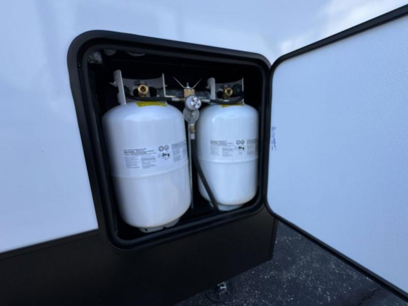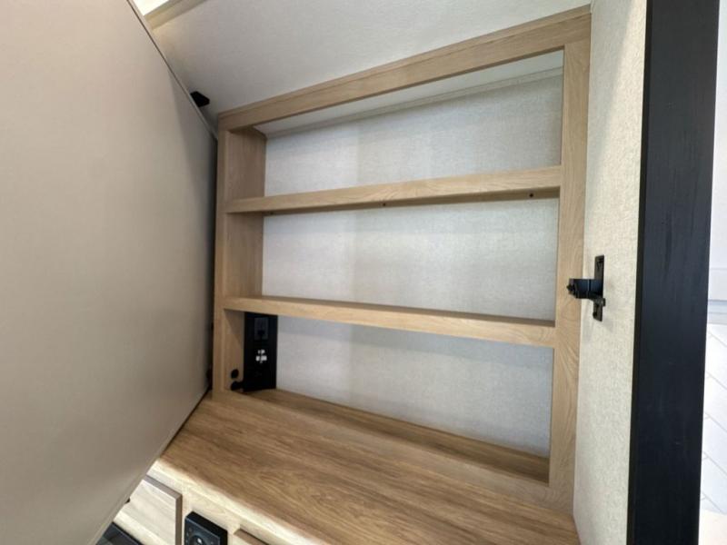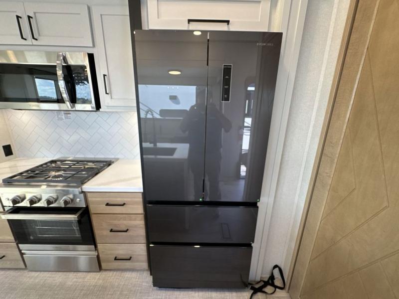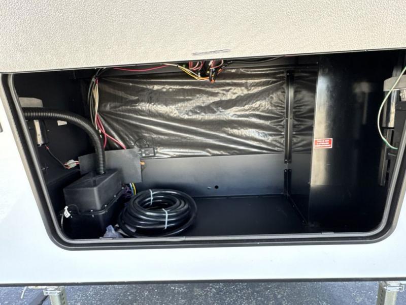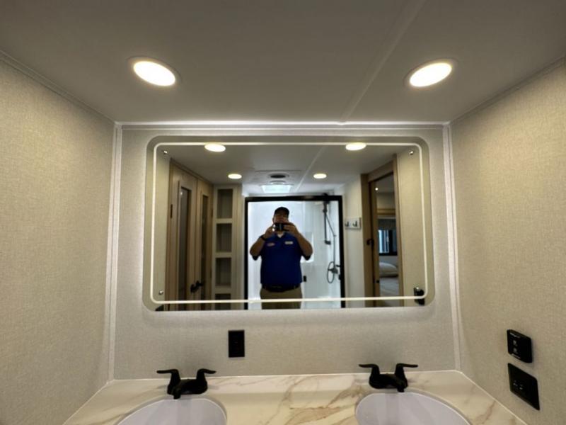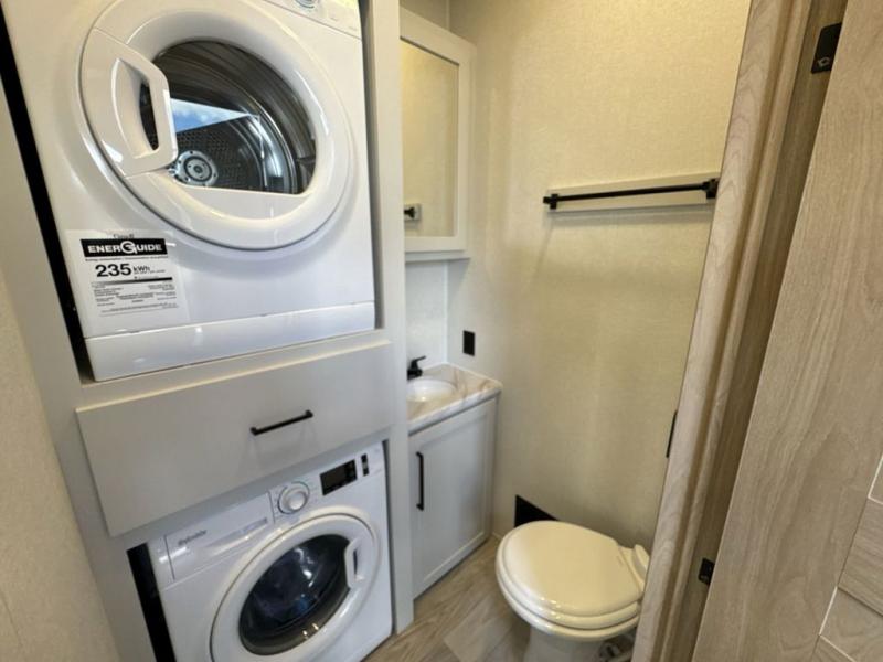 This fifth wheel is perfect for those seeking a comfortable, feature-rich home on wheels. Upon entering, you'll find a spacious rear living room, ideal for relaxation and entertainment. The room features a comfortable chase lounge, sofa, and an entertainment center with a cozy fireplace. For added convenience, there's a hidden pantry, desk with a chair, and a shelf and cabinet for storage. The kitchen is well-appointed with a stylish kitchen island featuring a beautiful waterfall edge. Overhead cabinets provide ample storage, while the microwave, 12V refrigerator, and four-burner cooktop make meal preparation a breeze. Plus, a butler pantry offers additional storage for kitchen essentials. A convenient half bath is located nearby, complete with a stackable washer and dryer prep if you want the option to add these appliances. The bedroom retreat features a comfortable king bed, a small dresser, and a tall dresser with a TV hookup. The adjacent walk-in bathroom closet boasts a one-piece fiberglass shower with a seat, dual sink, medicine cabinet, linen closet, and ample storage thanks to the various shelves, perfect for keeping your belongings organized. Exterior features include two awnings, one 12’ and the other 18’, providing ample shade and protection.