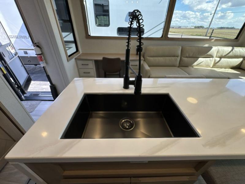 Each one of these Forest River Sierra fifth wheels are equipped with everything you need to make the most of each adventure! The underbelly armor will protect your unit's vitals from road debris and the painted two tone aerodynamic fiberglass front cap has an improved turning radius to make them easier to navigate. With an electric leveling system, you can set your unit up quick and easy then get to having fun faster than ever. The welded aluminum framed, vacuum bonded laminated superstructure will hold up through every adventure and the cambered powder coated frame comes with rust prohibitor to last longer. Each model also includes the Summit Package that comes with a king Wi-Fi extender system and Olympus antenna, a full coach water filter system, Goodyear tires with 7,000 lb. axles, and the list goes on. The interior is just as impressive with rustic wood plank linoleum, recessed residential lighting, a memory foam mattress, and mocha accent crown molding over the kitchen cabinets!