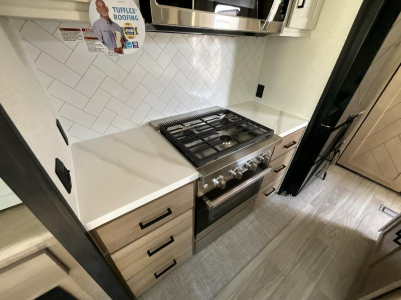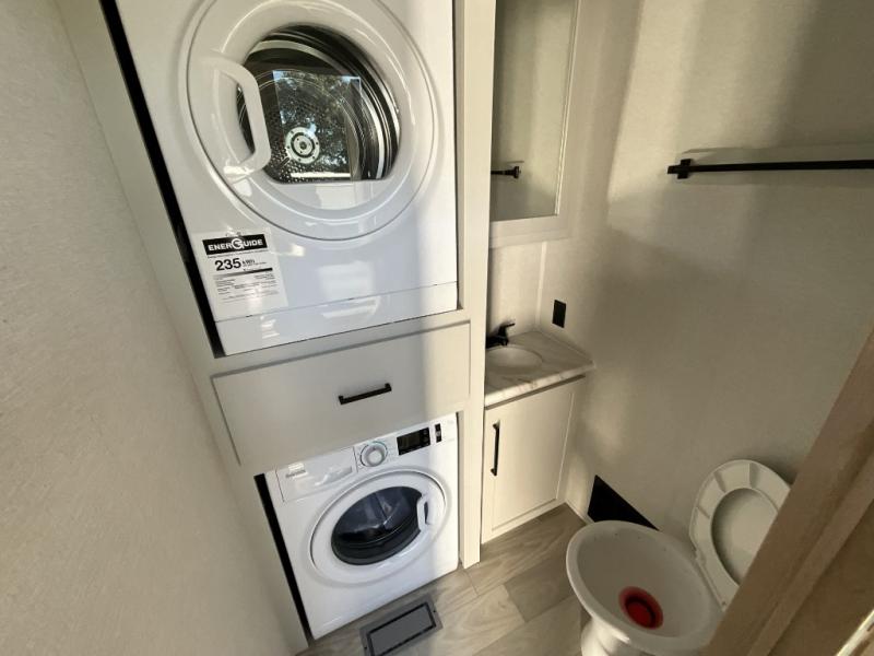 This fifth wheel is perfect for those seeking a comfortable, feature-rich home on wheels. Upon entering, you'll find a spacious rear living room, ideal for relaxation and entertainment. The room features a comfortable chaise lounge, sofa, and an entertainment center with a cozy fireplace. For added convenience, there's a hidden pantry, desk with a chair, and a shelf and cabinet for storage. The kitchen is well-appointed with a stylish kitchen island featuring a beautiful waterfall edge. Overhead cabinets provide ample storage, while the microwave and 12V refrigerator allow for easy meal prep. Plus, a butler pantry offers additional storage for kitchen essentials. A convenient half bath is located nearby, complete with a stackable washer and dryer prep if you want the option to add these appliances. The bedroom retreat features a comfortable king bed, a small dresser, and a tall dresser with a TV hookup. The adjacent walk-in bathroom closet boasts a one-piece fiberglass shower, dual sink, medicine cabinet, linen closet, and ample storage thanks to the various shelves, perfect for keeping your belongings organized. Exterior features include two awnings, one 12’ and the other 18’, providing ample shade and protection.