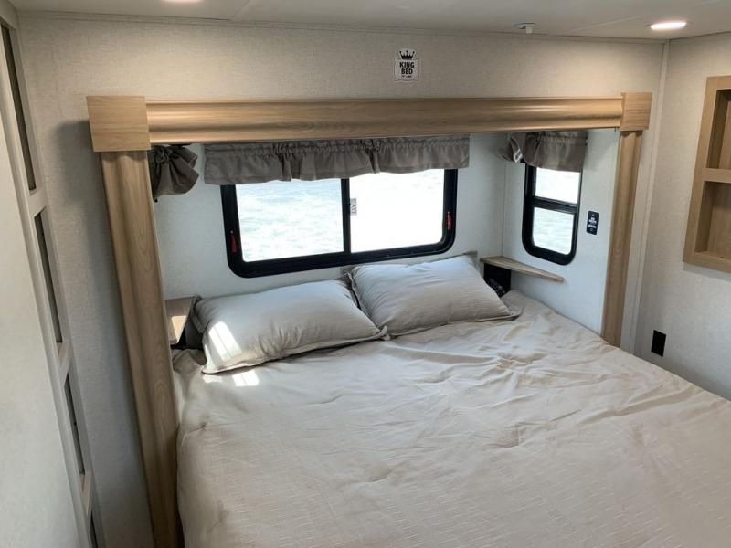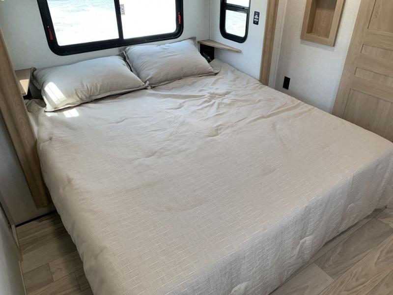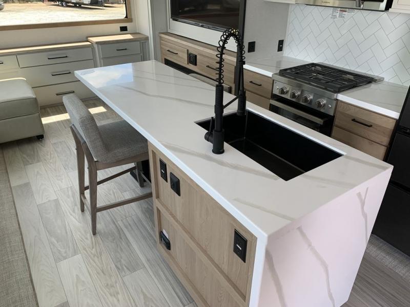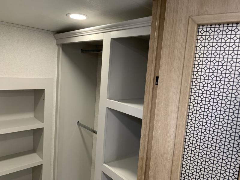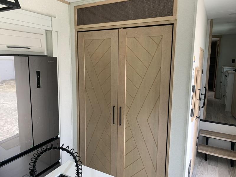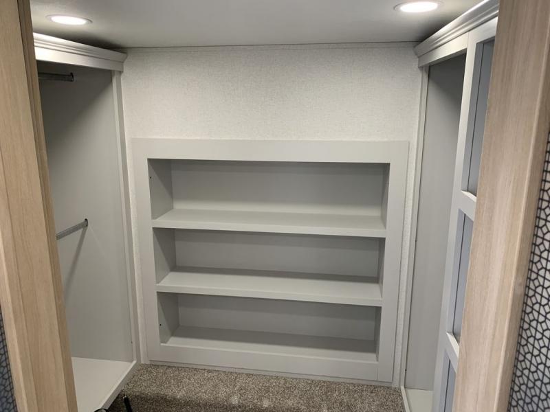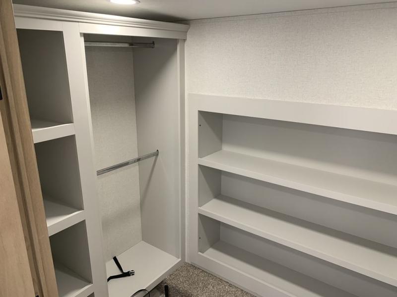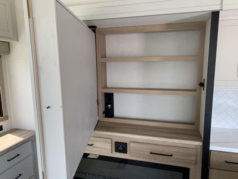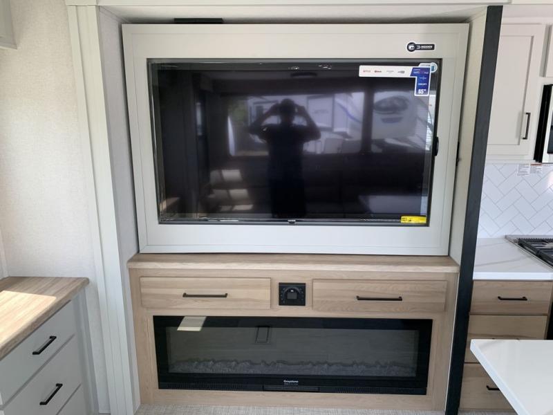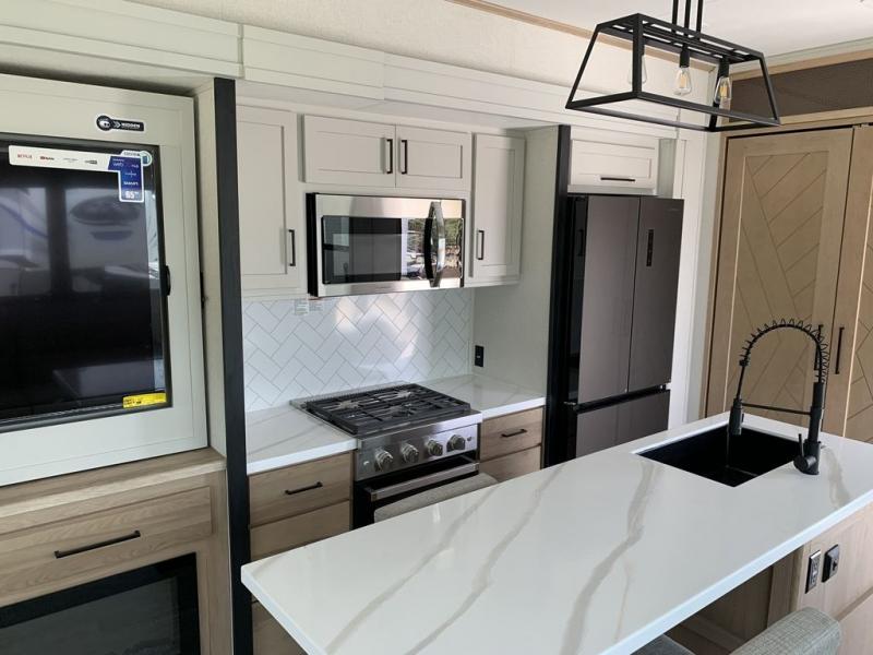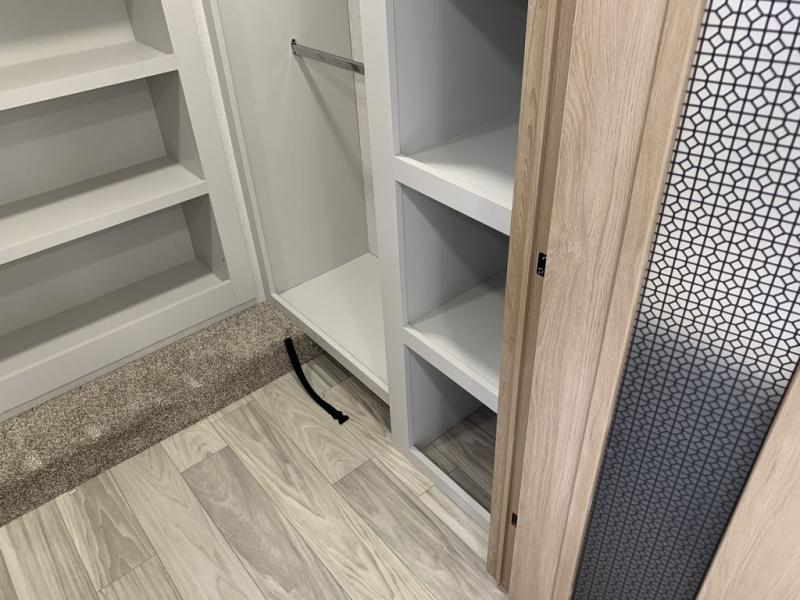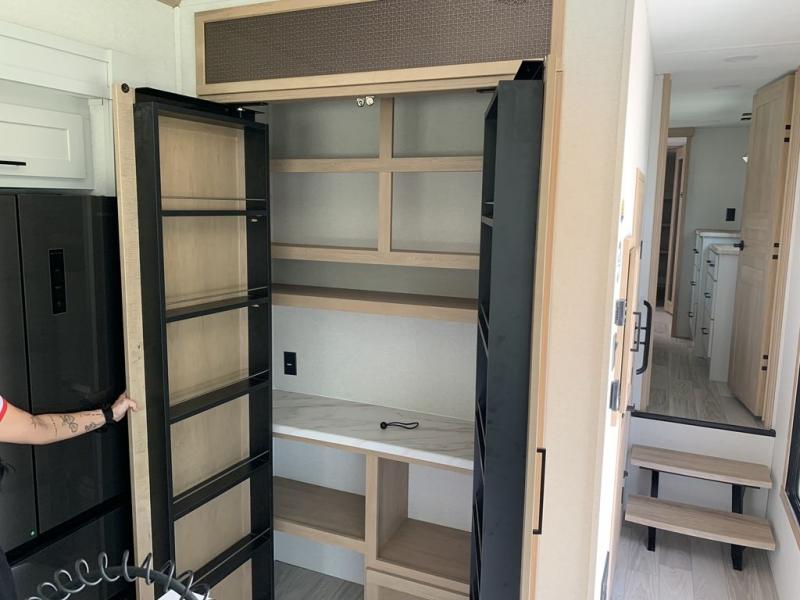 This fifth wheel is perfect for those seeking a comfortable, feature-rich home on wheels. Upon entering, you'll find a spacious rear living room, ideal for relaxation and entertainment. The room features a comfortable chaise lounge, sofa, and an entertainment center with a cozy fireplace. For added convenience, there's a hidden pantry, desk with a chair, and a shelf and cabinet for storage. The kitchen is well-appointed with a stylish kitchen island featuring a beautiful waterfall edge. Overhead cabinets provide ample storage, while the microwave and 12V refrigerator allow for easy meal prep. Plus, a butler pantry offers additional storage for kitchen essentials. A convenient half bath is located nearby, complete with a stackable washer and dryer prep if you want the option to add these appliances. The bedroom retreat features a comfortable king bed, a small dresser, and a tall dresser with a TV hookup. The adjacent walk-in bathroom closet boasts a one-piece fiberglass shower, dual sink, medicine cabinet, linen closet, and ample storage thanks to the various shelves, perfect for keeping your belongings organized. Exterior features include two awnings, one 12’ and the other 18’, providing ample shade and protection.
