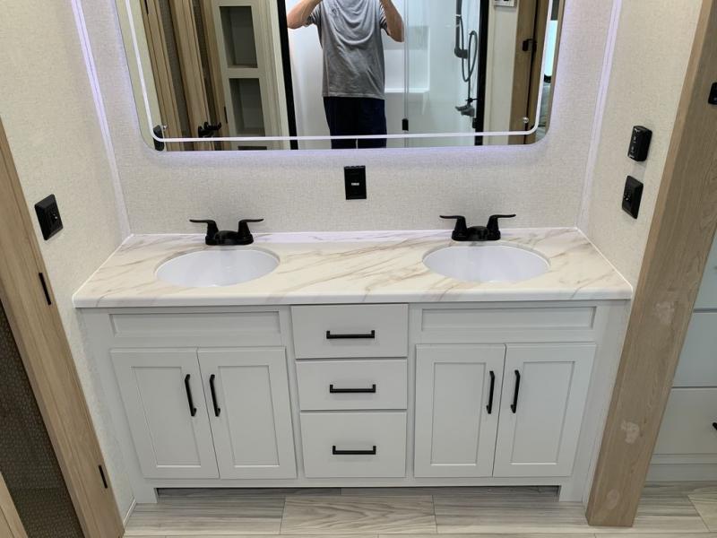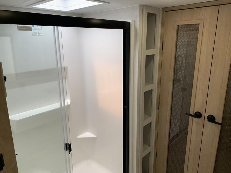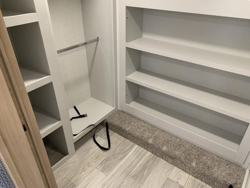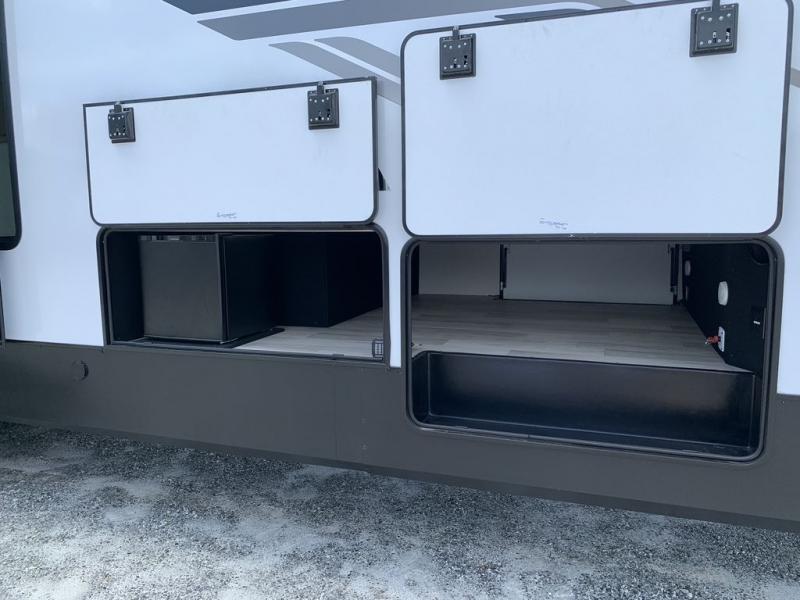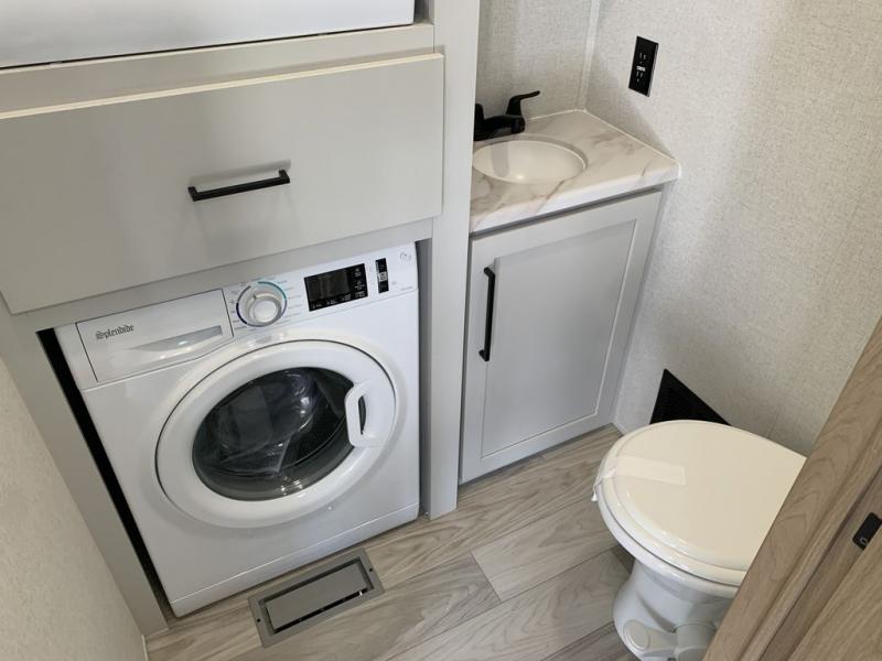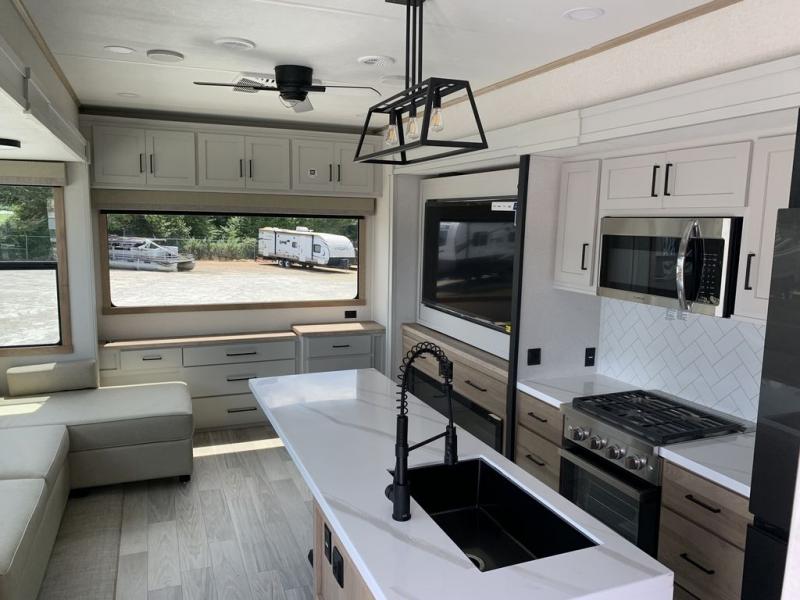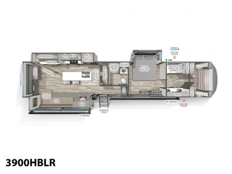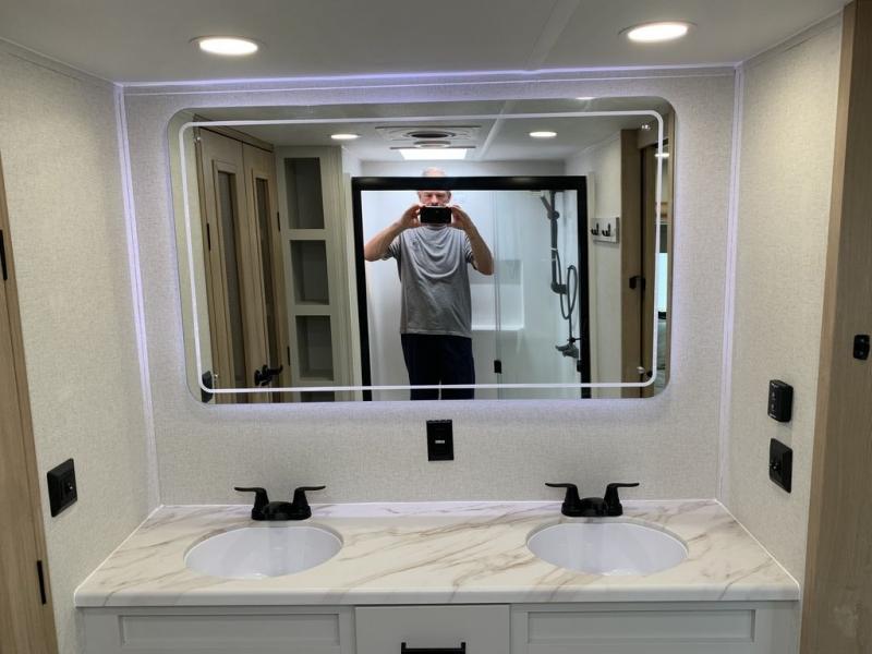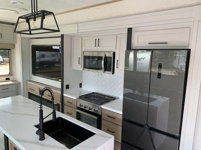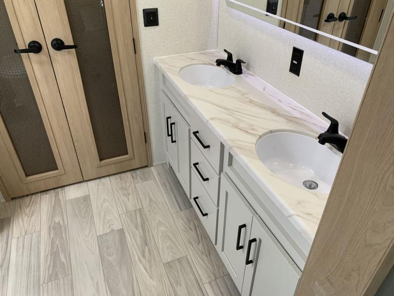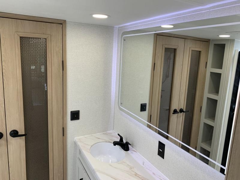 This fifth wheel is perfect for those seeking a comfortable, feature-rich home on wheels. Upon entering, you'll find a spacious rear living room, ideal for relaxation and entertainment. The room features a comfortable chaise lounge, sofa, and an entertainment center with a cozy fireplace. For added convenience, there's a hidden pantry, desk with a chair, and a shelf and cabinet for storage. The kitchen is well-appointed with a stylish kitchen island featuring a beautiful waterfall edge. Overhead cabinets provide ample storage, while the microwave and 12V refrigerator allow for easy meal prep. Plus, a butler pantry offers additional storage for kitchen essentials. A convenient half bath is located nearby, complete with a stackable washer and dryer prep if you want the option to add these appliances. The bedroom retreat features a comfortable king bed, a small dresser, and a tall dresser with a TV hookup. The adjacent walk-in bathroom closet boasts a one-piece fiberglass shower, dual sink, medicine cabinet, linen closet, and ample storage thanks to the various shelves, perfect for keeping your belongings organized. Exterior features include two awnings, one 12’ and the other 18’, providing ample shade and protection.