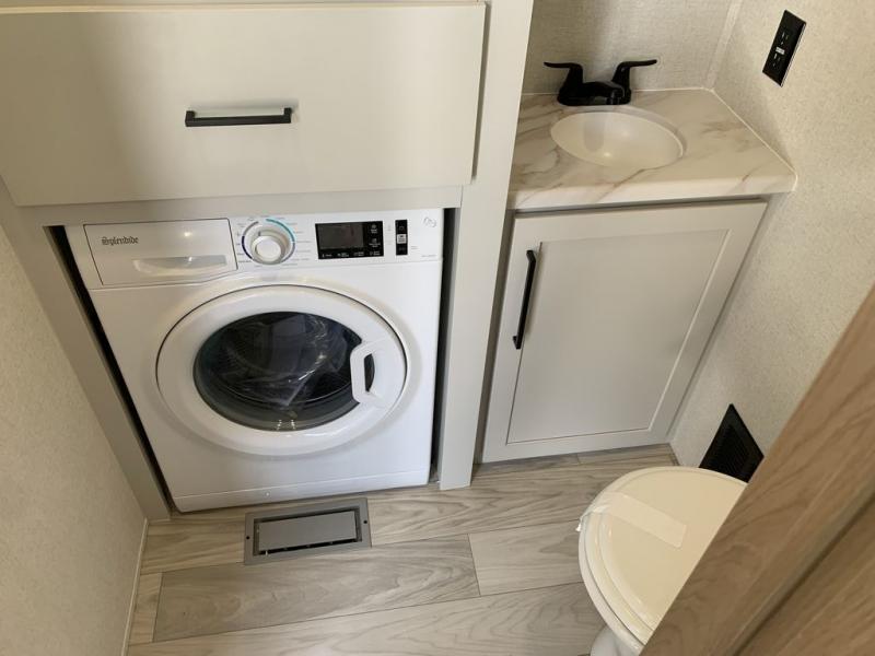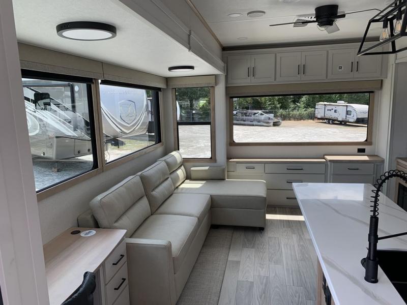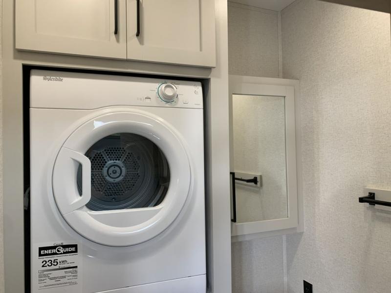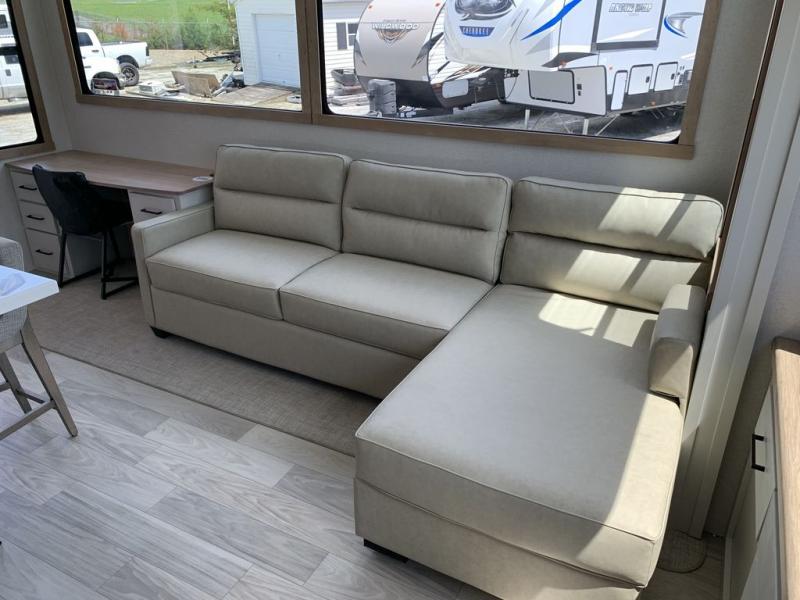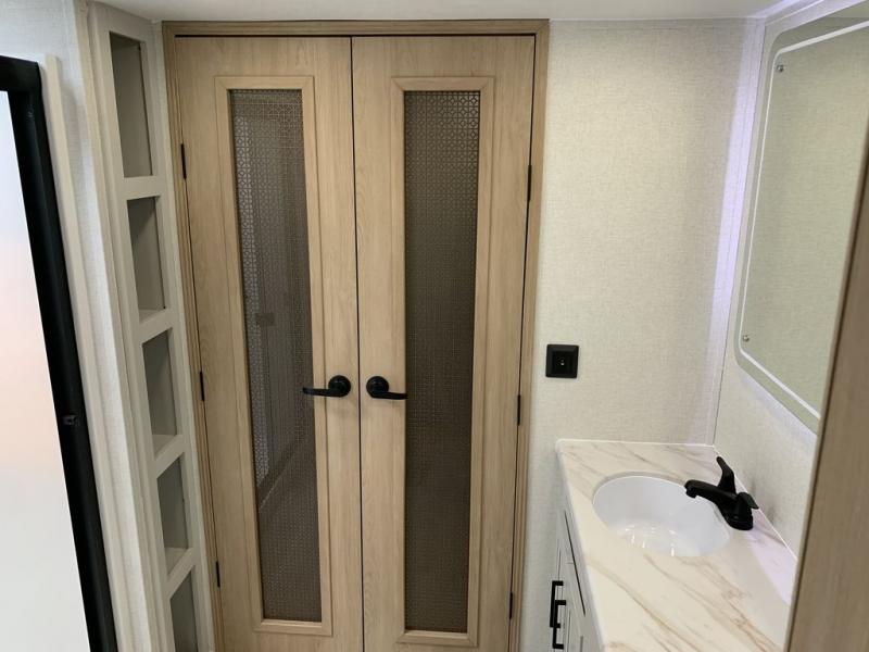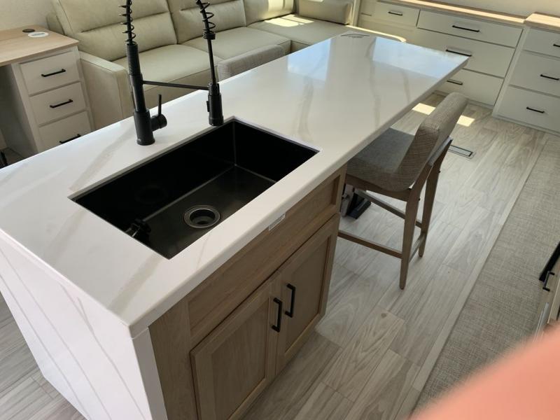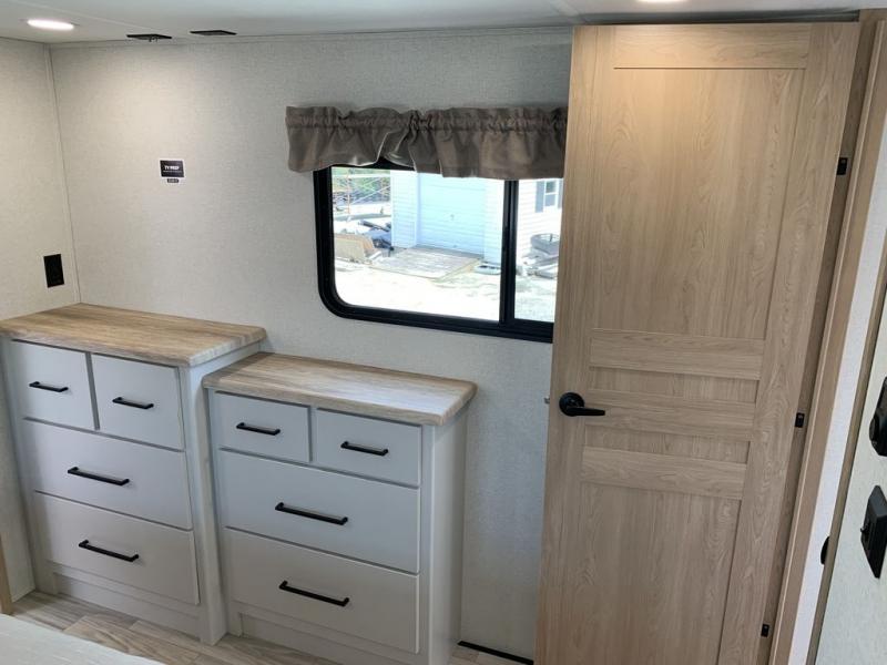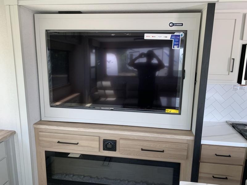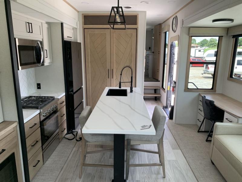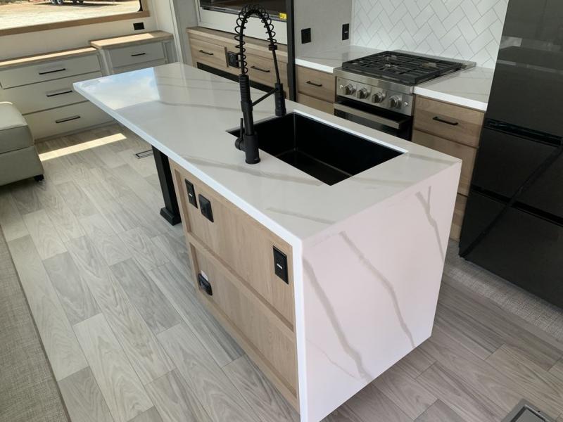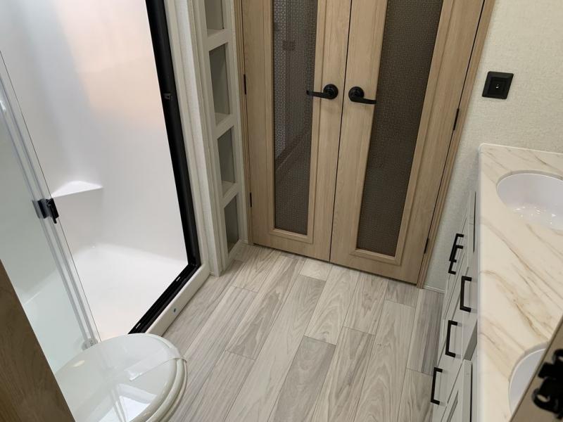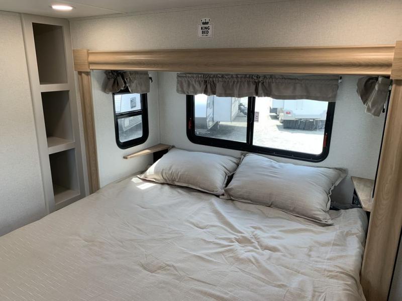 This fifth wheel is perfect for those seeking a comfortable, feature-rich home on wheels. Upon entering, you'll find a spacious rear living room, ideal for relaxation and entertainment. The room features a comfortable chaise lounge, sofa, and an entertainment center with a cozy fireplace. For added convenience, there's a hidden pantry, desk with a chair, and a shelf and cabinet for storage. The kitchen is well-appointed with a stylish kitchen island featuring a beautiful waterfall edge. Overhead cabinets provide ample storage, while the microwave and 12V refrigerator allow for easy meal prep. Plus, a butler pantry offers additional storage for kitchen essentials. A convenient half bath is located nearby, complete with a stackable washer and dryer prep if you want the option to add these appliances. The bedroom retreat features a comfortable king bed, a small dresser, and a tall dresser with a TV hookup. The adjacent walk-in bathroom closet boasts a one-piece fiberglass shower, dual sink, medicine cabinet, linen closet, and ample storage thanks to the various shelves, perfect for keeping your belongings organized. Exterior features include two awnings, one 12’ and the other 18’, providing ample shade and protection.
