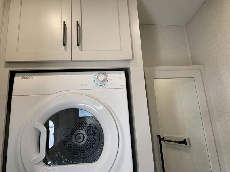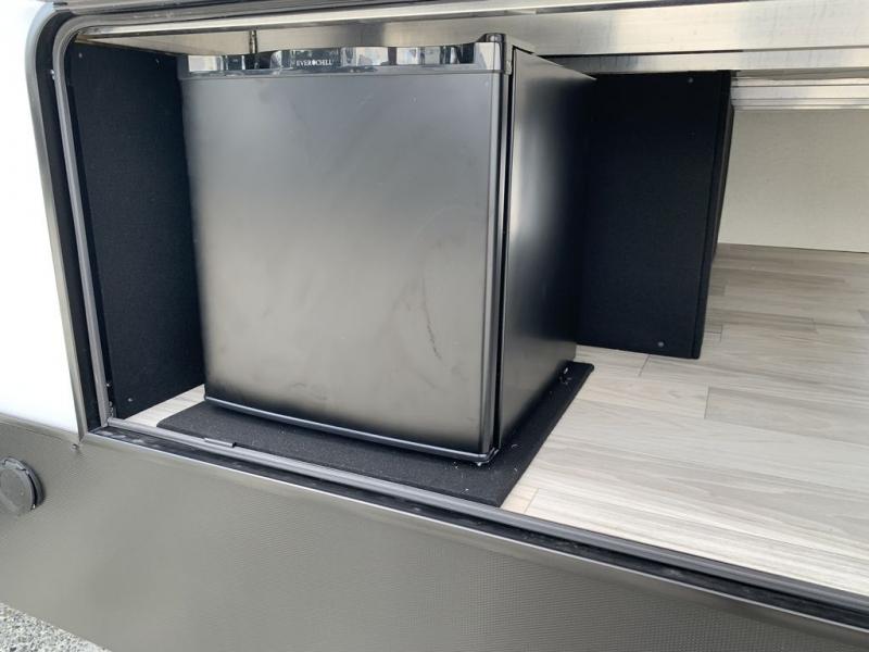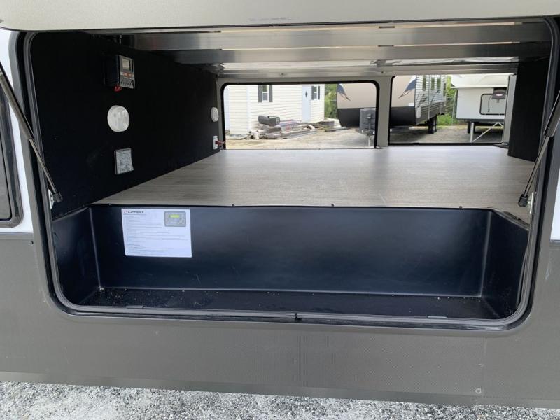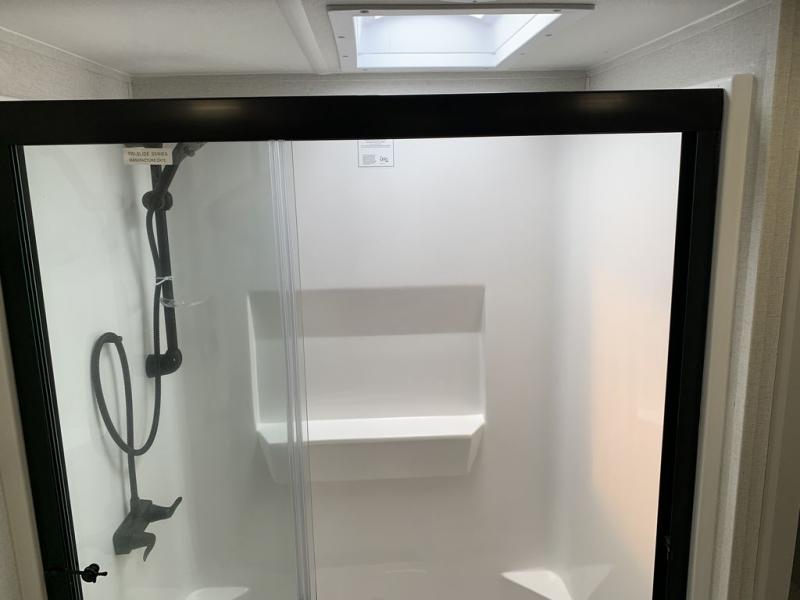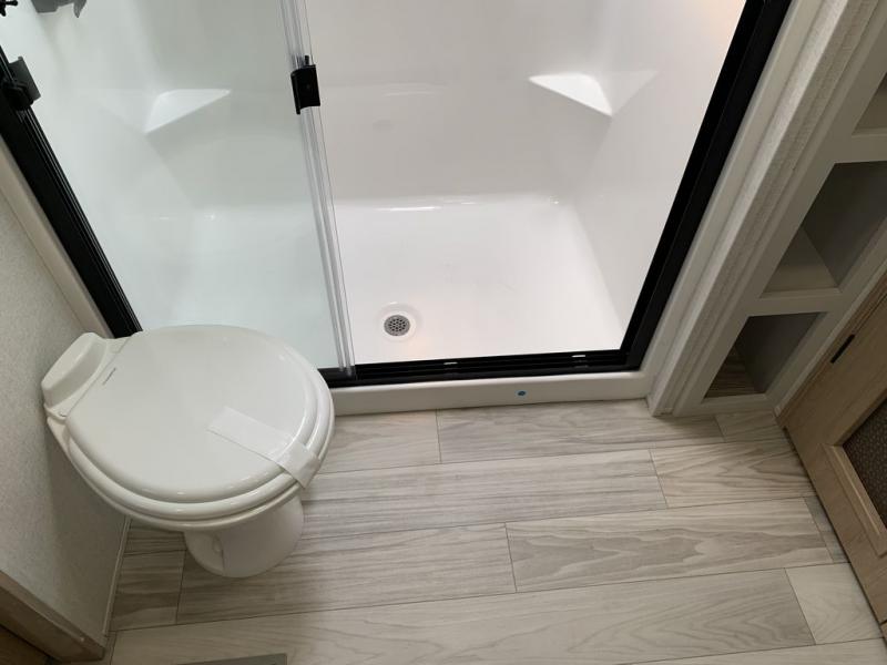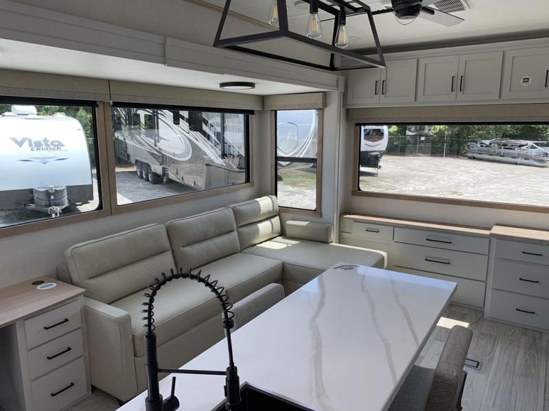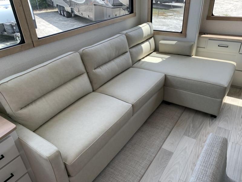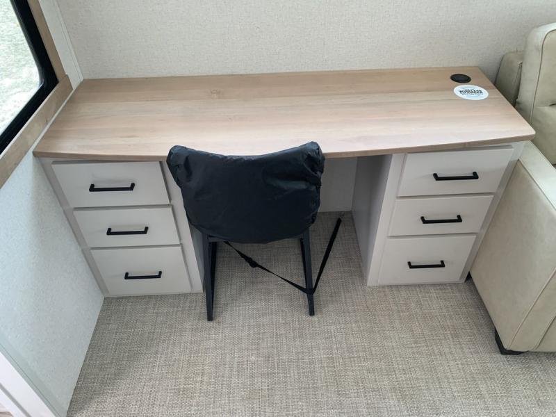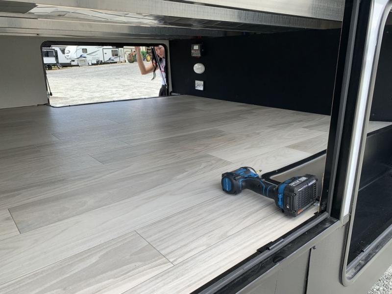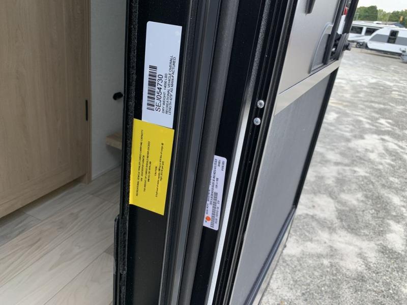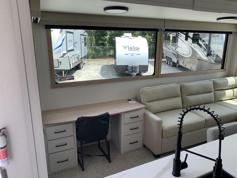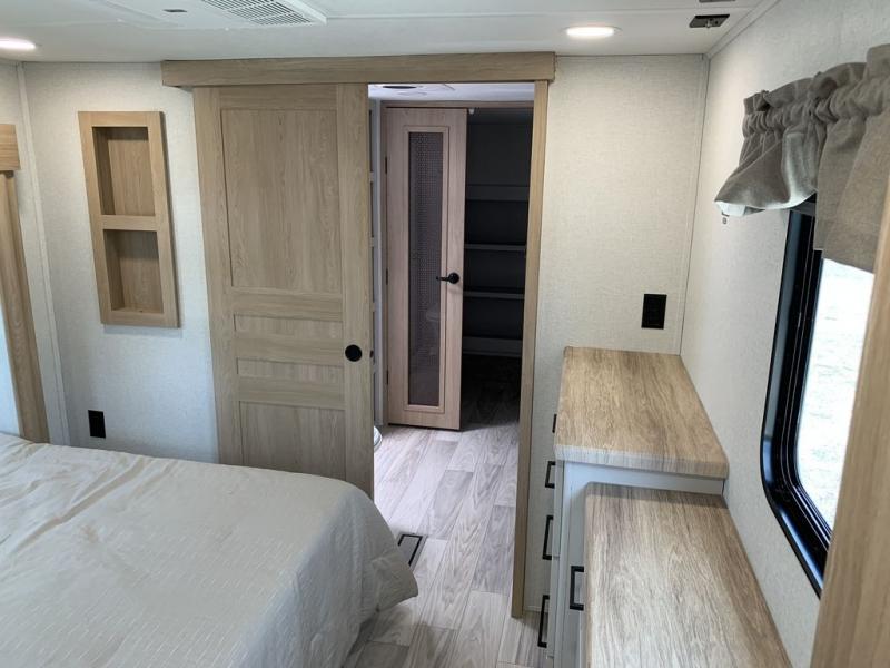 This fifth wheel is perfect for those seeking a comfortable, feature-rich home on wheels. Upon entering, you'll find a spacious rear living room, ideal for relaxation and entertainment. The room features a comfortable chaise lounge, sofa, and an entertainment center with a cozy fireplace. For added convenience, there's a hidden pantry, desk with a chair, and a shelf and cabinet for storage. The kitchen is well-appointed with a stylish kitchen island featuring a beautiful waterfall edge. Overhead cabinets provide ample storage, while the microwave and 12V refrigerator allow for easy meal prep. Plus, a butler pantry offers additional storage for kitchen essentials. A convenient half bath is located nearby, complete with a stackable washer and dryer prep if you want the option to add these appliances. The bedroom retreat features a comfortable king bed, a small dresser, and a tall dresser with a TV hookup. The adjacent walk-in bathroom closet boasts a one-piece fiberglass shower, dual sink, medicine cabinet, linen closet, and ample storage thanks to the various shelves, perfect for keeping your belongings organized. Exterior features include two awnings, one 12’ and the other 18’, providing ample shade and protection.
