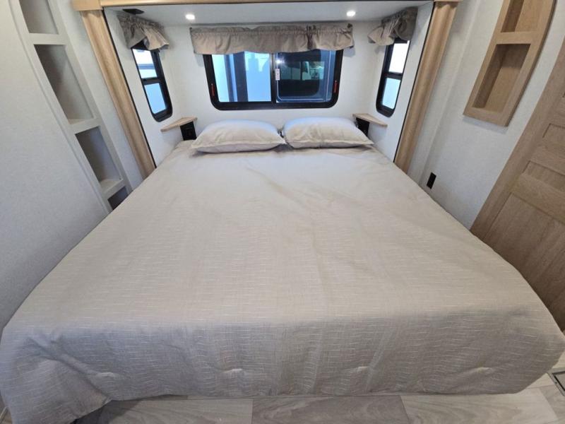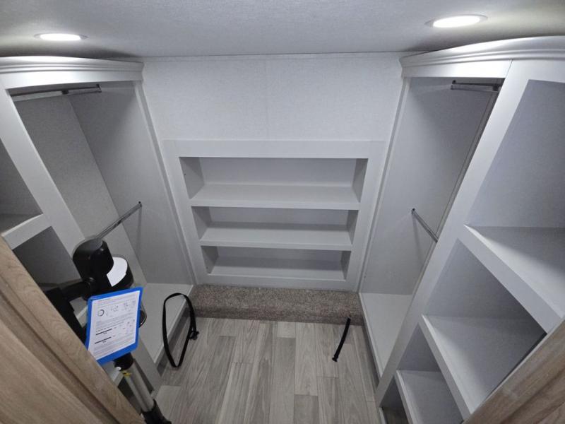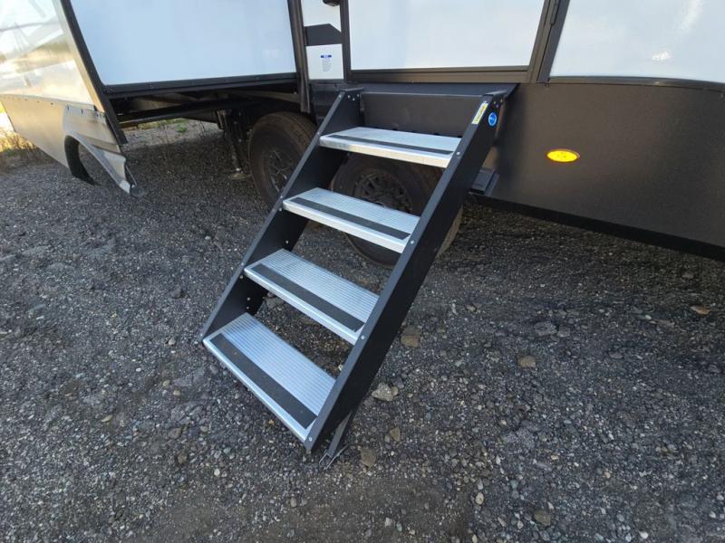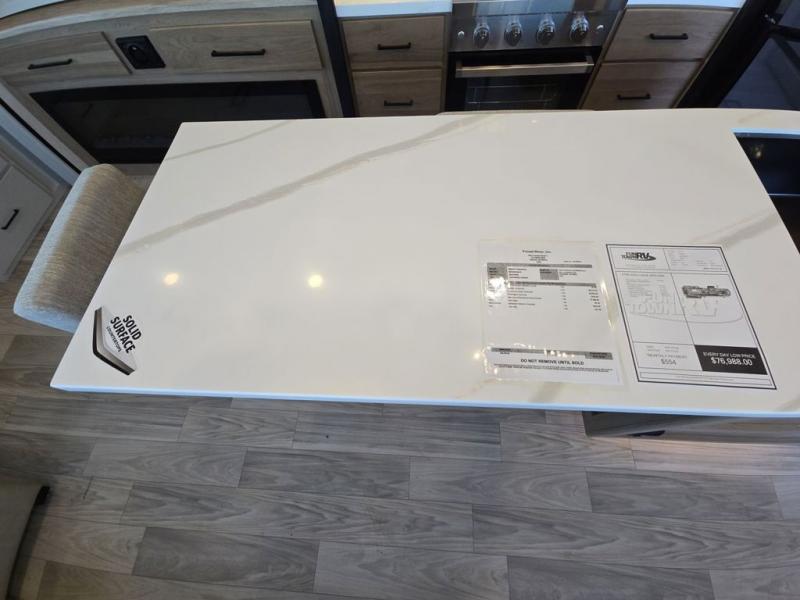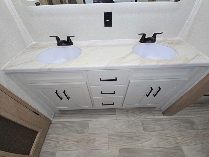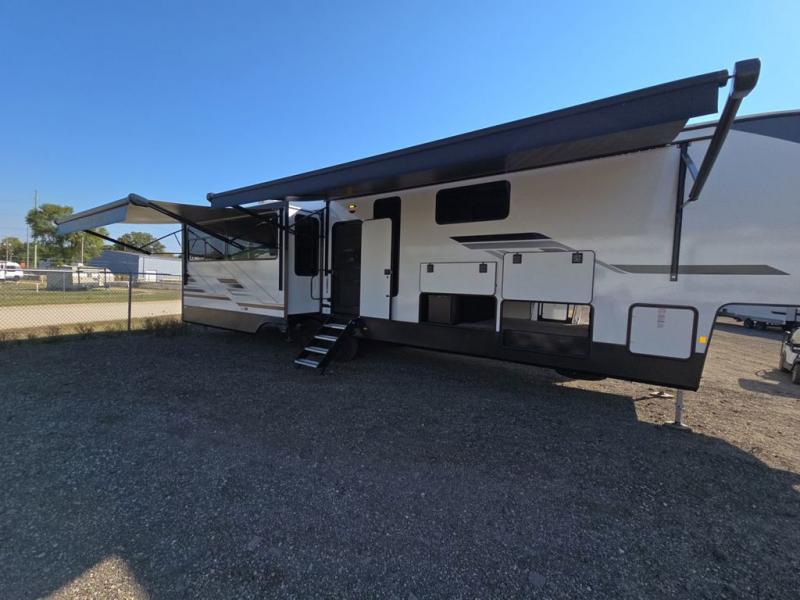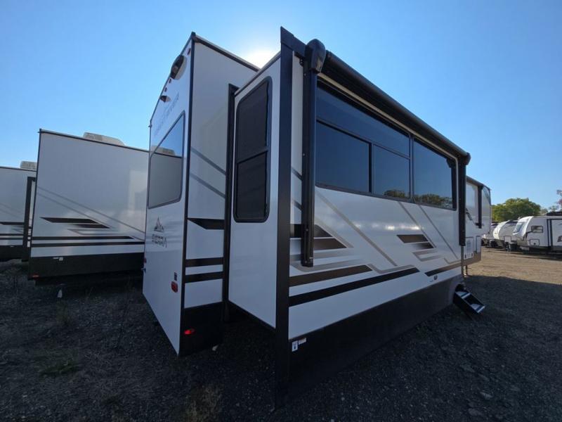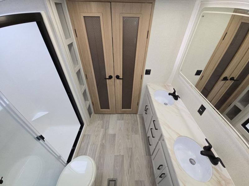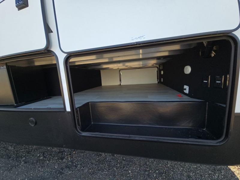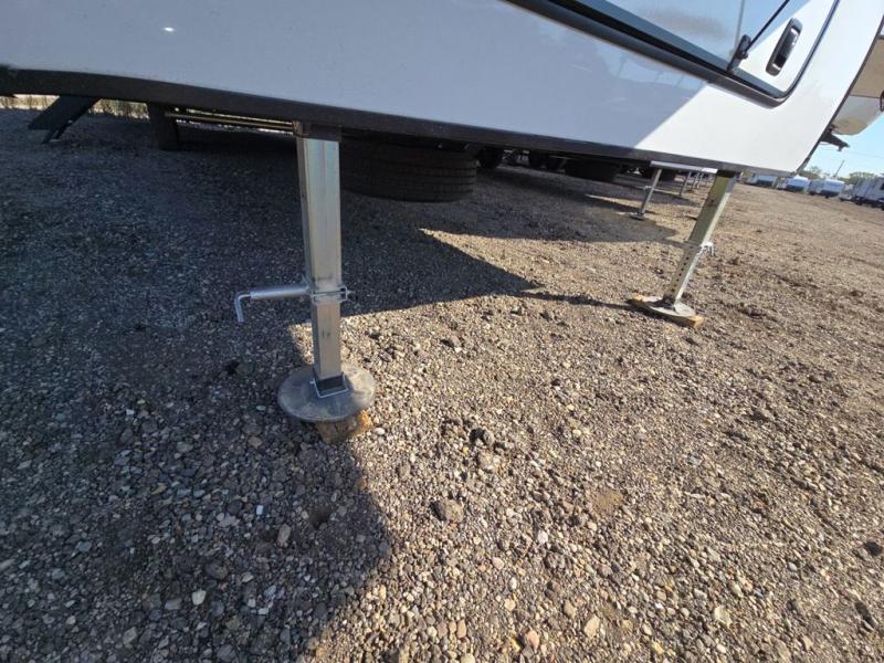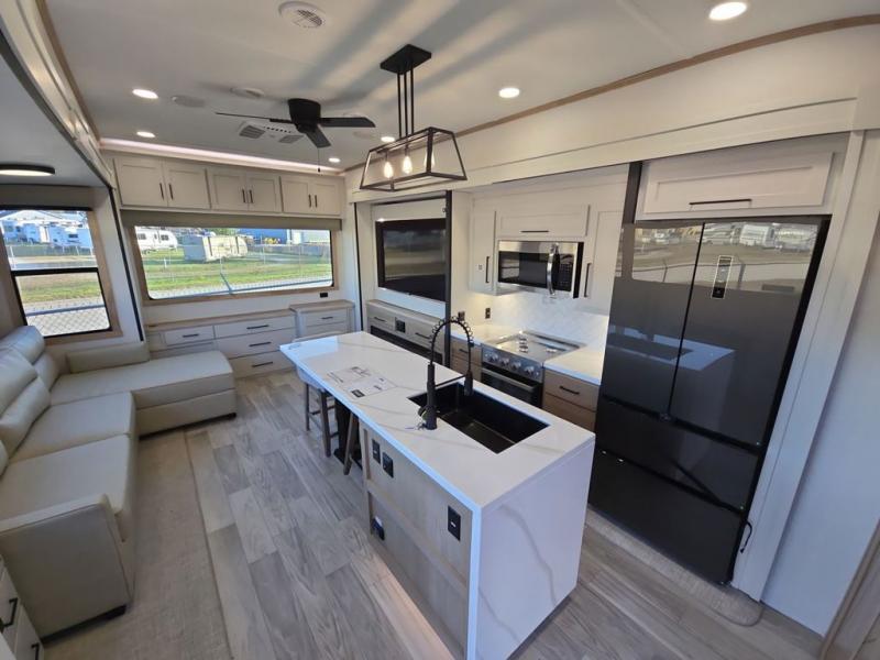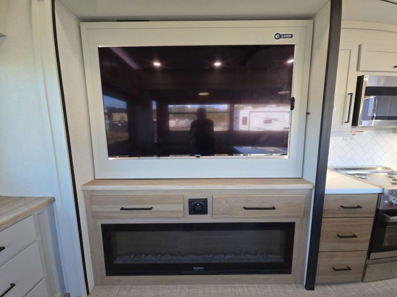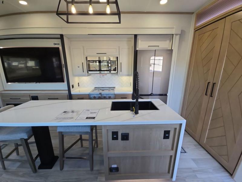 This fifth wheel is perfect for those seeking a comfortable, feature-rich home on wheels. Upon entering, you'll find a spacious rear living room, ideal for relaxation and entertainment. The room features a comfortable chase lounge, sofa, and an entertainment center with a cozy fireplace. For added convenience, there's a hidden pantry, desk with a chair, and a shelf and cabinet for storage. The kitchen is well-appointed with a stylish kitchen island featuring a beautiful waterfall edge. Overhead cabinets provide ample storage, while the microwave, 12V refrigerator, and four-burner cooktop make meal preparation a breeze. Plus, a butler pantry offers additional storage for kitchen essentials. A convenient half bath is located nearby, complete with a stackable washer and dryer prep if you want the option to add these appliances. The bedroom retreat features a comfortable king bed, a small dresser, and a tall dresser with a TV hookup. The adjacent walk-in bathroom closet boasts a one-piece fiberglass shower with a seat, dual sink, medicine cabinet, linen closet, and ample storage thanks to the various shelves, perfect for keeping your belongings organized. Exterior features include two awnings, one 12’ and the other 18’, providing ample shade and protection.